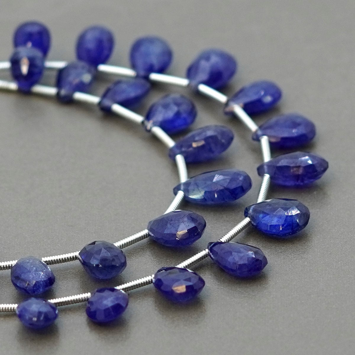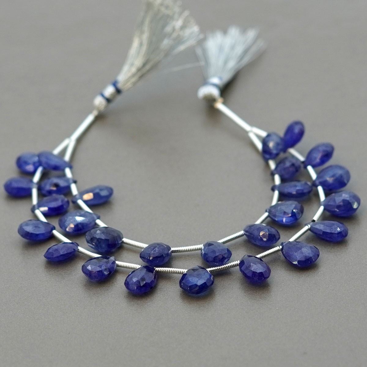 Buy This "AA+" Grade Side Drilled 7.5-12.5mm Briolette Pear Shape Natural Blue Sapphire (Glass Filled) Multi Strand Beads Layout. You Will Receive Approximately 27 Beads on 2 Strands of 5-6 Inch With a Total Weight of 77.75 Cts.. This Blue Sapphire Stone is Originated From Africa and Masterfully Handcrafted by The Experienced Artisans of Jaipur (India).