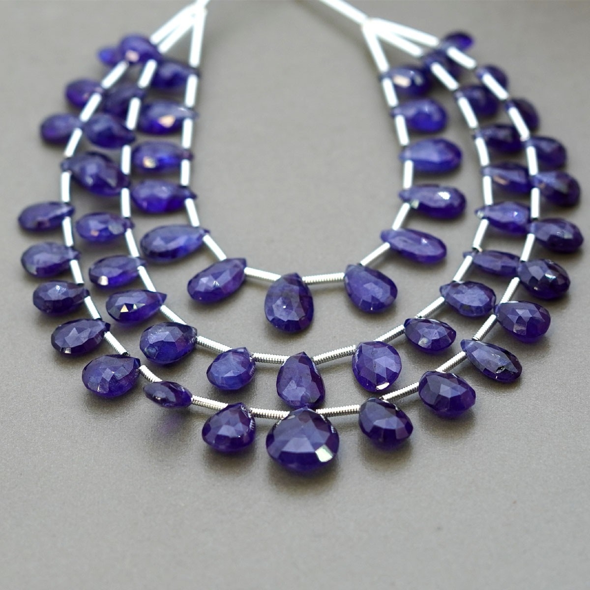 Buy This "AA+" Grade Side Drilled 7.5-14mm Briolette Pear Shape Natural Blue Sapphire (Glass Filled) Multi Strand Beads Layout. You Will Receive Approximately 55 Beads on 3 Strands of 5-8 Inch With a Total Weight of 145.65 Cts.. This Blue Sapphire Stone is Originated From Africa and Masterfully Handcrafted by The Experienced Artisans of Jaipur (India).