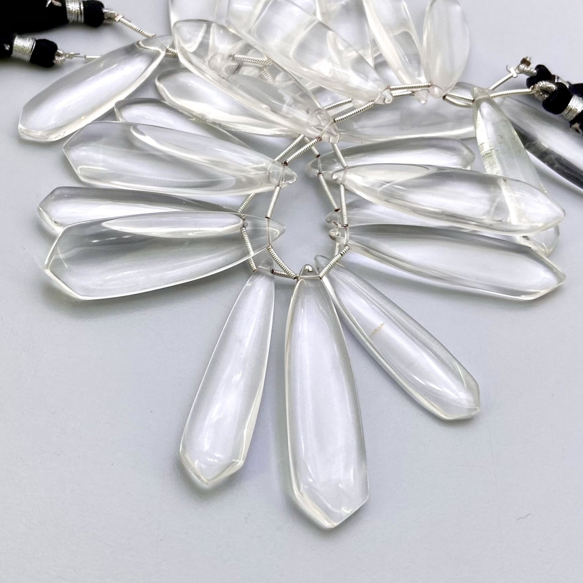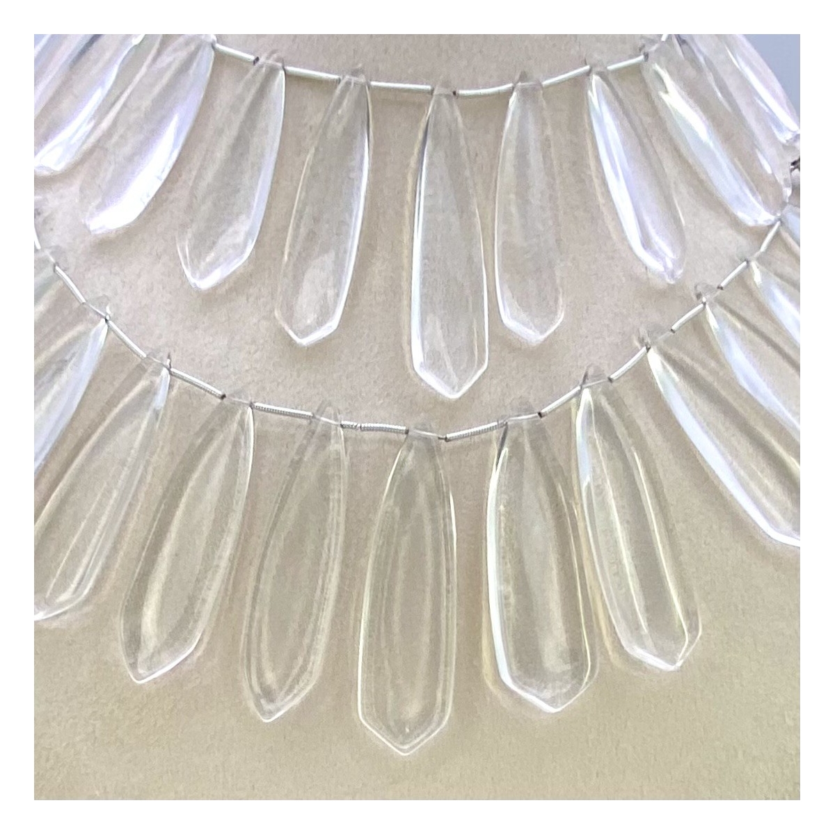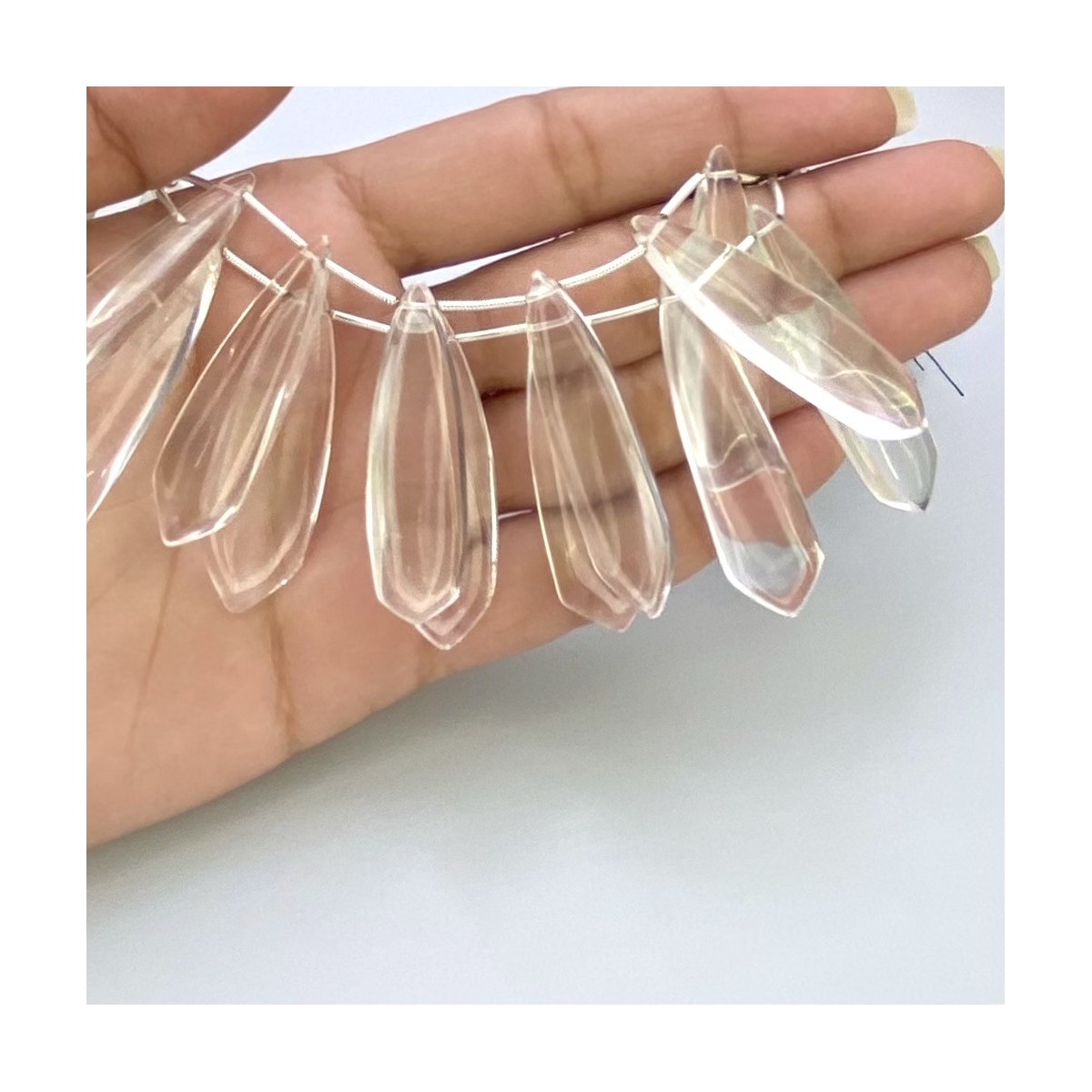 Buy This "AAA" Grade Side Drilled 39-54mm Smooth Fancy Shape Natural Crystal Quartz (Un-Treated) Gemstone Beads Lot. You Will Receive Approximately 26 Beads on 2 Strands of 8 Inch. With a Total Weight of 725 Cts.. This Crystal Quartz Stone is Originated From Brazil and Masterfully Handcrafted by The Experienced Artisans of Jaipur (India).