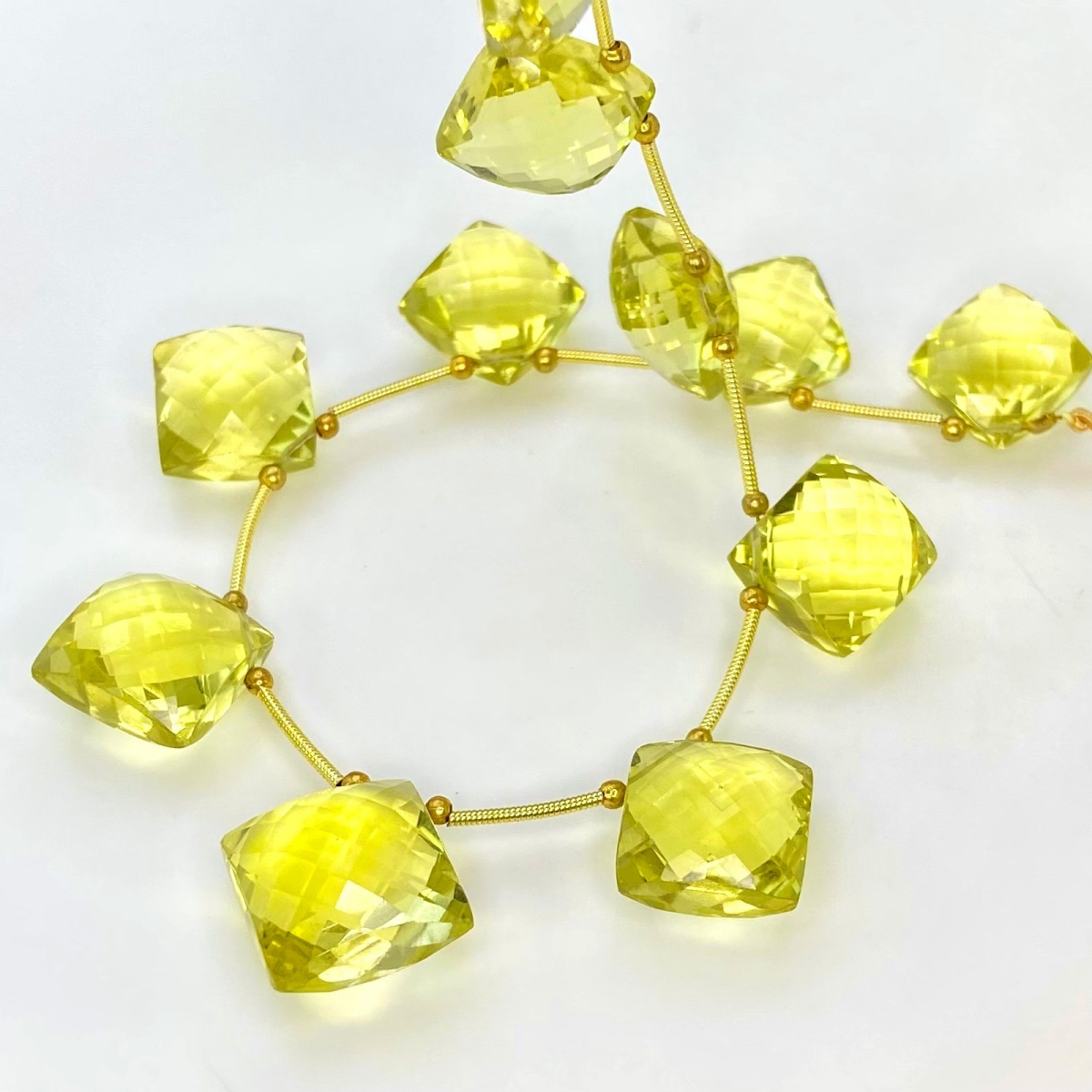 Buy This "AAA+" Grade Side Drilled 12.5-15.5mm Briolette Square Shape Natural Lemon Quartz (Heated) Gemstone Beads Layout. You Will Receive Approximately 11 Beads on 1 Strand of 9 Inch. With a Total Weight of 171.80 Cts.. This Lemon Quartz Stone is Originated From Brazil and Masterfully Handcrafted by The Experienced Artisans of Jaipur (India).