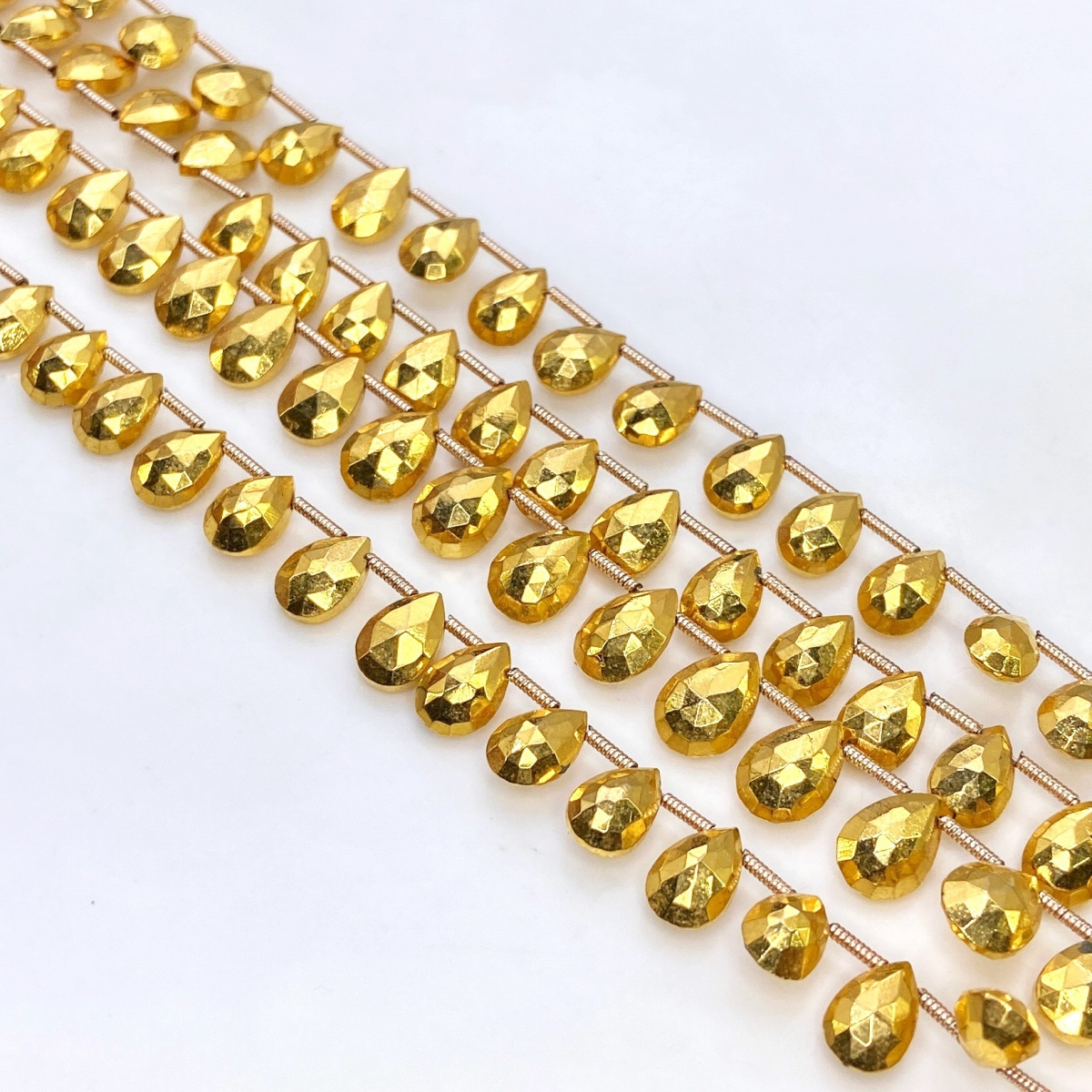 Buy This "AAA" Grade Side Drilled 8-10mm Briolette Pear Shape Natural Pyrite (Coated) Gemstone Beads Lot. You Will Receive Approximately 180 Beads on 7 Strands of 8 Inch. With a Total Weight of 610 Cts.. This Pyrite Stone is Originated From Russia and Masterfully Handcrafted by The Experienced Artisans of Jaipur (India).
