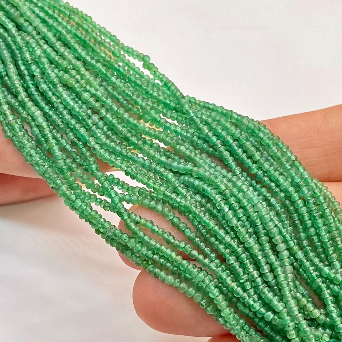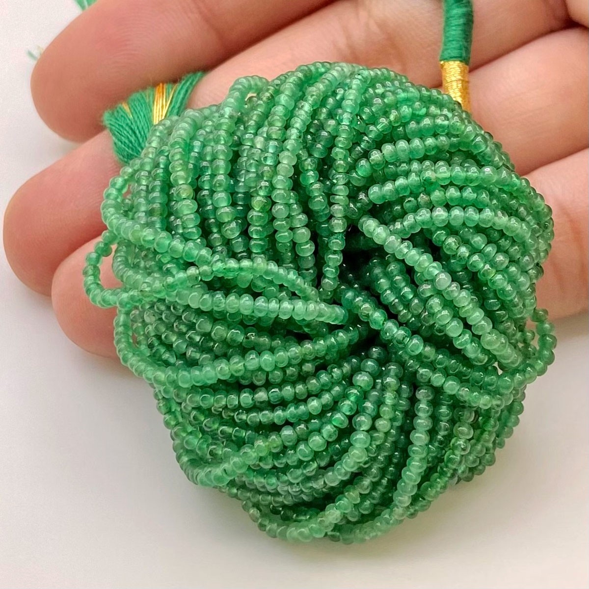Buy This "AA" Grade Center Drilled 2mm Smooth Rondelle Shape Natural Emerald (Un-Treated) Gemstone Beads Lot. You Will Receive Approximately 3300 Beads on 44 Strands of 4 Inch. With a Total Weight of 121.2 Cts.. This Emerald Stone is Originated From Zambia and Masterfully Handcrafted by The Experienced Artisans of Jaipur (India).
