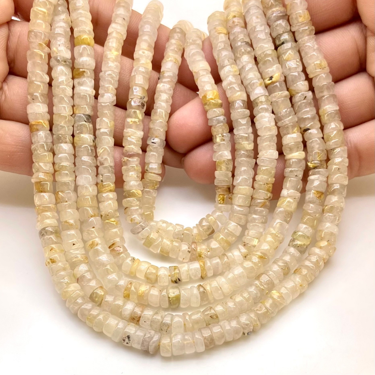Buy This "A" Grade Center Drilled 5.5-6mm Smooth Wheel Shape Natural Golden Rutile (Un-Treated) Gemstone Beads Lot. You Will Receive Approximately 710 Beads on 6 Strands of 13 Inch. With a Total Weight of 610 Cts.. This Golden Rutile Stone is Originated From Brazil and Masterfully Handcrafted by The Experienced Artisans of Jaipur (India).
