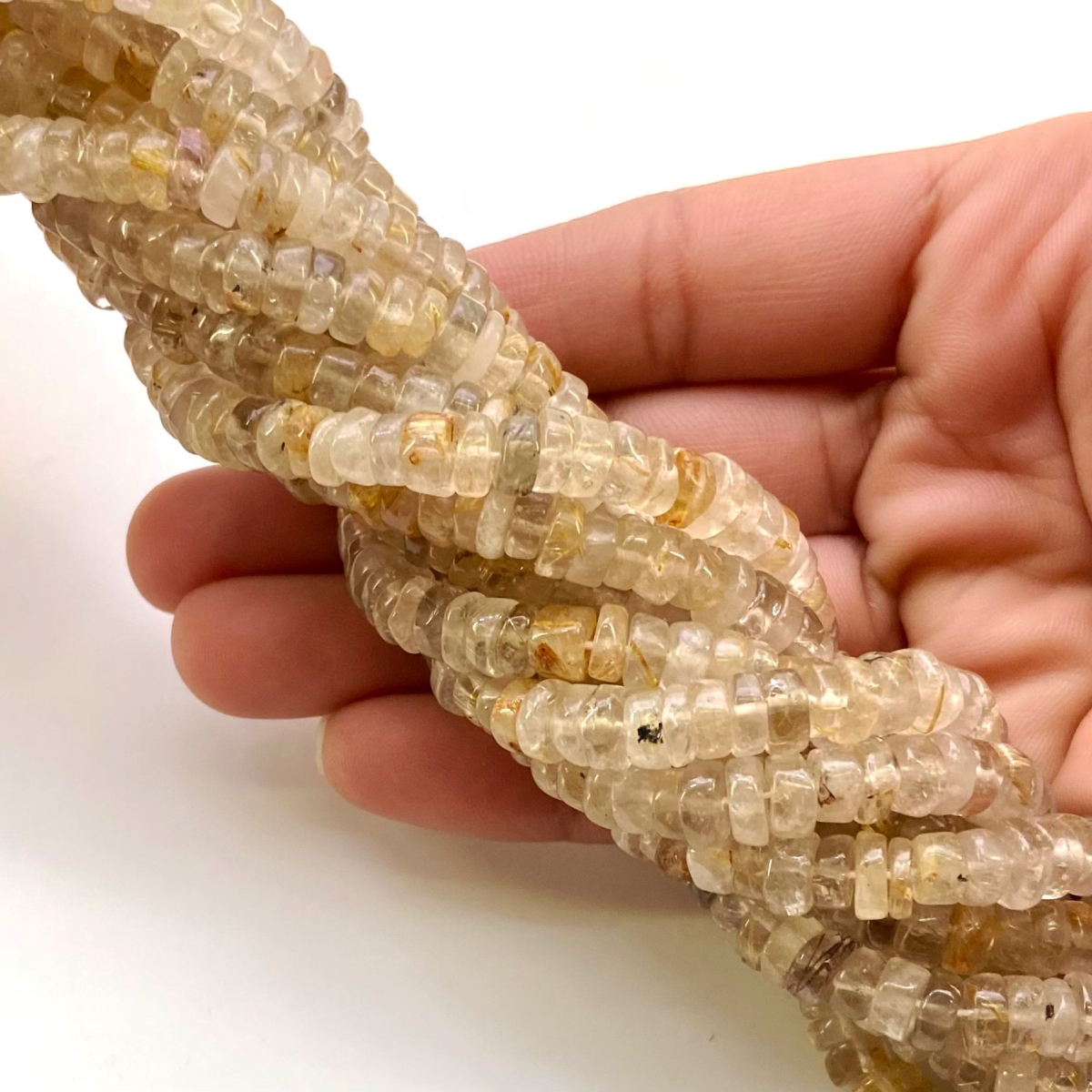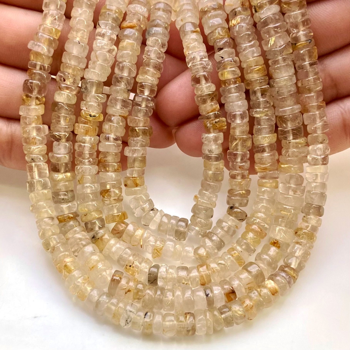 Buy This "AA" Grade Center Drilled 6.5-7mm Smooth Wheel Shape Natural Golden Rutile (Un-Treated) Gemstone Beads Lot. You Will Receive Approximately 1265 Beads on 11 Strands of 13 Inch. With a Total Weight of 1360 Cts.. This Golden Rutile Stone is Originated From Brazil and Masterfully Handcrafted by The Experienced Artisans of Jaipur (India).