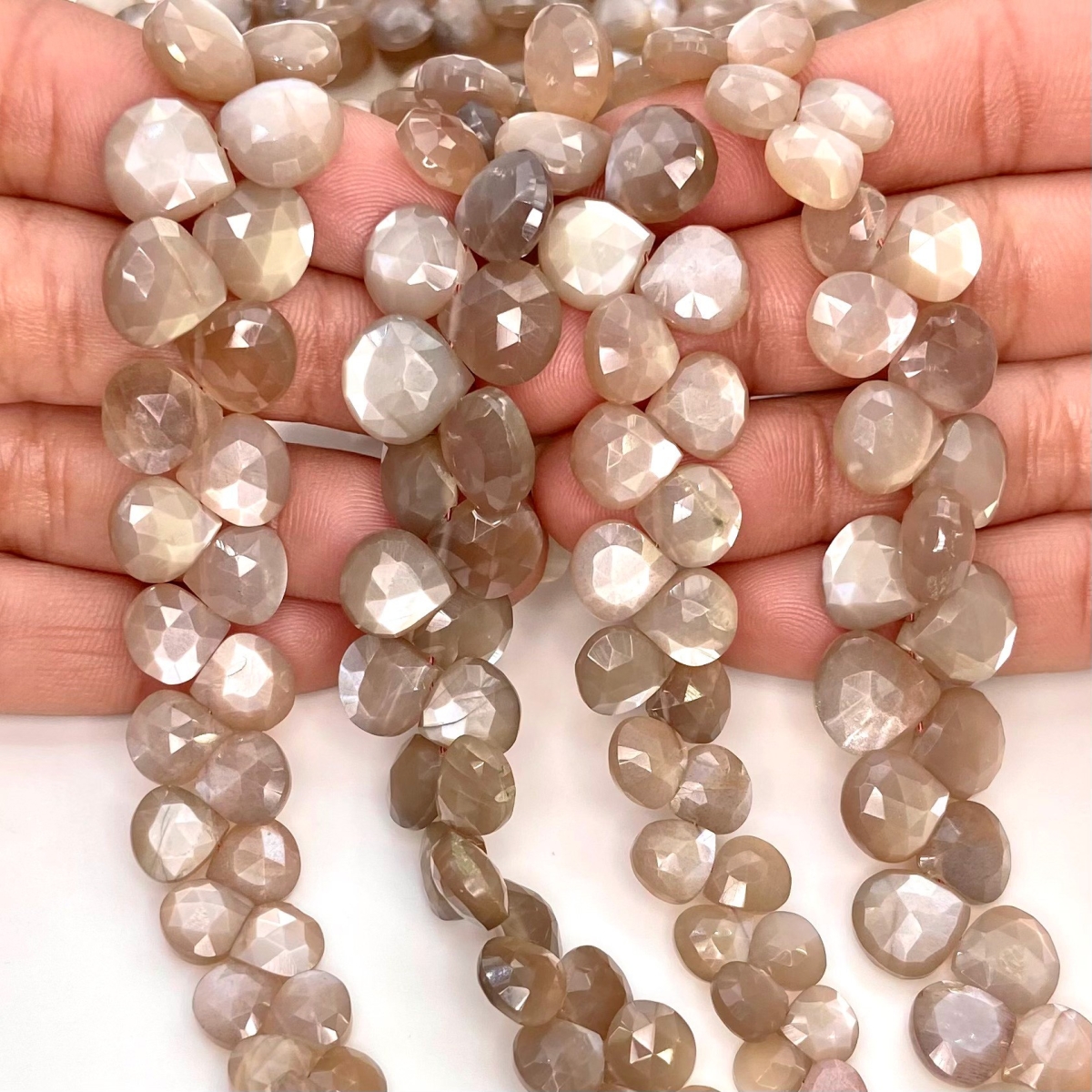 Buy This "AA+" Grade Side Drilled 6-10mm Briolette Heart Shape Natural Grey Moonstone (Un-Treated) Gemstone Beads Lot. You Will Receive Approximately 215 Beads on 5 Strands of 8 Inch. With a Total Weight of 535 Cts.. This Grey Moonstone Stone is Originated From India and Masterfully Handcrafted by The Experienced Artisans of Jaipur (India).