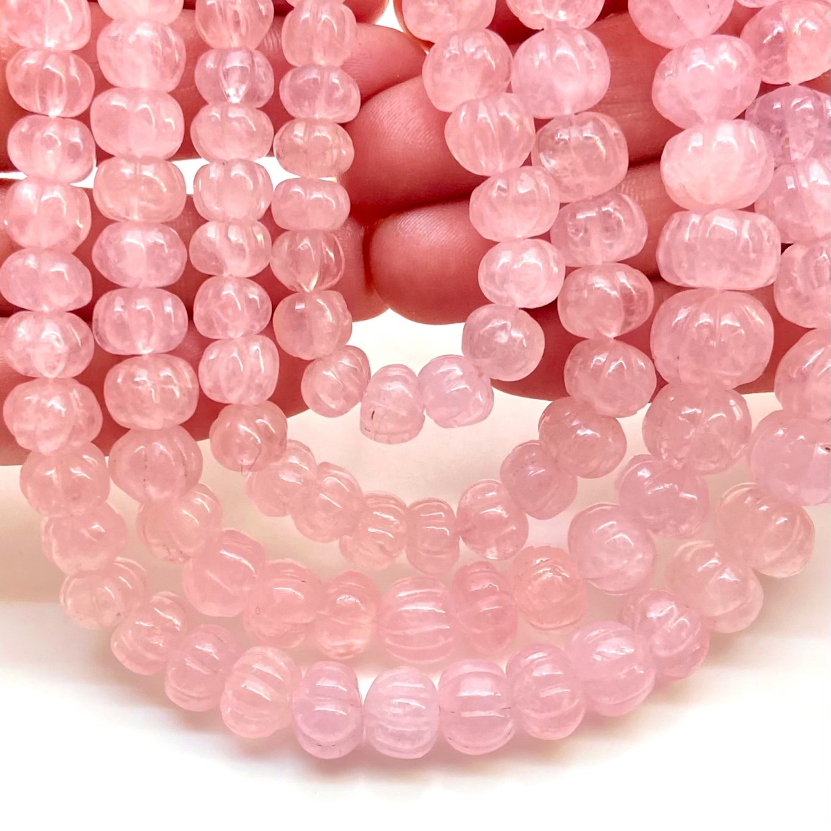 Buy This "AA" Grade Center Drilled 7-13mm Carved Melon Shape Natural Morganite (Heated) Gemstone Beads Strand. You Will Receive Approximately 59 Beads on 1 Strand of 16 Inch. With a Total Weight of 270 Cts.. This Morganite Stone is Originated From Brazil and Masterfully Handcrafted by The Experienced Artisans of Jaipur (India).