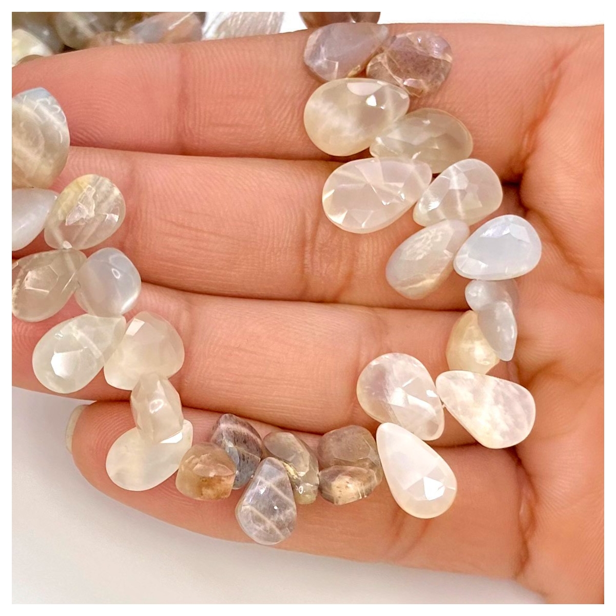 Buy This "A" Grade Center Drilled 9-13mm Briolette Pear Shape Natural Multi Moonstone (Un-Treated) Gemstone Beads Lot. You Will Receive Approximately 1225 Beads on 5 Strands of 7 Inch. With a Total Weight of 450 Cts.. This Multi Moonstone Stone is Originated From India and Masterfully Handcrafted by The Experienced Artisans of Jaipur (India).