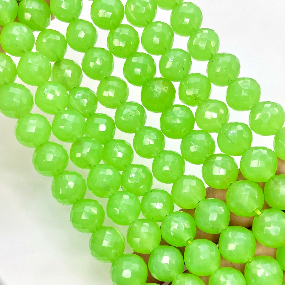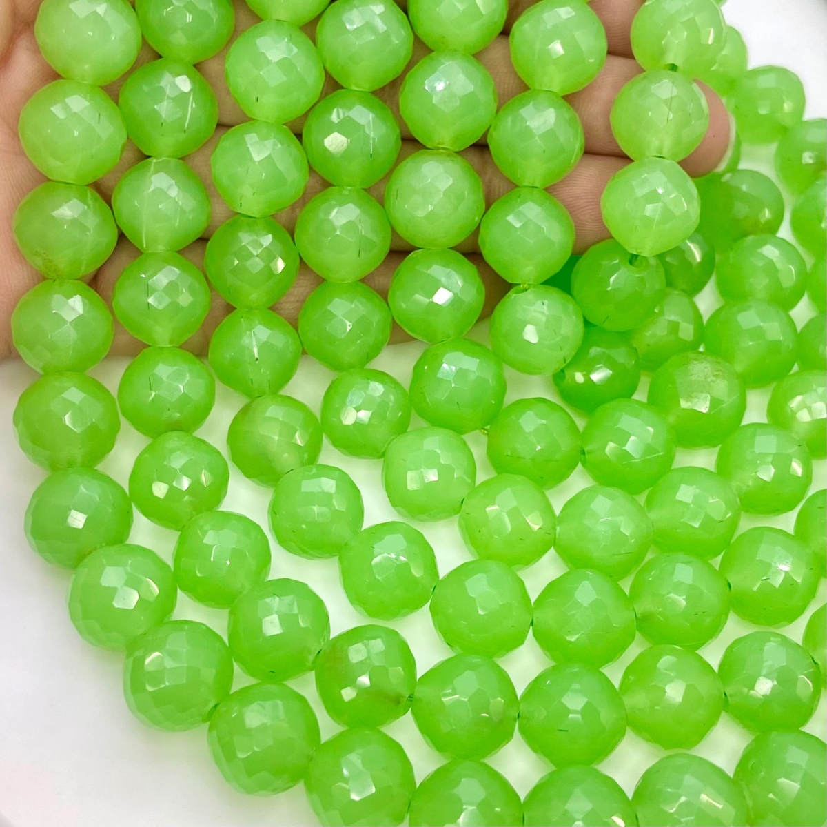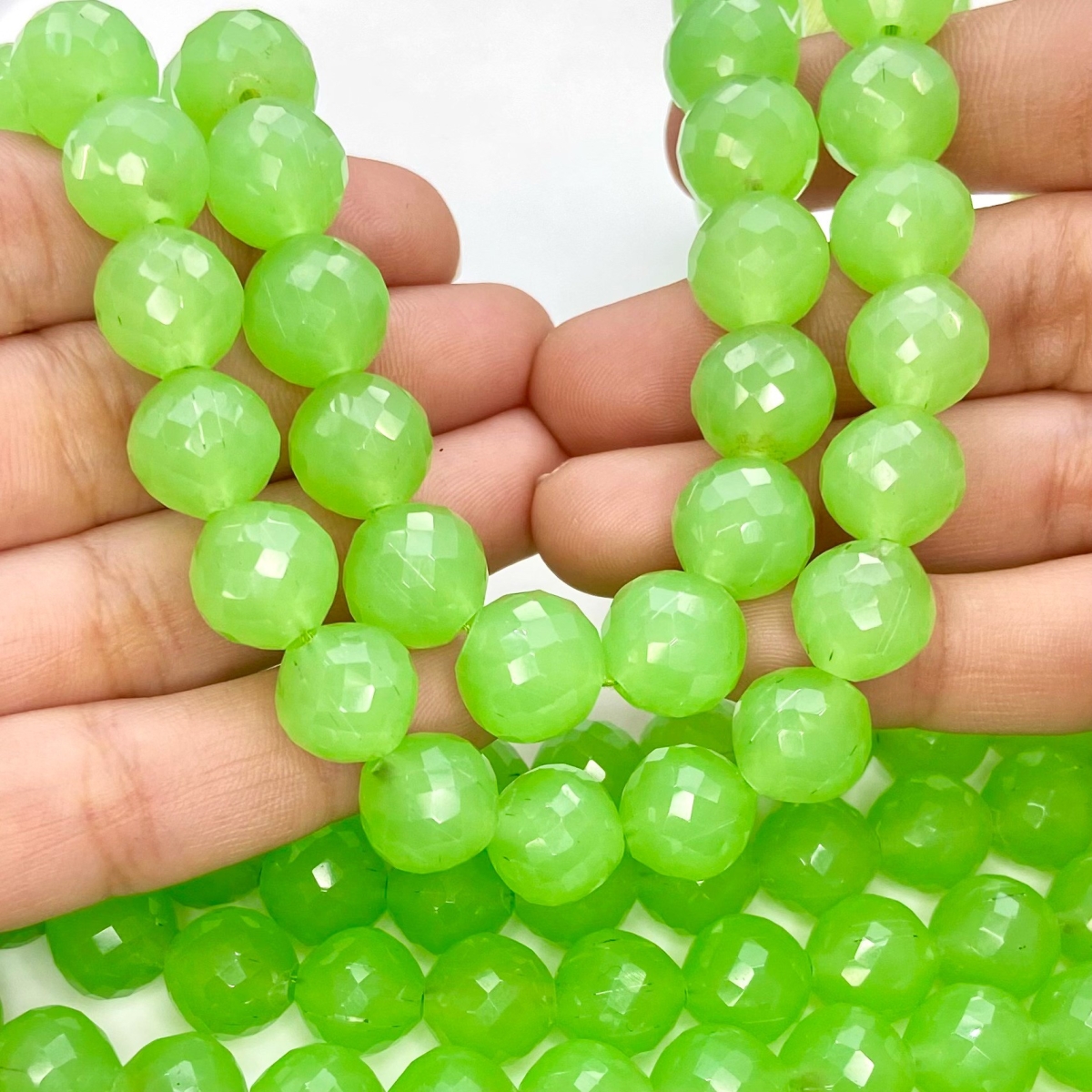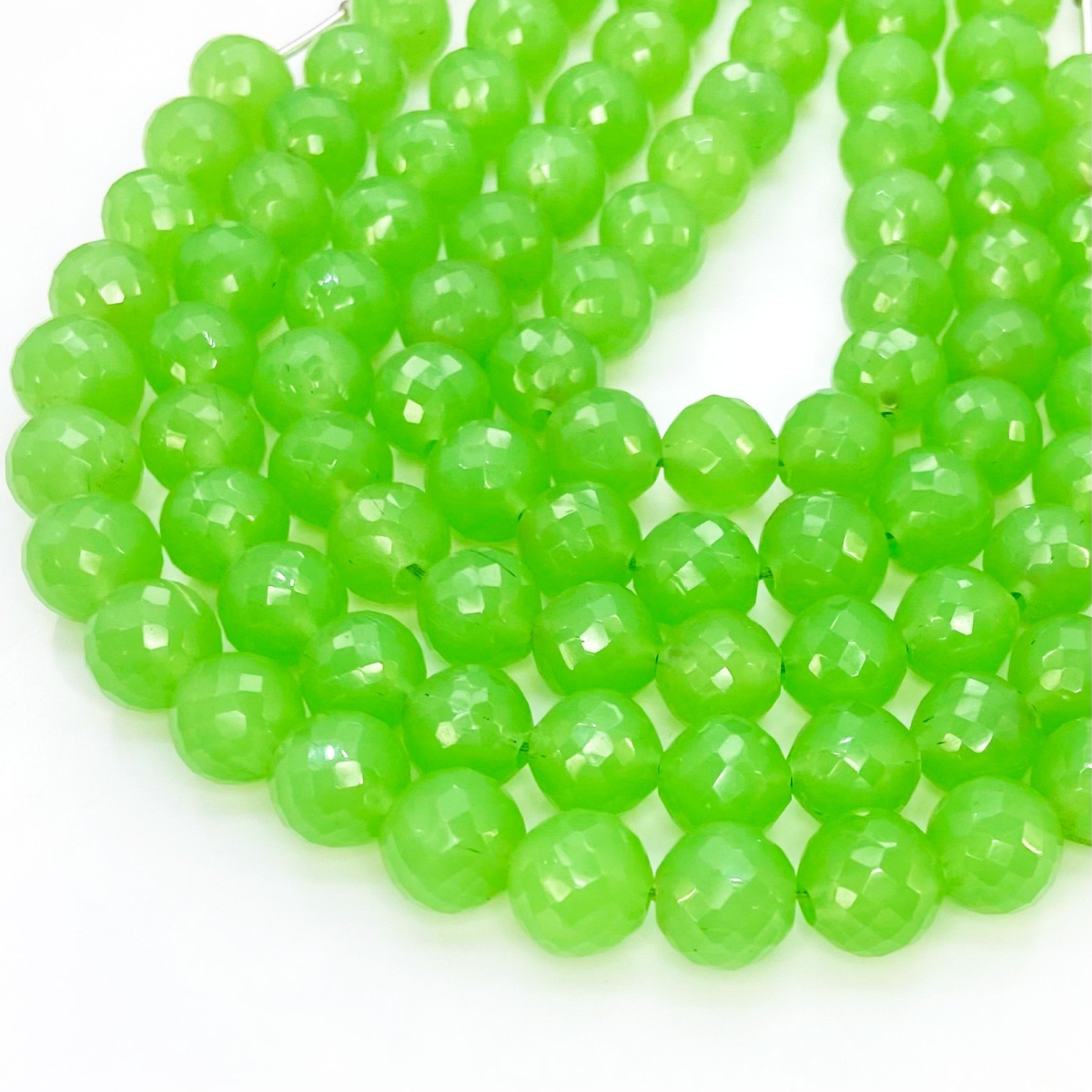 Buy This "AAA" Grade Center Drilled 11mm Faceted Round Shape Natural Green Chalcedony (Dyed) Gemstone Beads Strand. You Will Receive Approximately 22 Beads on 1 Strand of 10 Inch. With a Total Weight of 210 Cts.. This Green Chalcedony Stone is Originated From India and Masterfully Handcrafted by The Experienced Artisans of Jaipur (India).