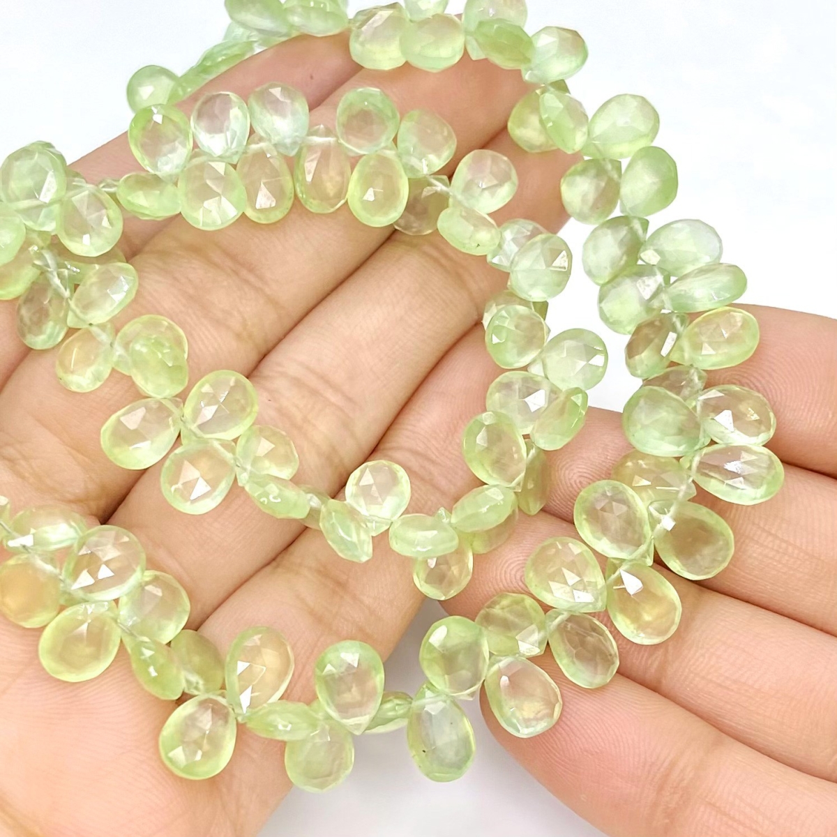 Buy This "AAA" Grade Side Drilled 8-10mm Briolette Pear Shape Natural Prehnite (Un-Treated) Gemstone Beads Strand. You Will Receive Approximately 65 Beads on 1 Strand of 8 Inch. With a Total Weight of 95 Cts.. This Prehnite Stone is Originated From Africa and Masterfully Handcrafted by The Experienced Artisans of Jaipur (India).