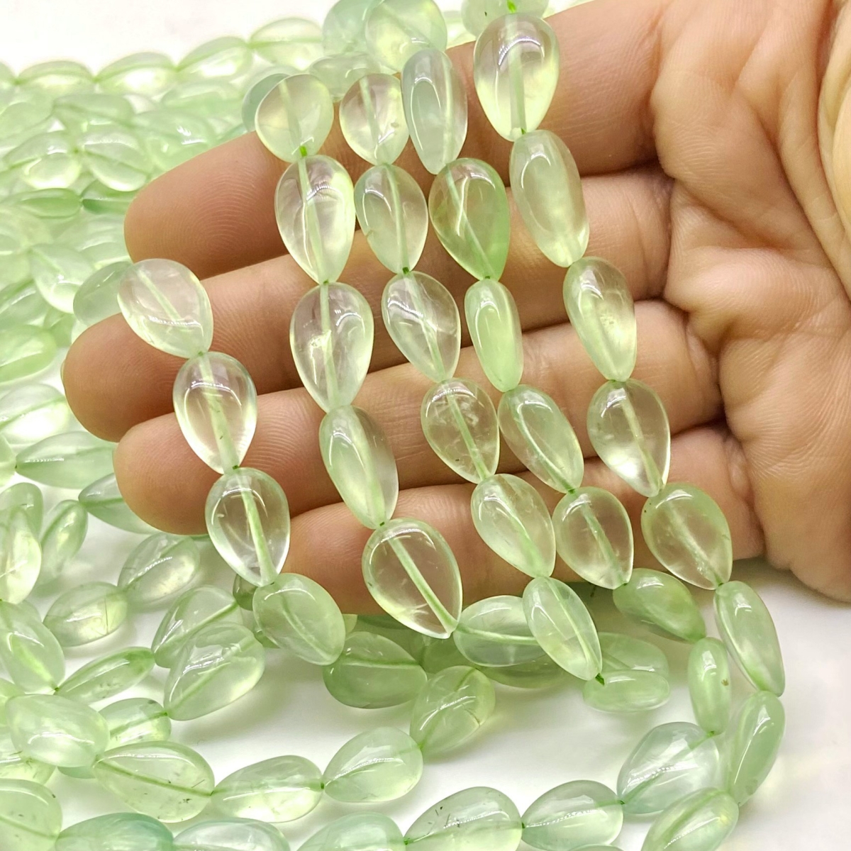 Buy This "A+" Grade Top Drilled 10-18mm Smooth Pear Shape Natural Prehnite (Un-Treated) Gemstone Beads Strand. You Will Receive Approximately 30 Beads on 1 Strand of 14 Inch. With a Total Weight of 125 Cts.. This Prehnite Stone is Originated From Africa and Masterfully Handcrafted by The Experienced Artisans of Jaipur (India).