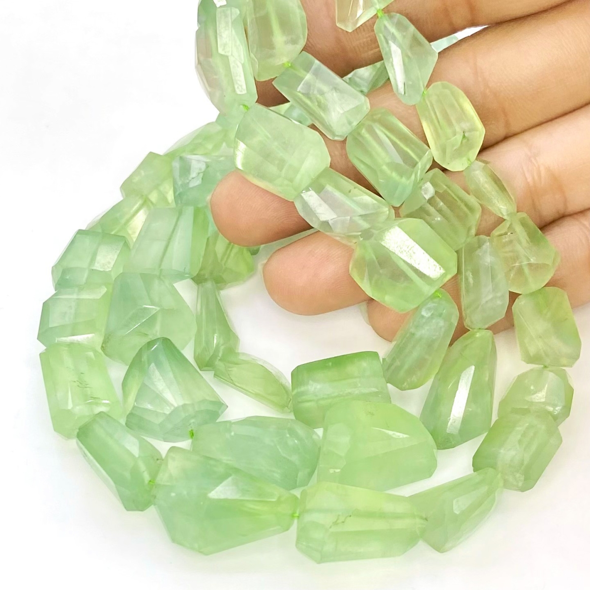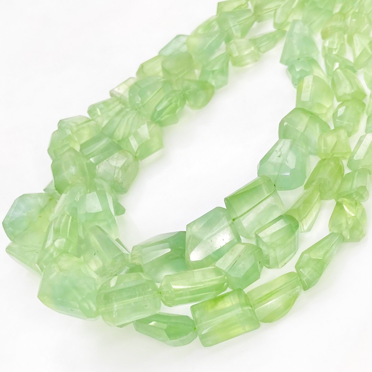 Buy This "AA+" Grade Center Drilled 8-21mm Step Cut Nugget Shape Natural Prehnite (Un-Treated) Gemstone Beads Strand. You Will Receive Approximately 34 Beads on 1 Strand of 16 Inch. With a Total Weight of 280 Cts.. This Prehnite Stone is Originated From Africa and Masterfully Handcrafted by The Experienced Artisans of Jaipur (India).