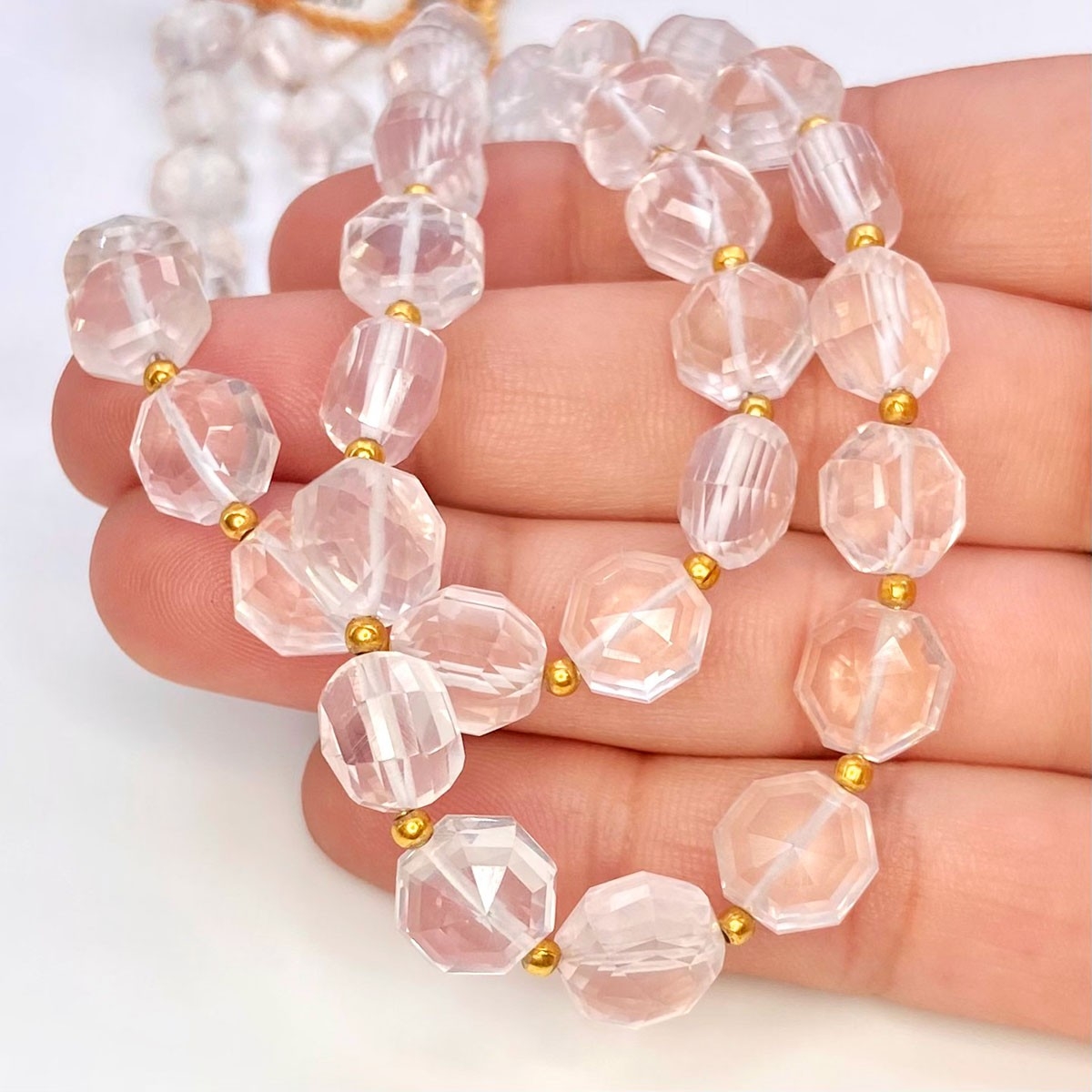 Buy This "AAA" Grade Center Drilled 8-9mm Briolette Hexagon Shape Natural Rose Quartz (Un-Treated) Gemstone Beads Strand. You Will Receive Approximately 24 Beads on 1 Strand of 9 Inch. With a Total Weight of 95 Cts.. This Rose Quartz Stone is Originated From Africa and Masterfully Handcrafted by The Experienced Artisans of Jaipur (India).