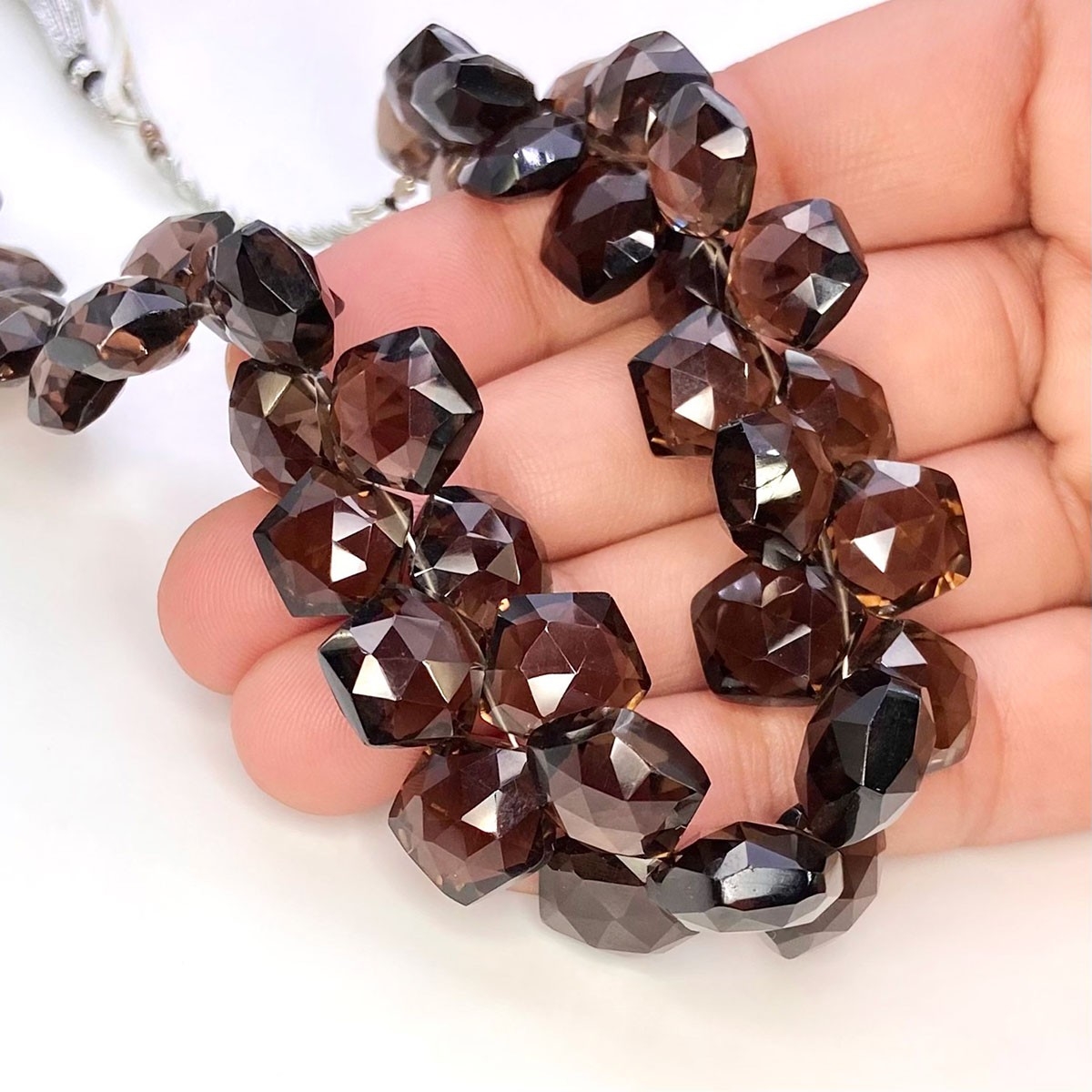 Buy This "AAA" Grade Side Drilled 9-12mm Briolette Hexagon Shape Natural Smoky Quartz (Heated) Gemstone Beads Strand. You Will Receive Approximately 42 Beads on 1 Strand of 8 Inch. With a Total Weight of 184.75 Cts.. This Smoky Quartz Stone is Originated From Brazil and Masterfully Handcrafted by The Experienced Artisans of Jaipur (India).