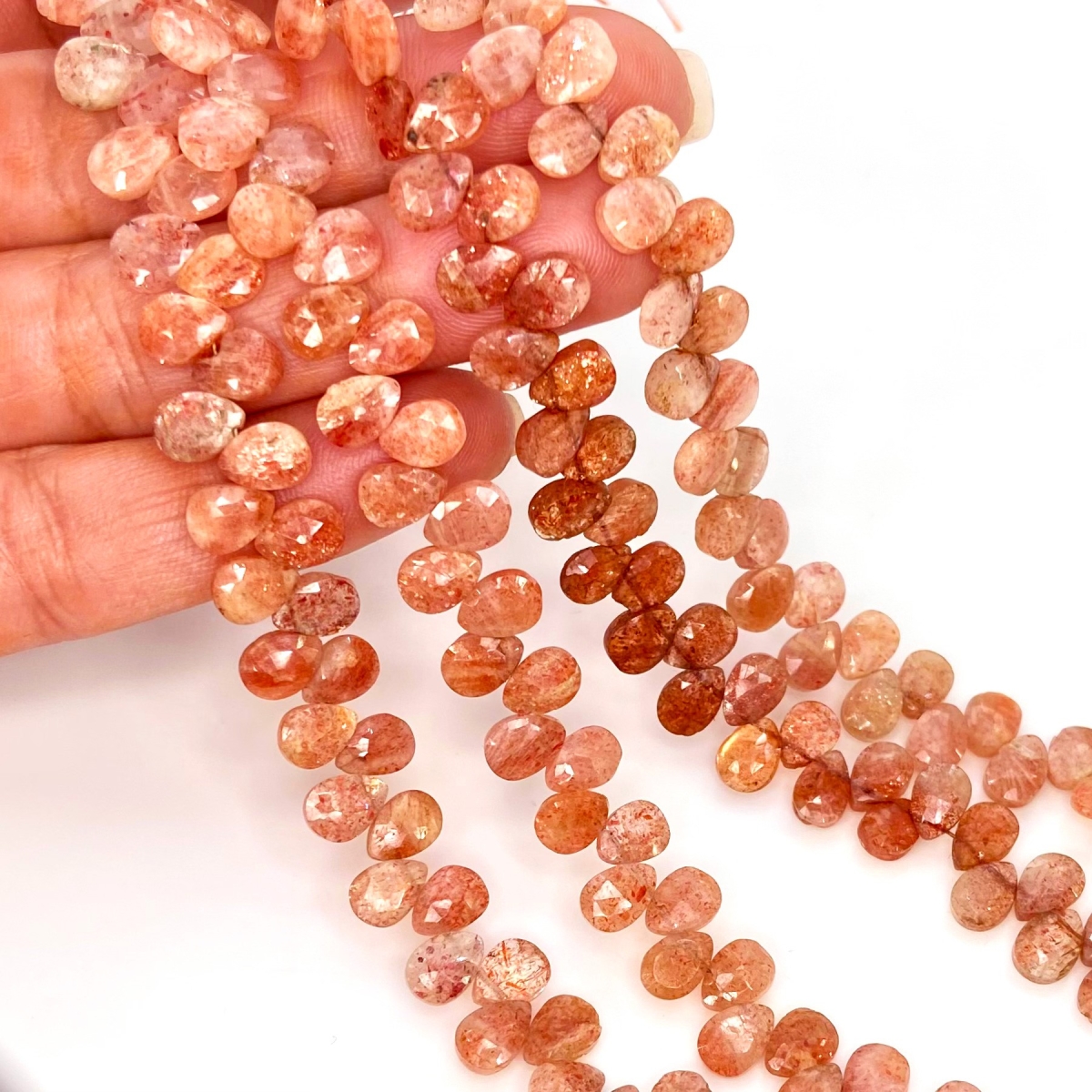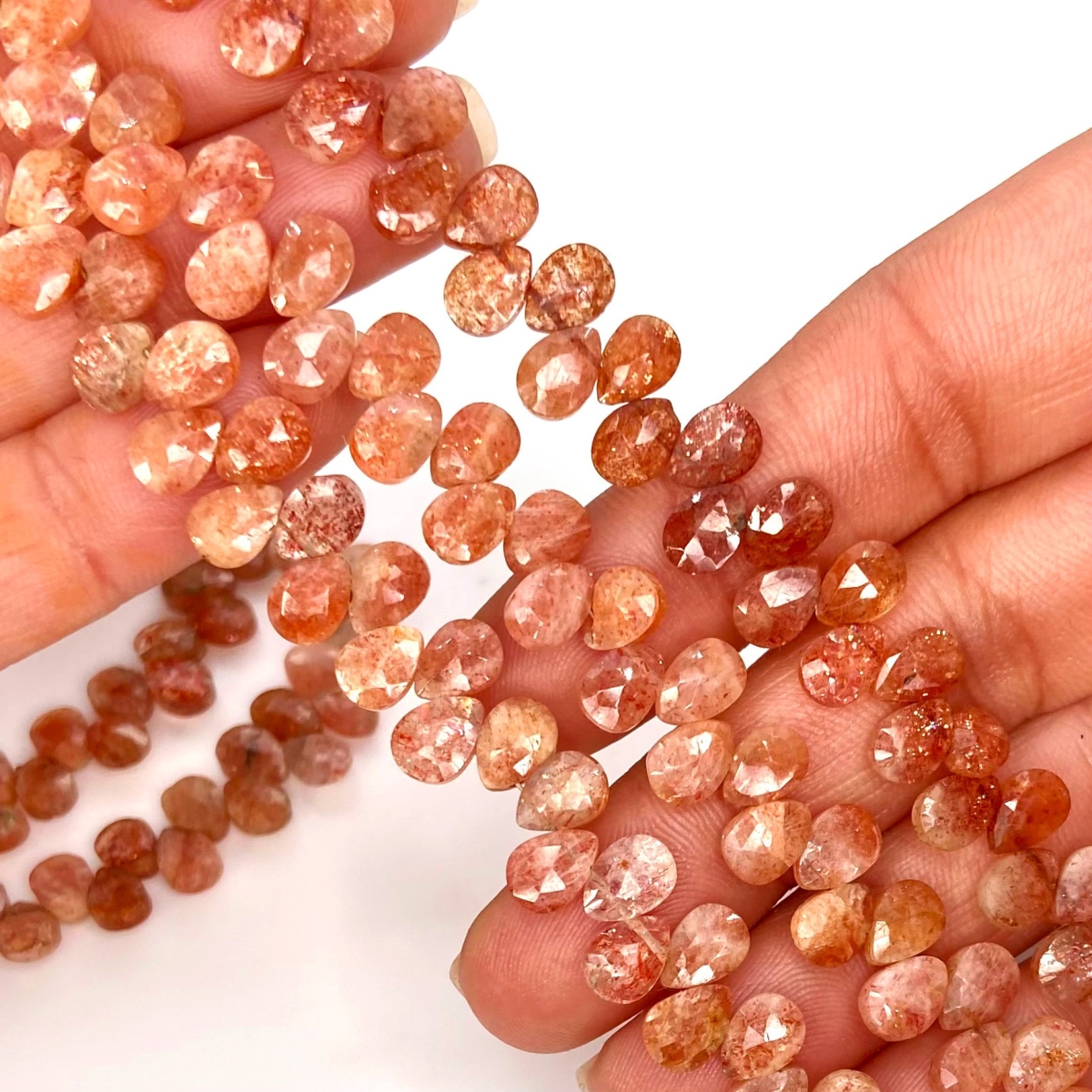 Buy This "AA" Grade Side Drilled 7mm Briolette Pear Shape Natural Sun Stone (Un-Treated) Gemstone Beads Strand. You Will Receive Approximately 42 Beads on 1 Strand of 6 Inch. With a Total Weight of 40 Cts.. This Sun Stone Stone is Originated From Germany and Masterfully Handcrafted by The Experienced Artisans of Jaipur (India).