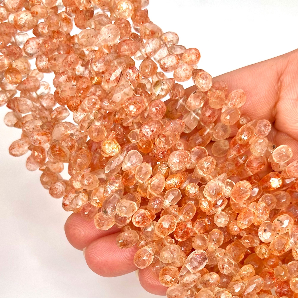 Buy This "AA" Grade Side Drilled 7-10mm Briolette Drop Shape Natural Sun Stone (Un-Treated) Gemstone Beads Strand. You Will Receive Approximately 70 Beads on 1 Strand of 8 Inch. With a Total Weight of 85 Cts.. This Sun Stone Stone is Originated From Germany and Masterfully Handcrafted by The Experienced Artisans of Jaipur (India).