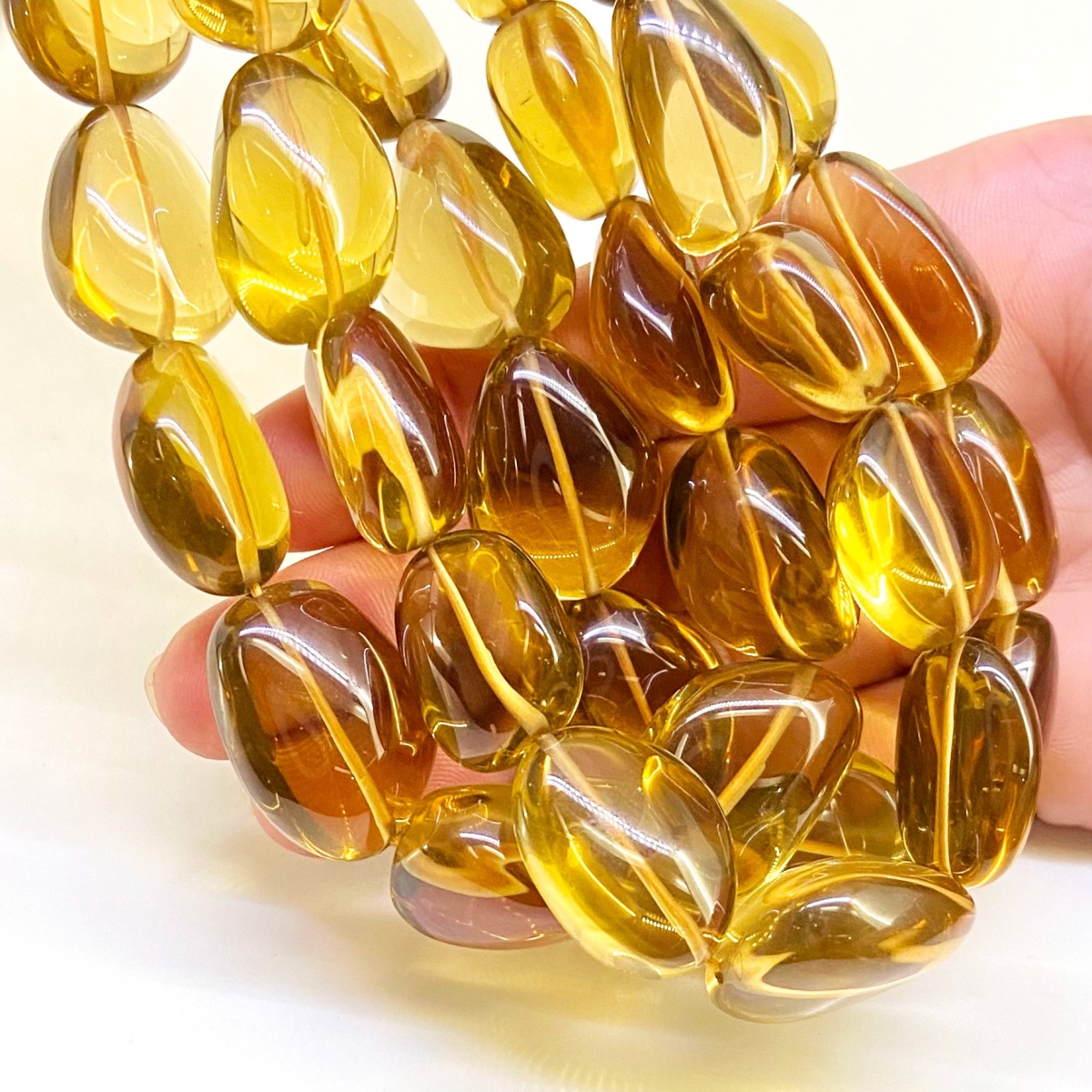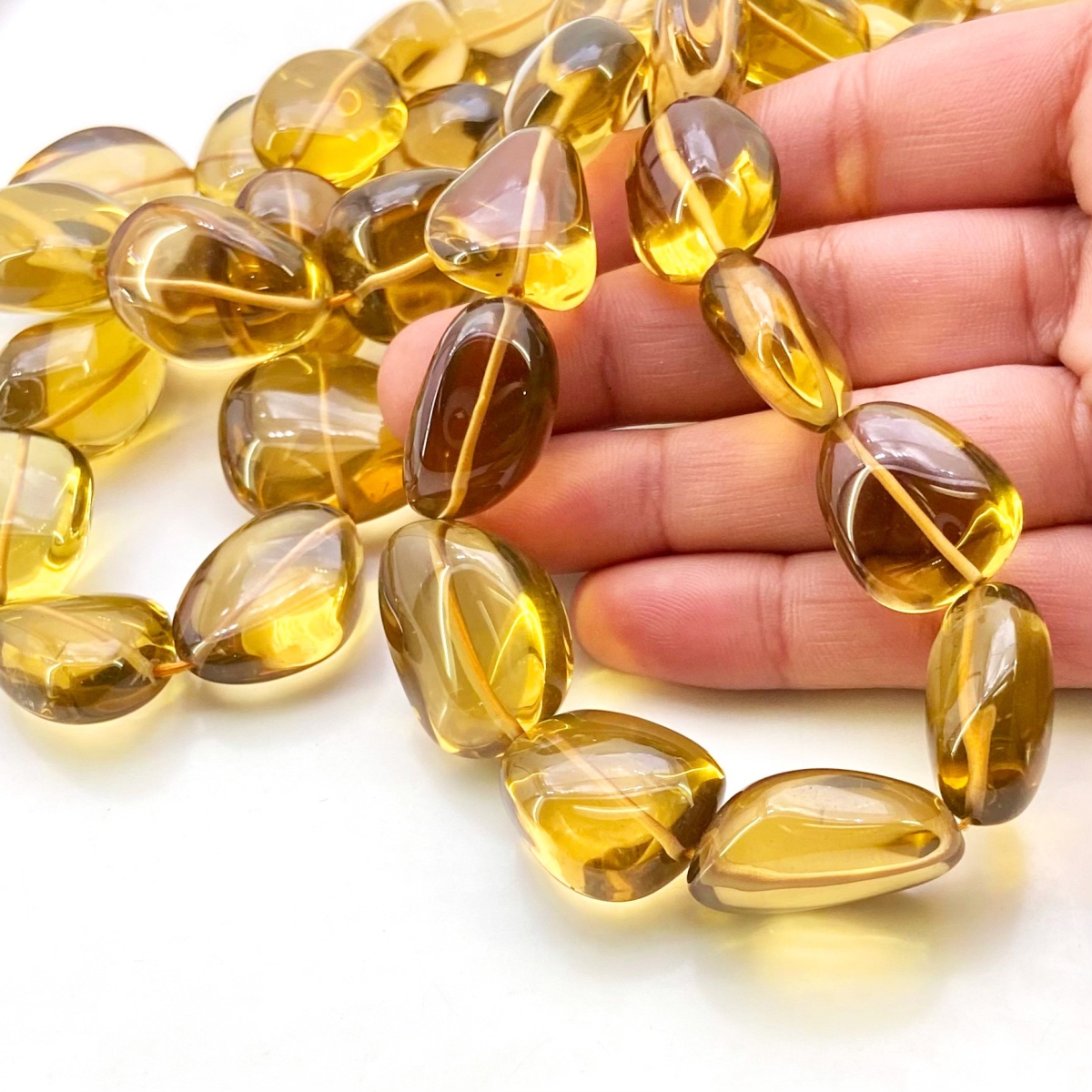 Buy This "AAA" Grade Center Drilled 16-25mm Smooth Nugget Shape Natural Whisky Quartz (Heated) Gemstone Beads Strand. You Will Receive Approximately 23 Beads on 1 Strand of 16 Inch. With a Total Weight of 565 Cts.. This Whisky Quartz Stone is Originated From Brazil and Masterfully Handcrafted by The Experienced Artisans of Jaipur (India).