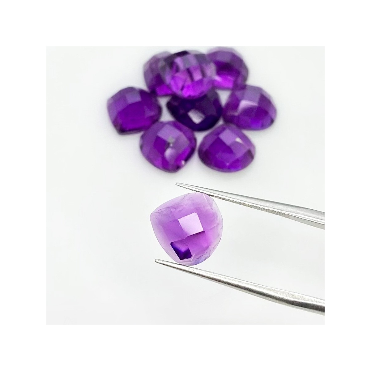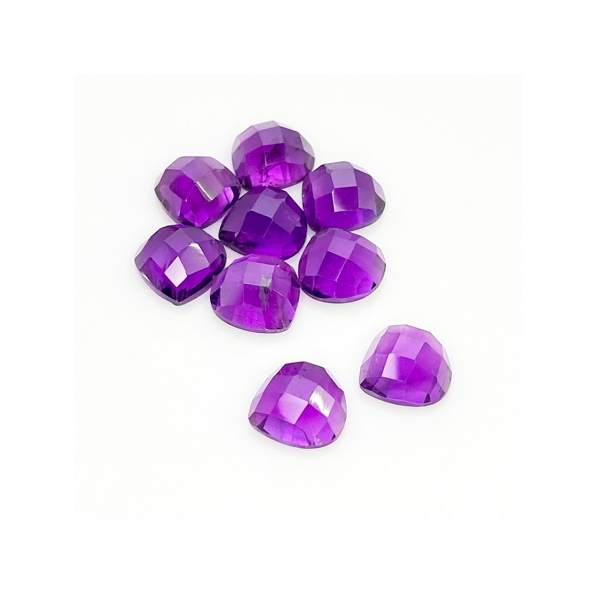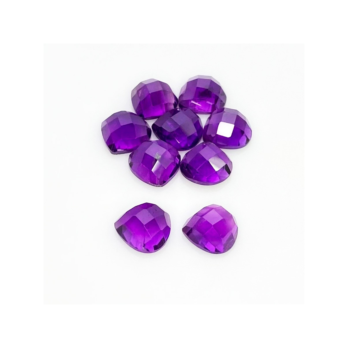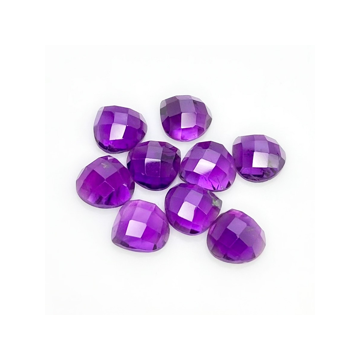 Buy This "AA" Grade 10mm Checkerboard Heart Shape Natural African Amethyst (Un-Treated) Cabochons Parcel. You Will Receive 9 Pcs. With a Total Weight of 26.80 Carat. This African Amethyst Stone is Originated From Africa and Masterfully Handcrafted by The Experienced Artisans of Jaipur (India).