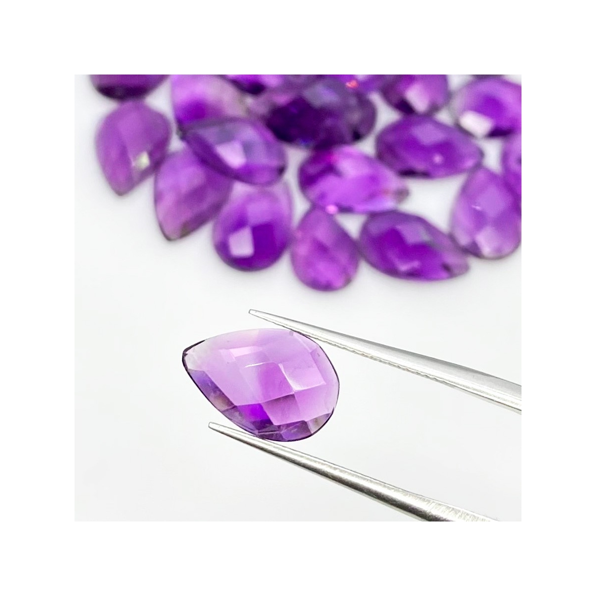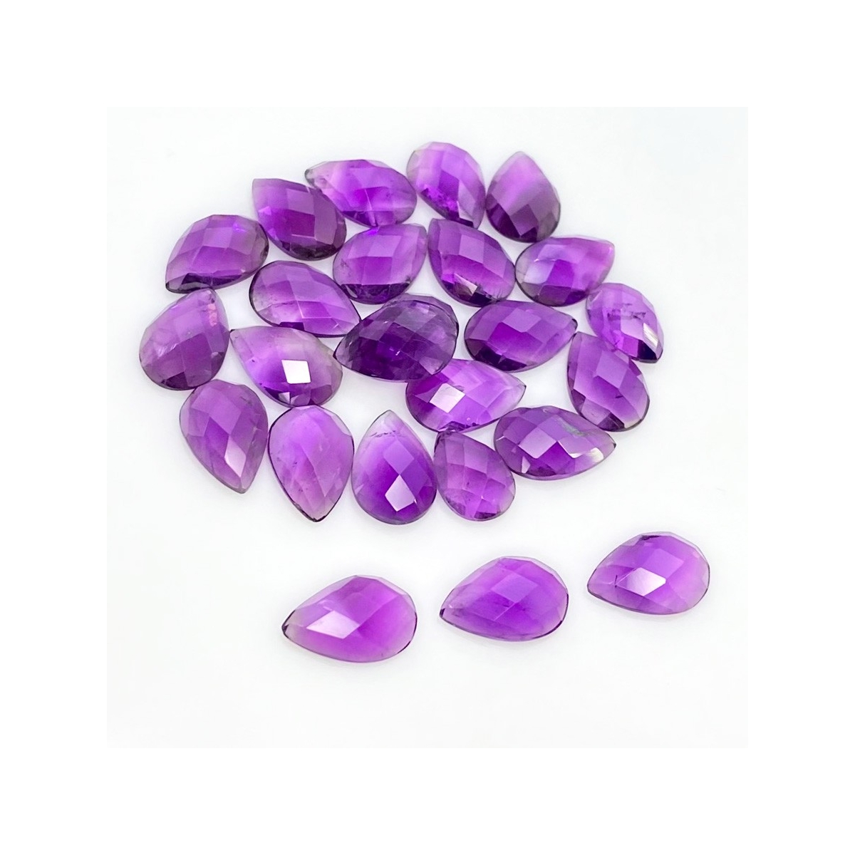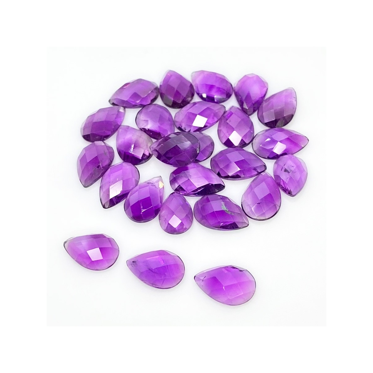 Buy This "A" Grade 12x8mm Checkerboard Pear Shape Natural African Amethyst (Un-Treated) Cabochons Parcel. You Will Receive 25 Pcs. With a Total Weight of 53.40 Carat. This African Amethyst Stone is Originated From Africa and Masterfully Handcrafted by The Experienced Artisans of Jaipur (India).