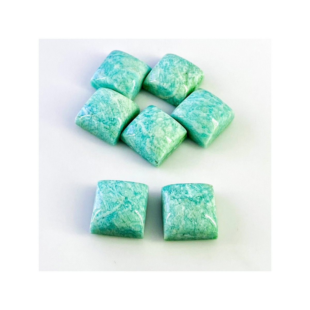 Buy This "AA" Grade 15mm Smooth Square Shape Natural Amazonite (Un-Treated) Cabochons Parcel. You Will Receive 7 Pcs. With a Total Weight of 129.85 Cts.. This Amazonite Stone is Originated From Brazil and Masterfully Handcrafted by The Experienced Artisans of Jaipur (India).