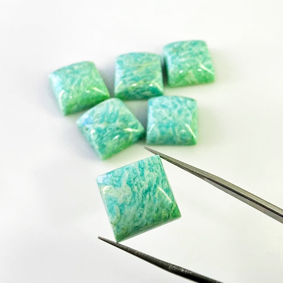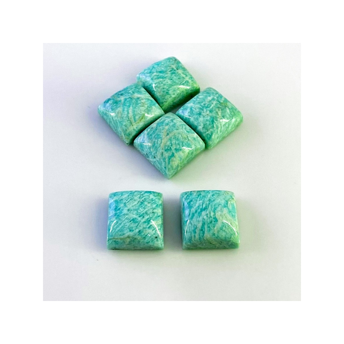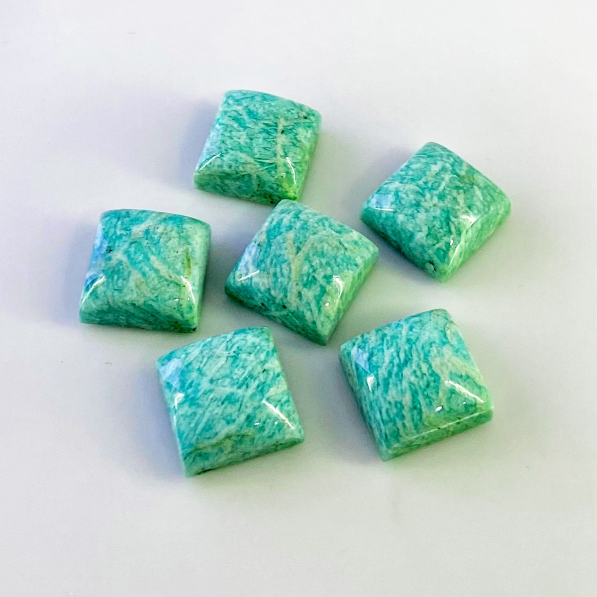 Buy This "AA" Grade 15mm Smooth Square Shape Natural Amazonite (Un-Treated) Cabochons Parcel. You Will Receive 6 Pcs. With a Total Weight of 112.25 Cts.. This Amazonite Stone is Originated From Brazil and Masterfully Handcrafted by The Experienced Artisans of Jaipur (India).