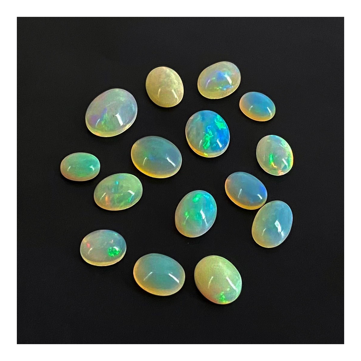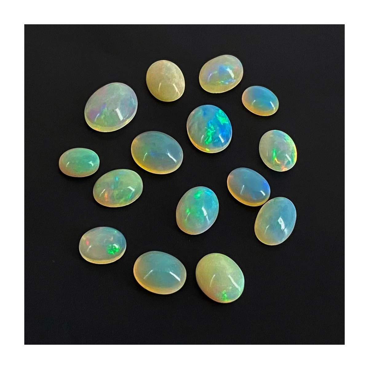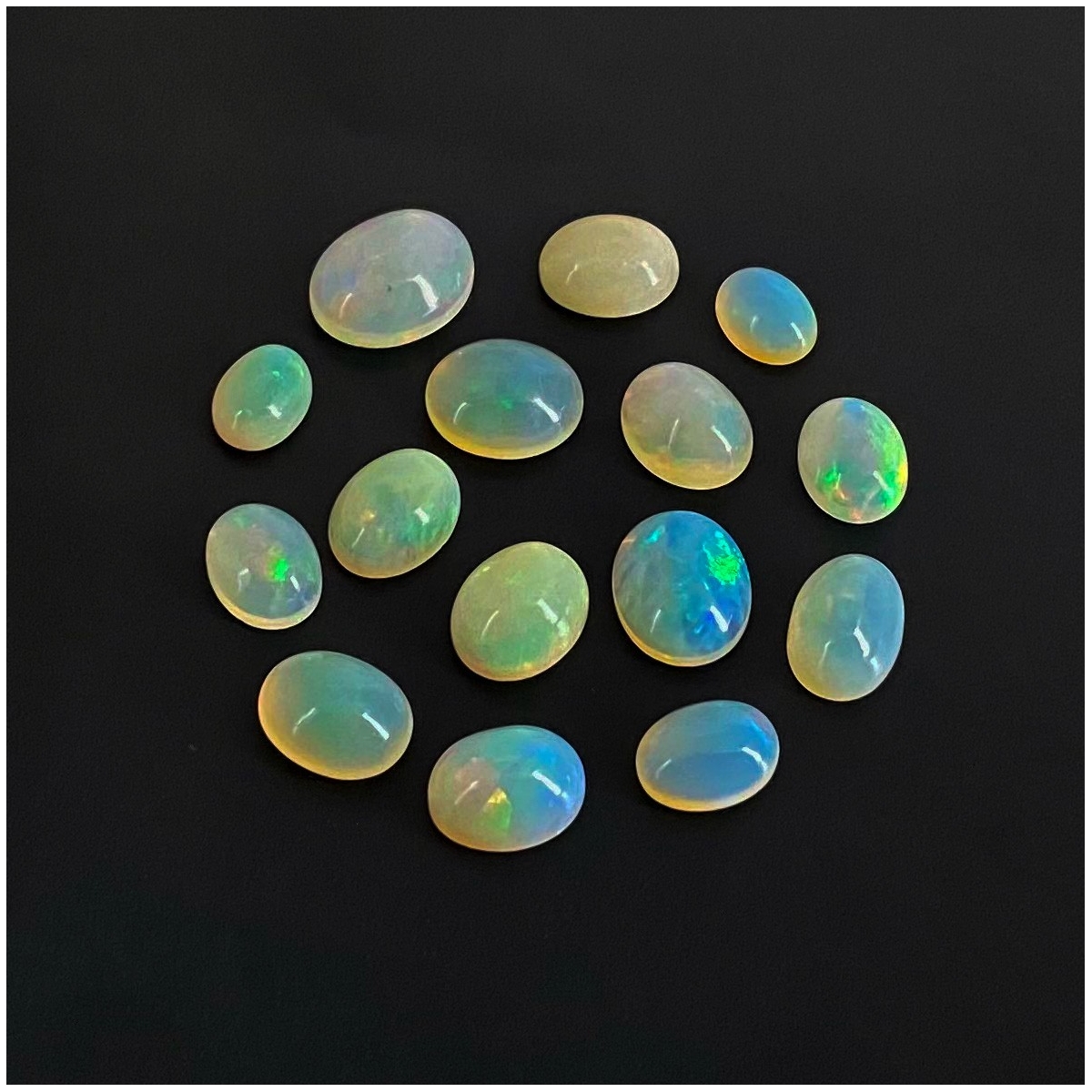 Buy This "AA" Grade 8x6-12x10mm Smooth Oval Shape Natural Ethiopian Opal (Un-Treated) Cabochons Parcel. You Will Receive 15 Pcs. With a Total Weight of 24.15 Cts.. This Ethiopian Opal Stone is Originated From Ethiopia and Masterfully Handcrafted by The Experienced Artisans of Jaipur (India).