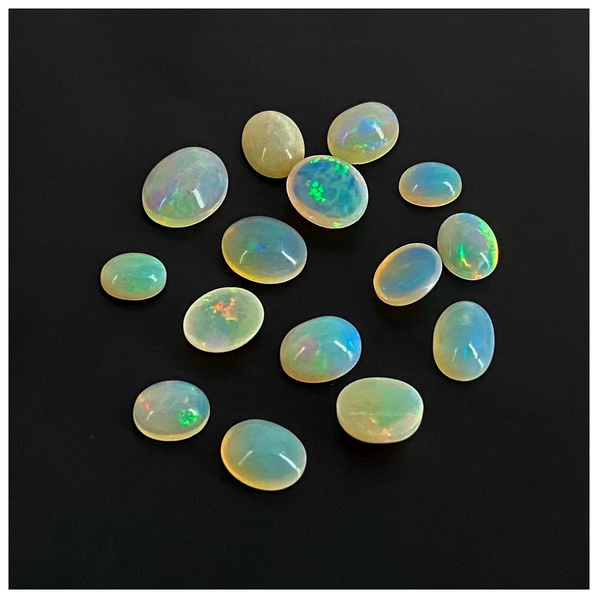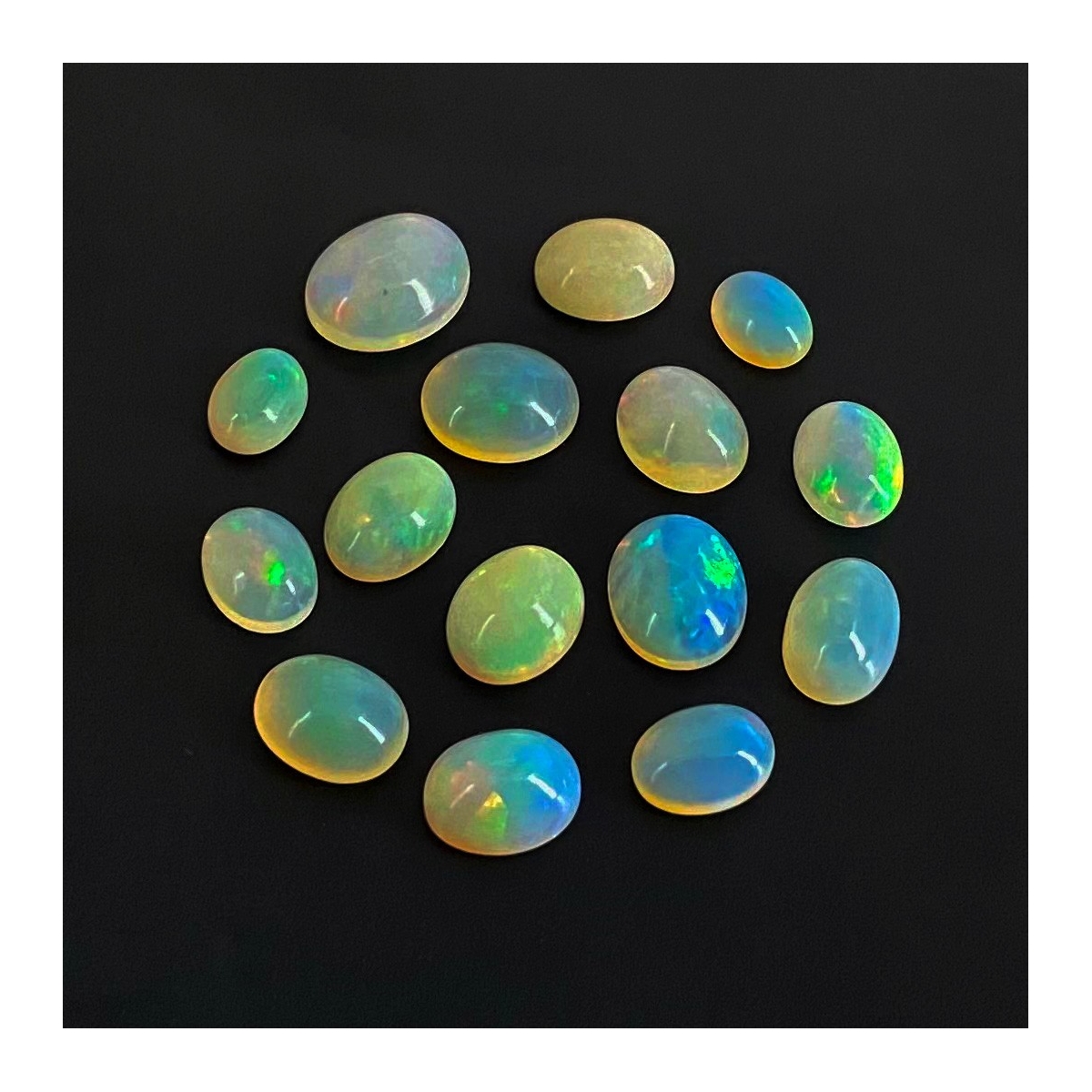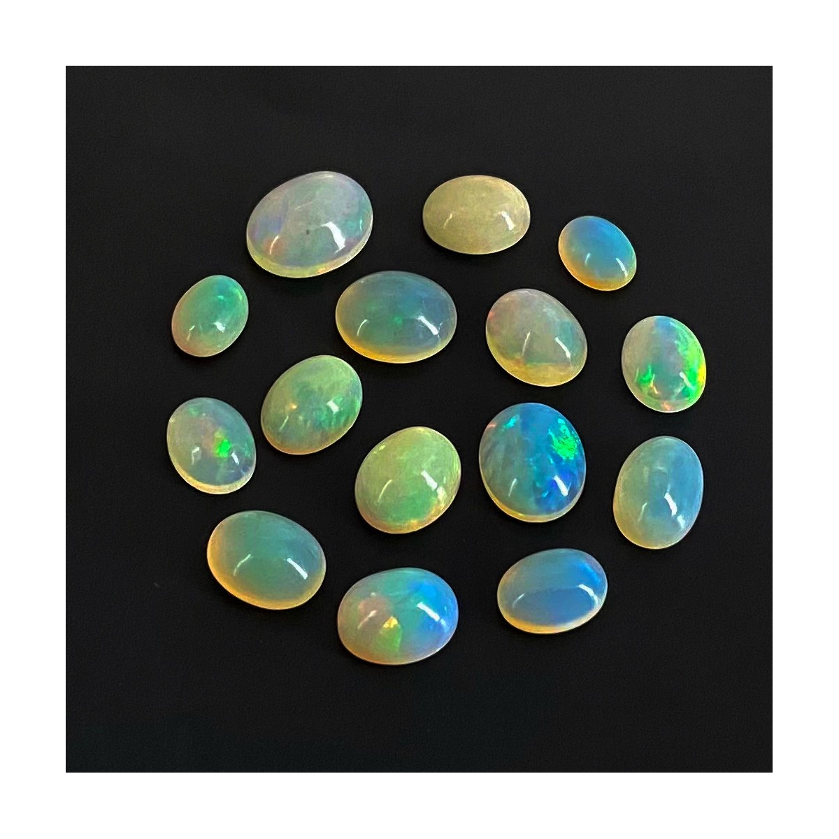 Buy This "AA" Grade 8x6-12x10mm Smooth Oval Shape Natural Ethiopian Opal (Un-Treated) Cabochons Parcel. You Will Receive 15 Pcs. With a Total Weight of 24.15 Cts.. This Ethiopian Opal Stone is Originated From Ethiopia and Masterfully Handcrafted by The Experienced Artisans of Jaipur (India).