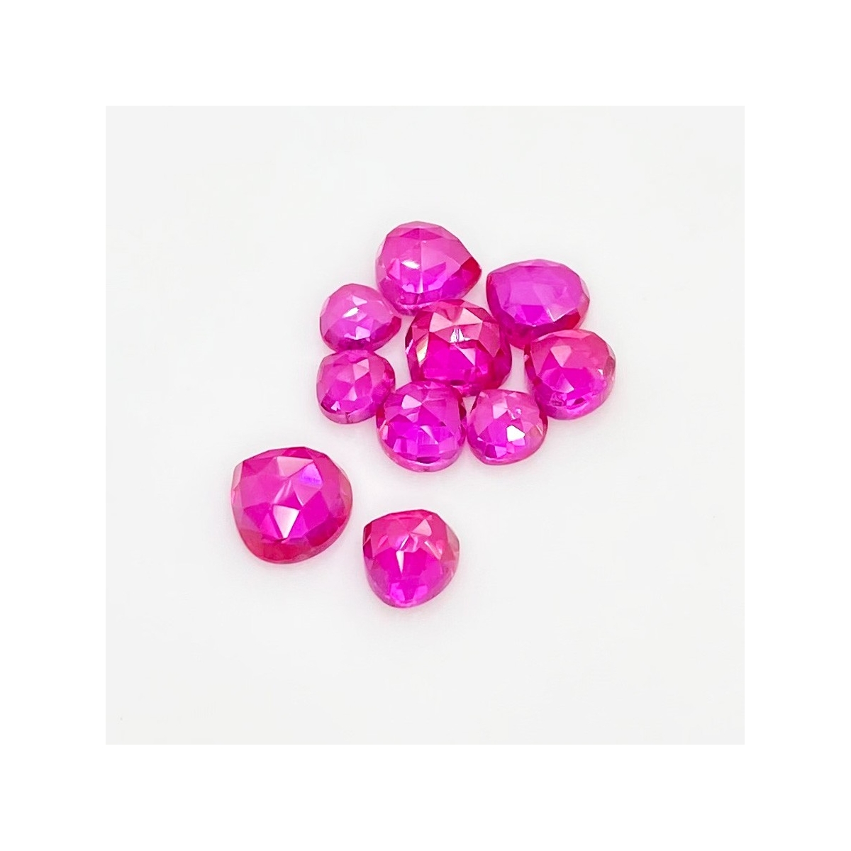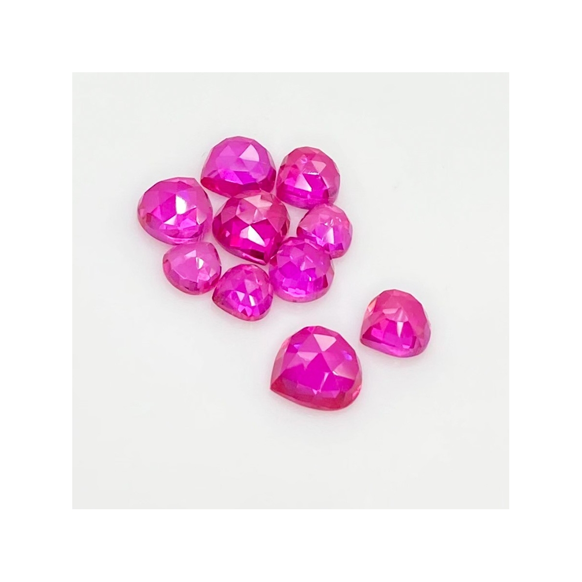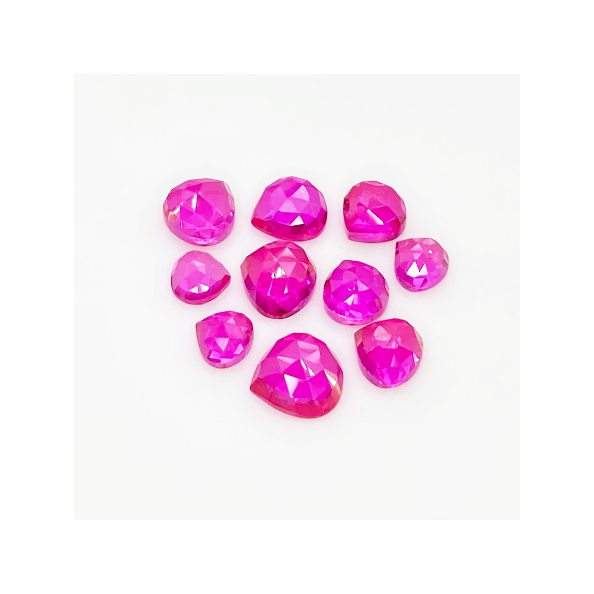 Buy This "AAA" Grade 6-9mm Rose Cut Heart Shape Created Lab Ruby (Lab Grown) Cabochons Parcel. You Will Receive 10 Pcs. With a Total Weight of 21.20 Carat. This Lab Ruby Stone is Originated From Russia and Masterfully Handcrafted by The Experienced Artisans of Jaipur (India).