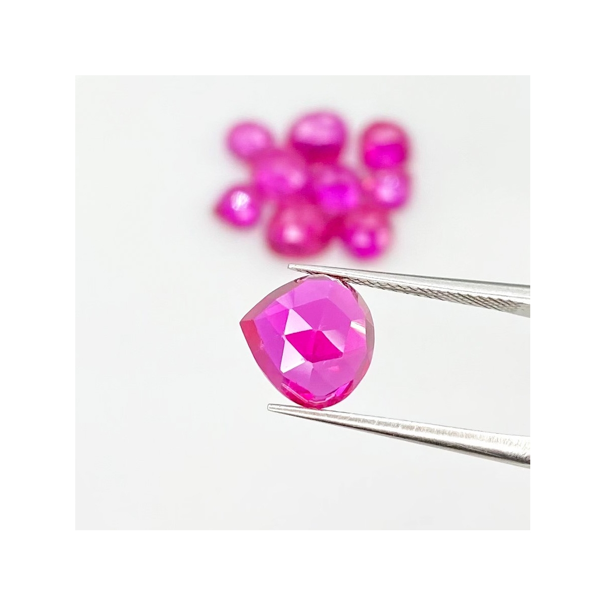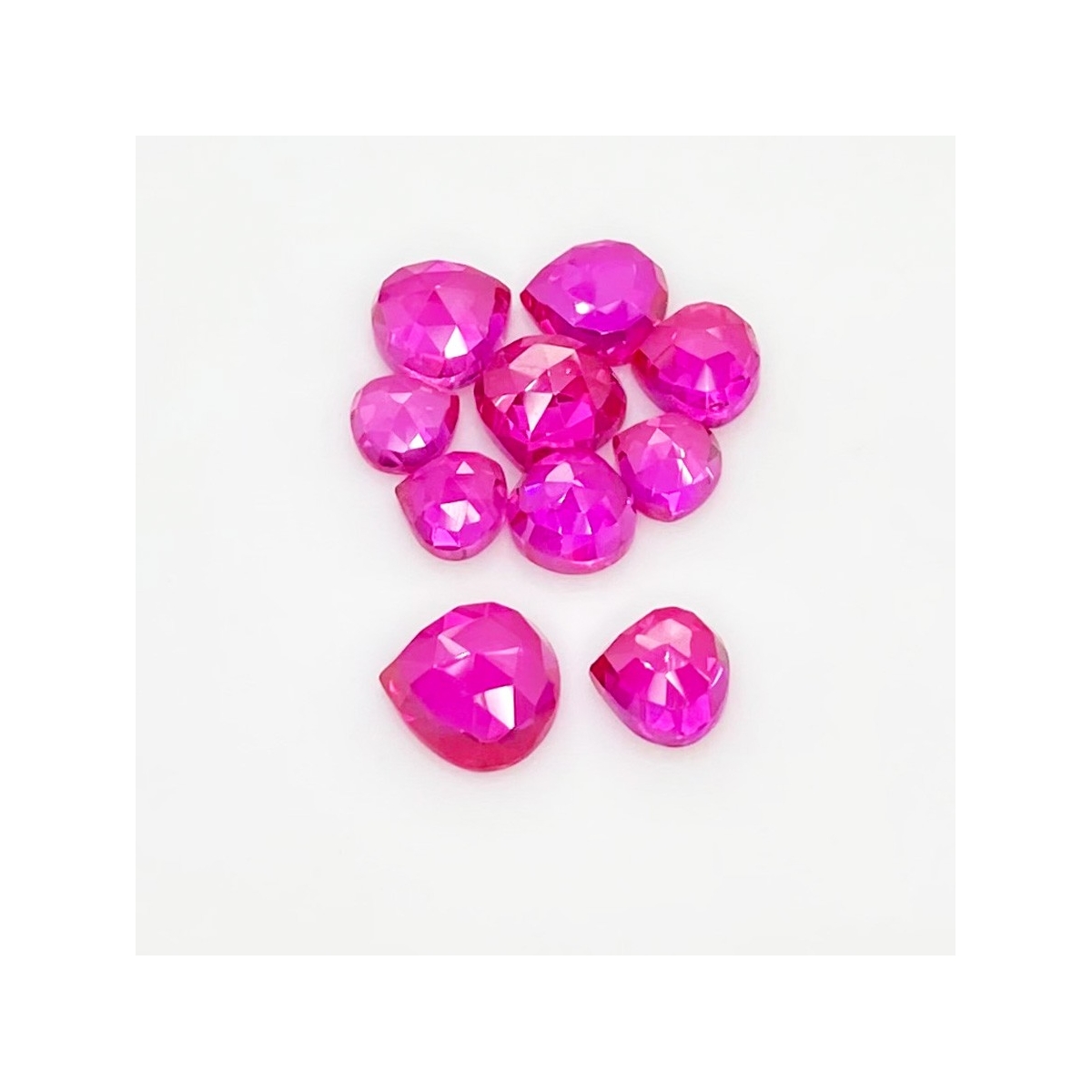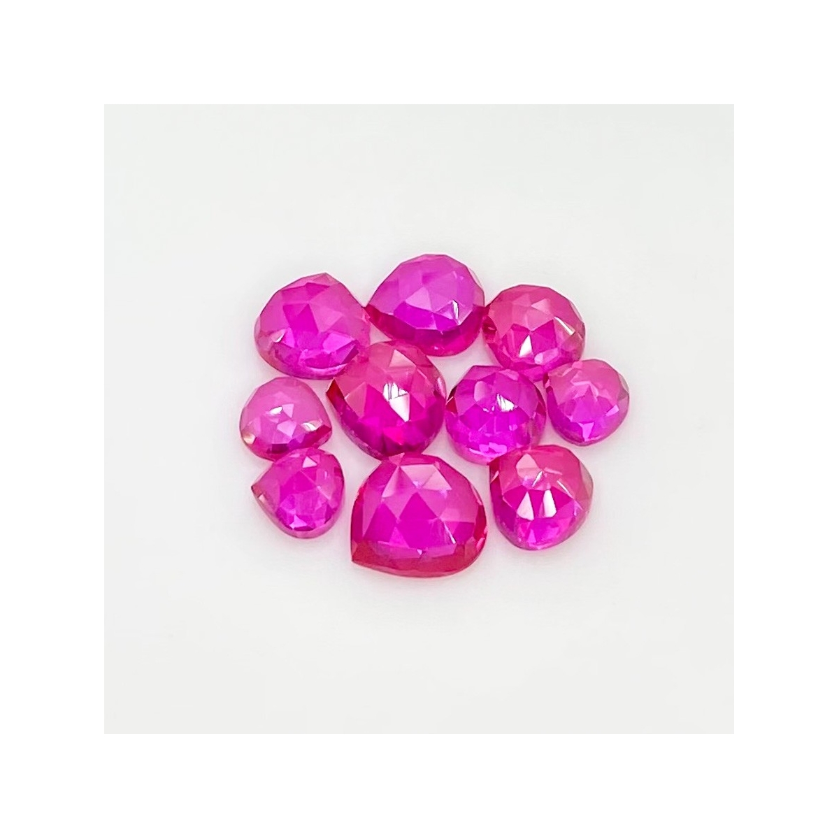 Buy This "AAA" Grade 6-9mm Rose Cut Heart Shape Created Lab Ruby (Lab Grown) Cabochons Parcel. You Will Receive 10 Pcs. With a Total Weight of 21.20 Carat. This Lab Ruby Stone is Originated From Russia and Masterfully Handcrafted by The Experienced Artisans of Jaipur (India).