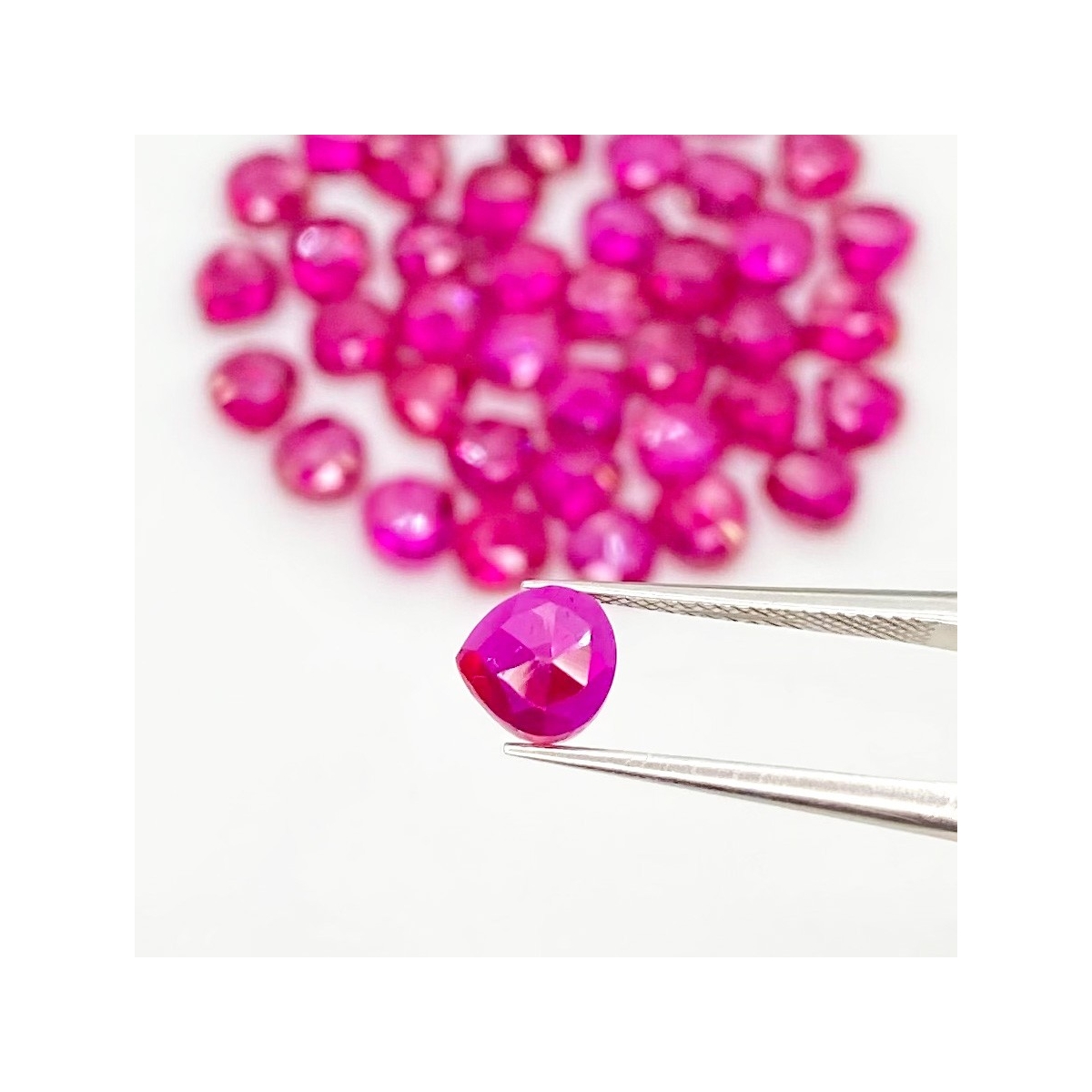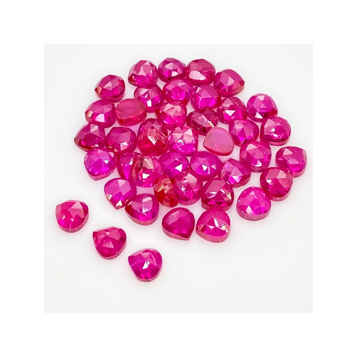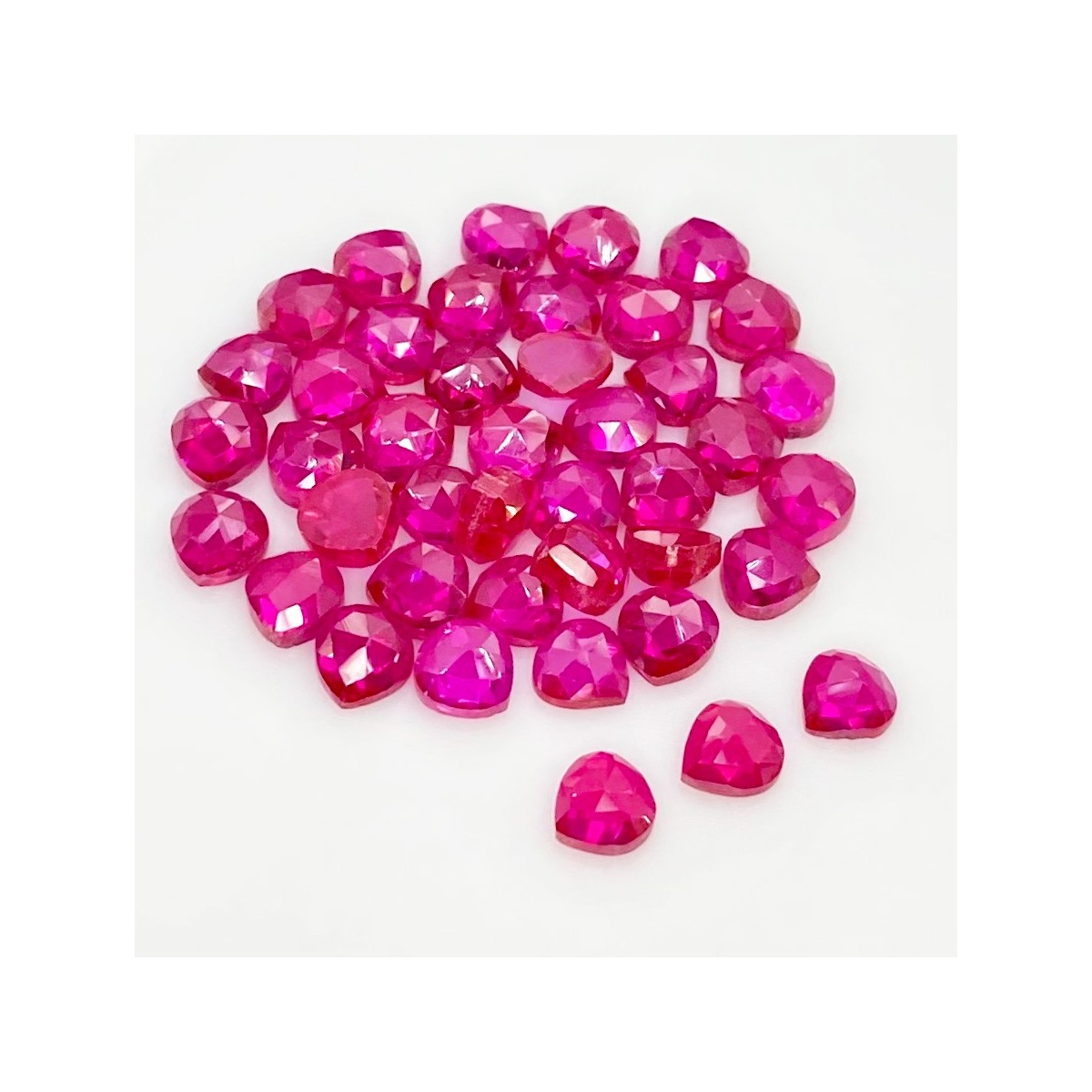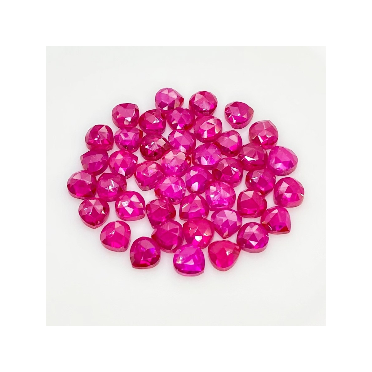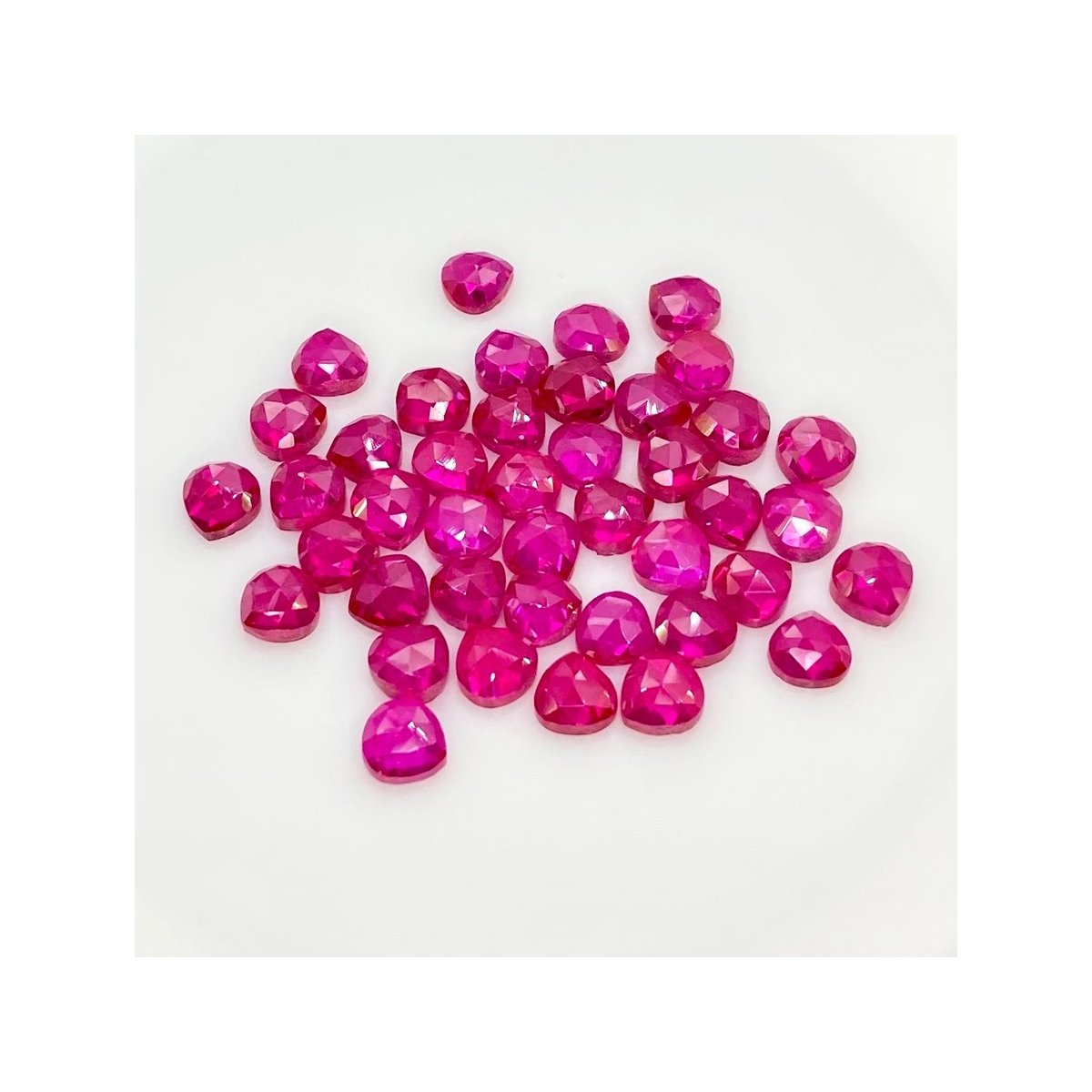 Buy This "AAA" Grade 6mm Rose Cut Heart Shape Created Lab Ruby (Lab Grown) Cabochons Parcel. You Will Receive 42 Pcs. With a Total Weight of 53.90 Cts.. This Lab Ruby Stone is Originated From Russia and Masterfully Handcrafted by The Experienced Artisans of Jaipur (India).