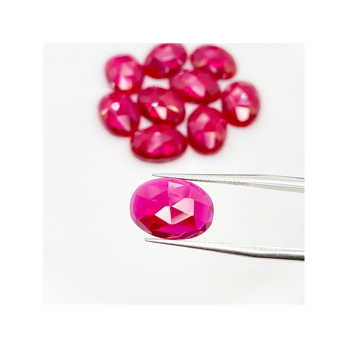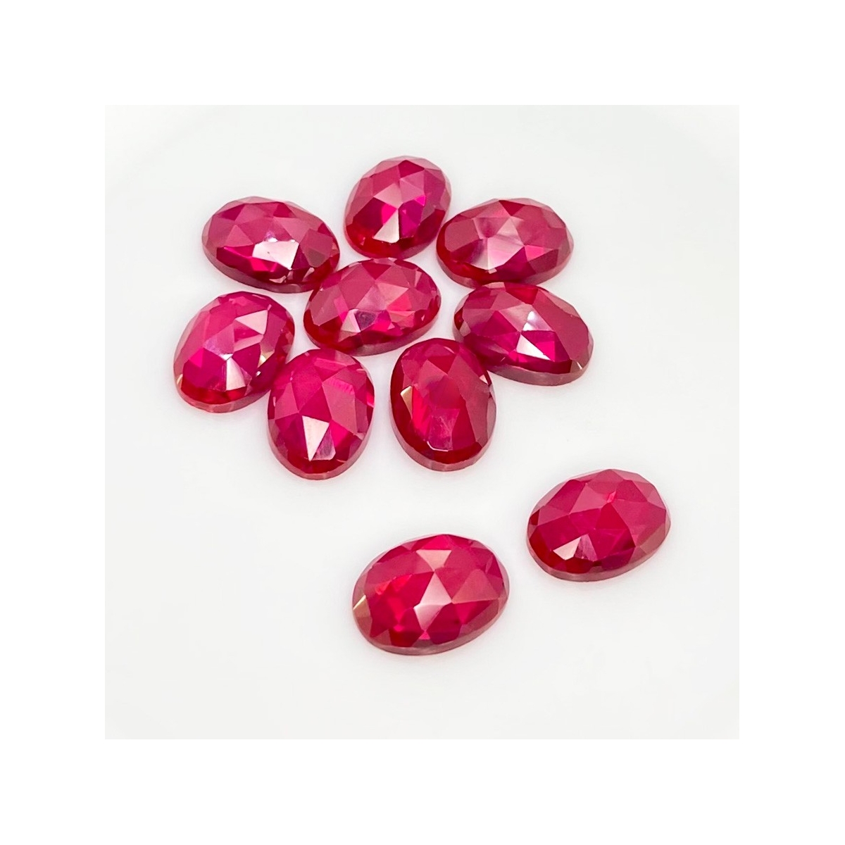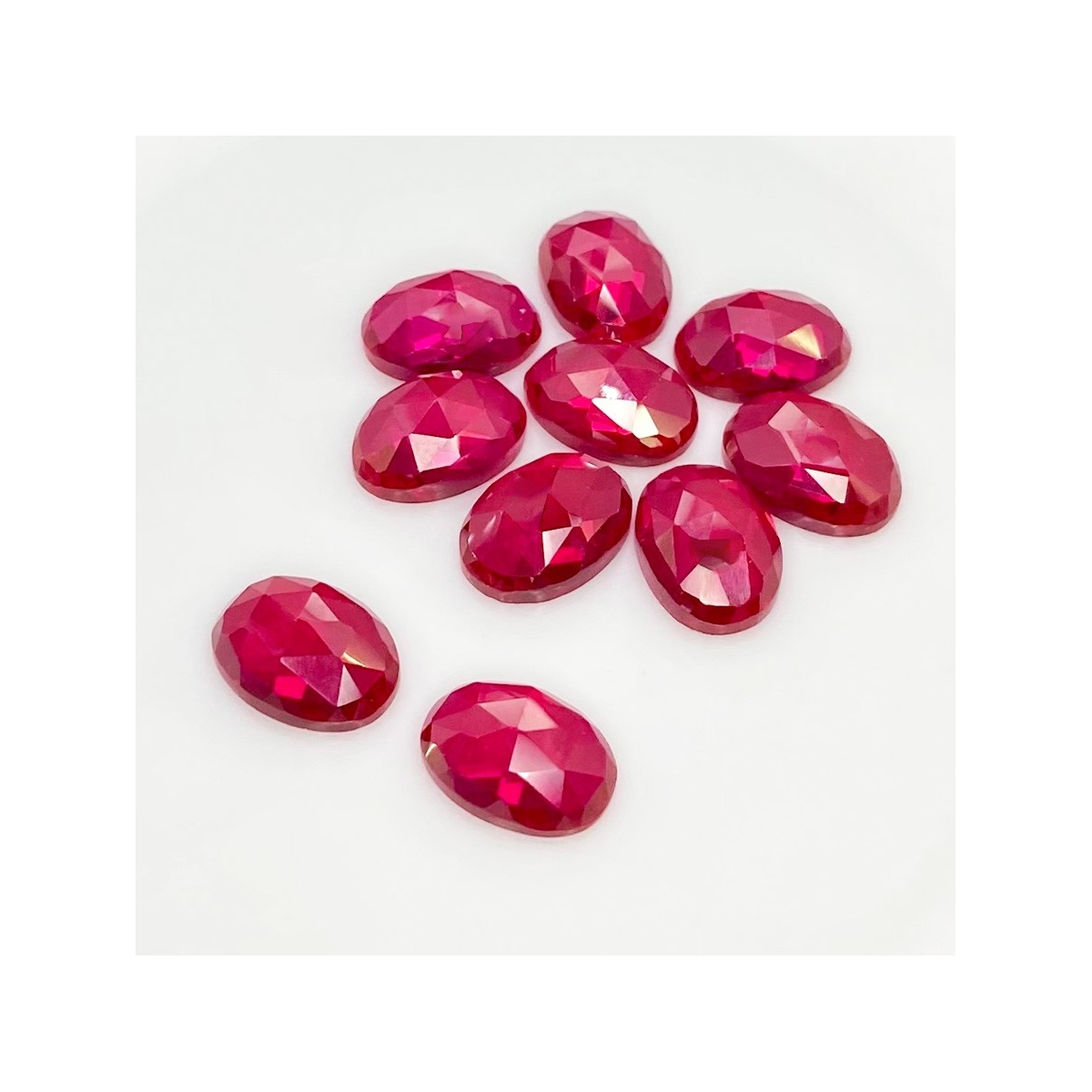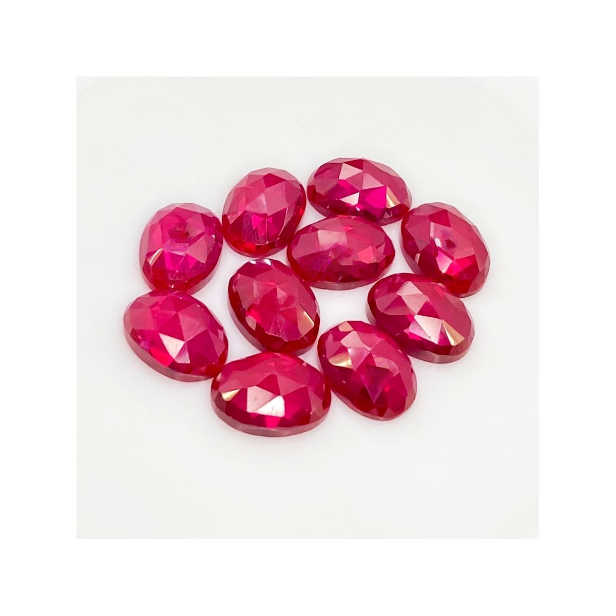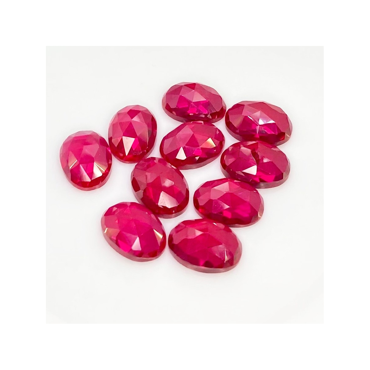 Buy This "AAA" Grade 14x10mm Rose Cut Oval Shape Created Lab Ruby (Lab Grown) Cabochons Parcel. You Will Receive 10 Pcs. With a Total Weight of 76.35 Cts.. This Lab Ruby Stone is Originated From Russia and Masterfully Handcrafted by The Experienced Artisans of Jaipur (India).