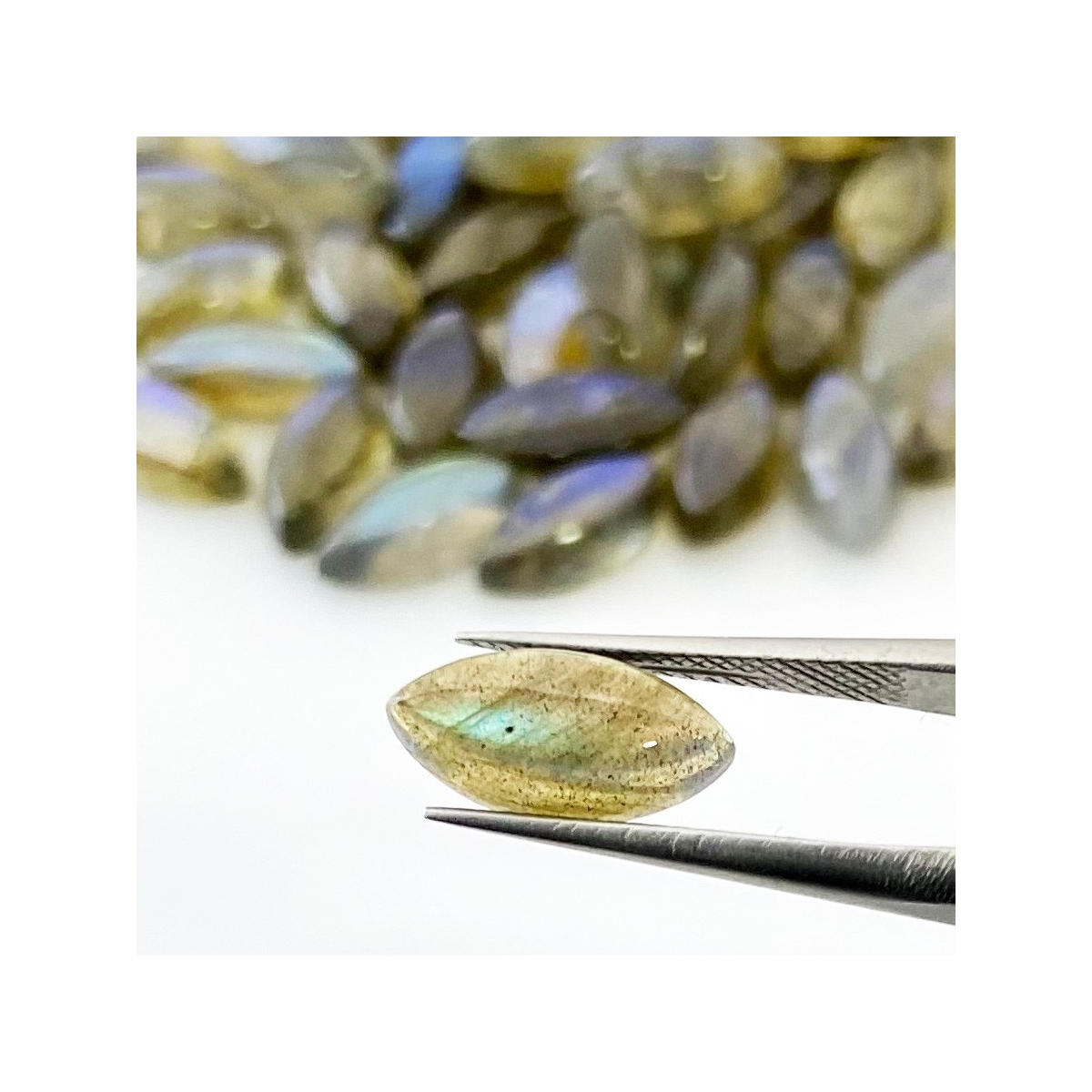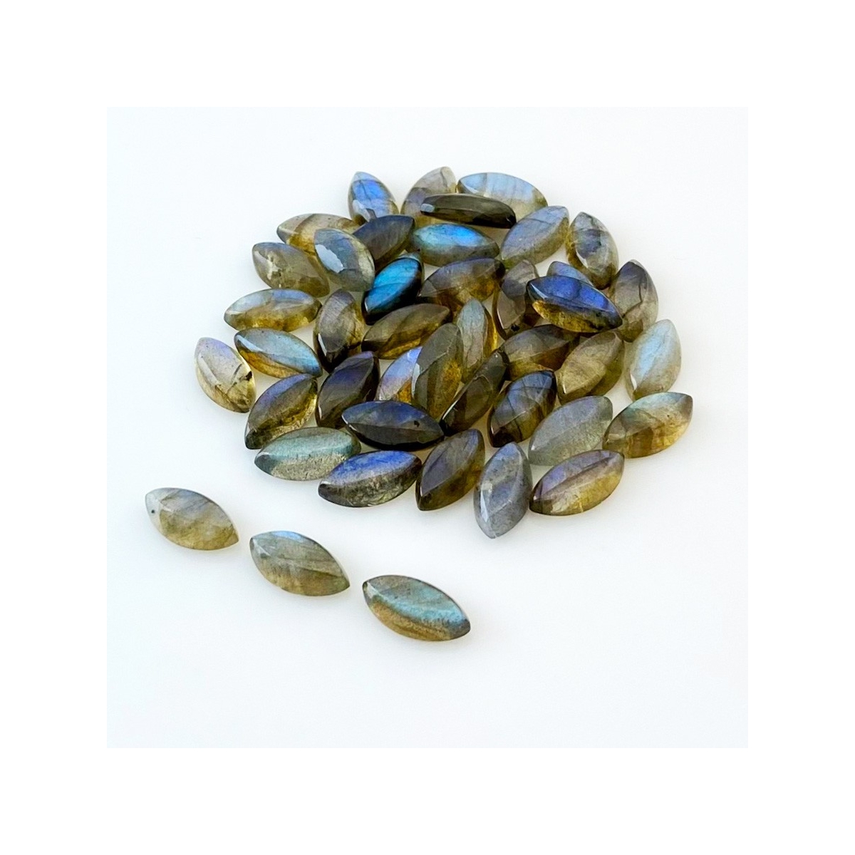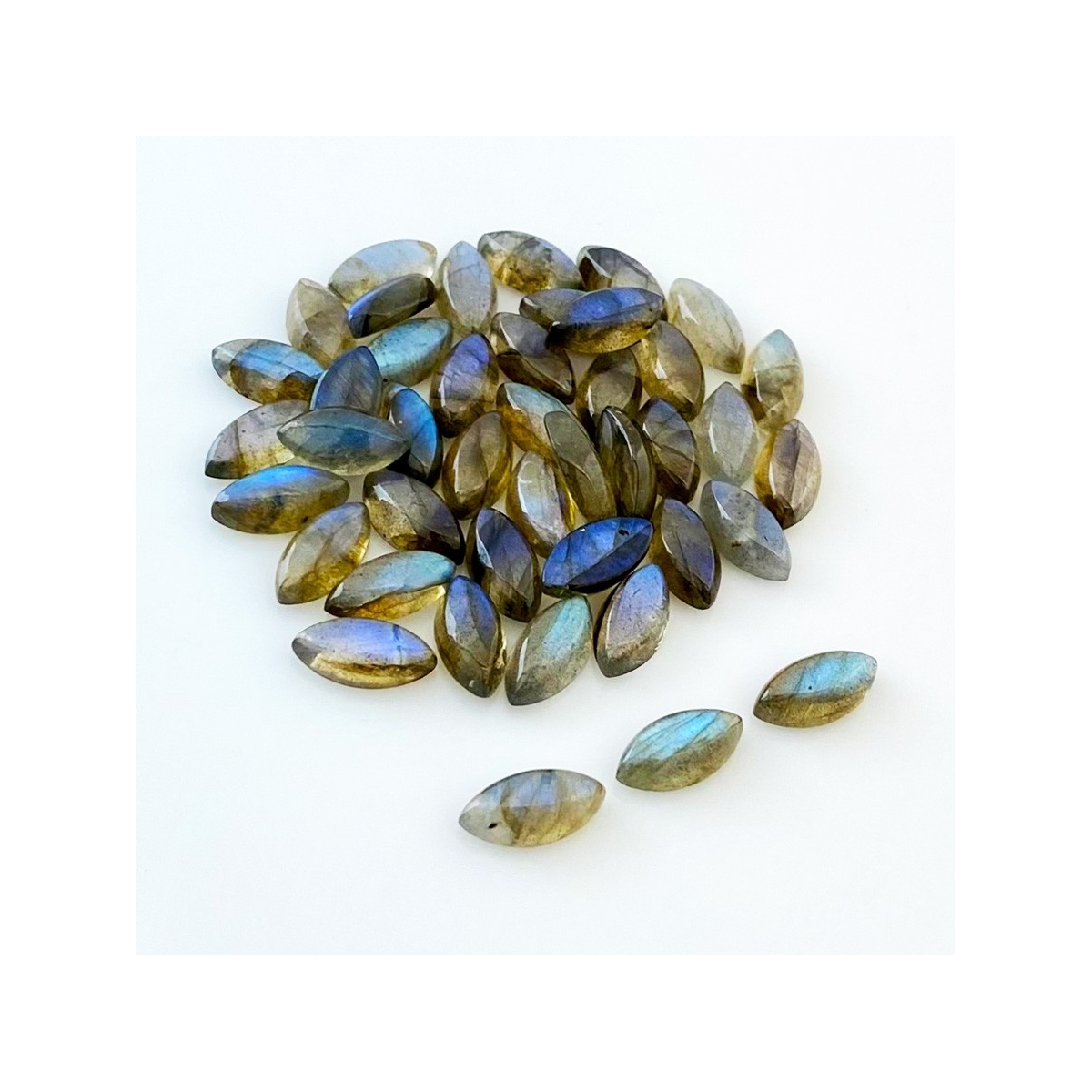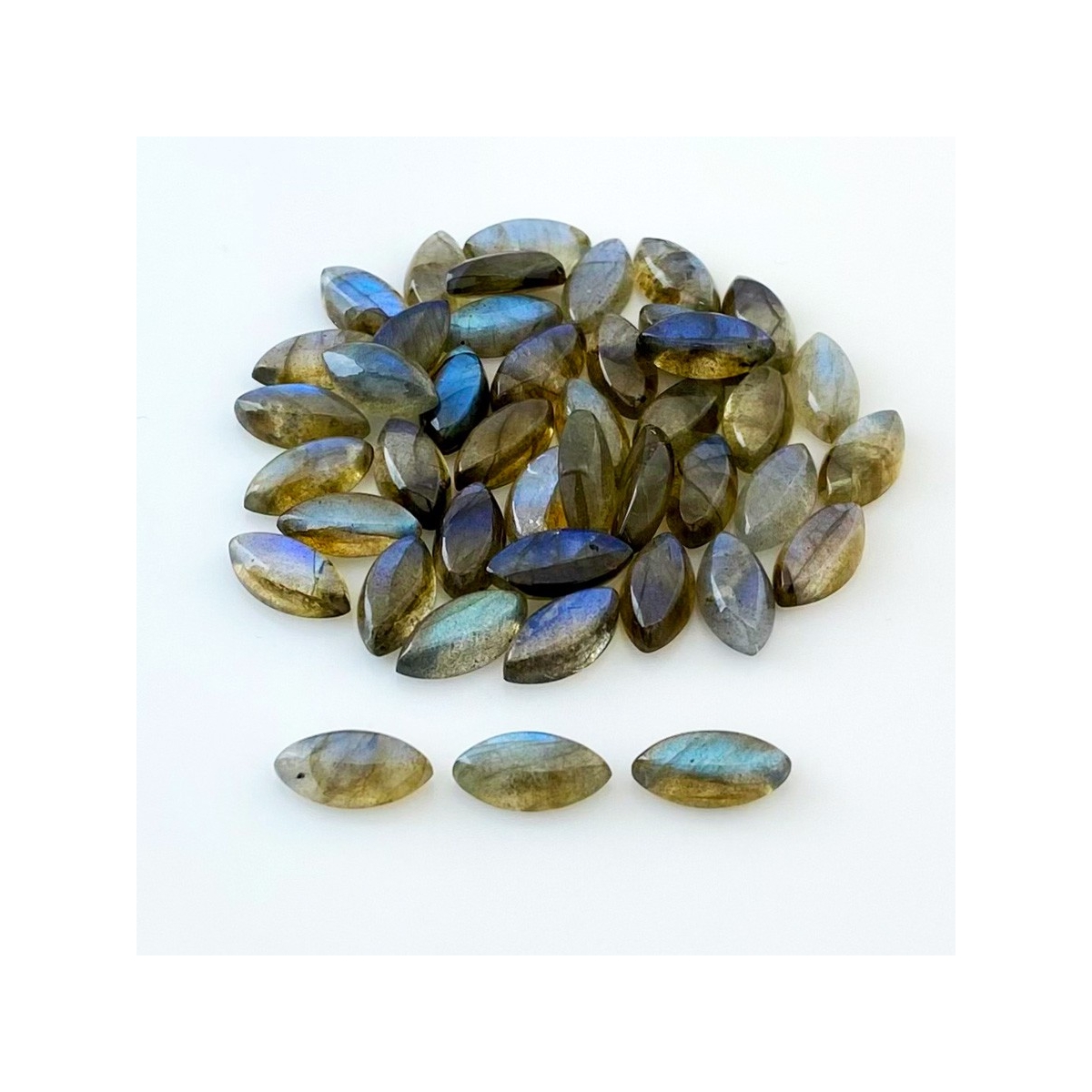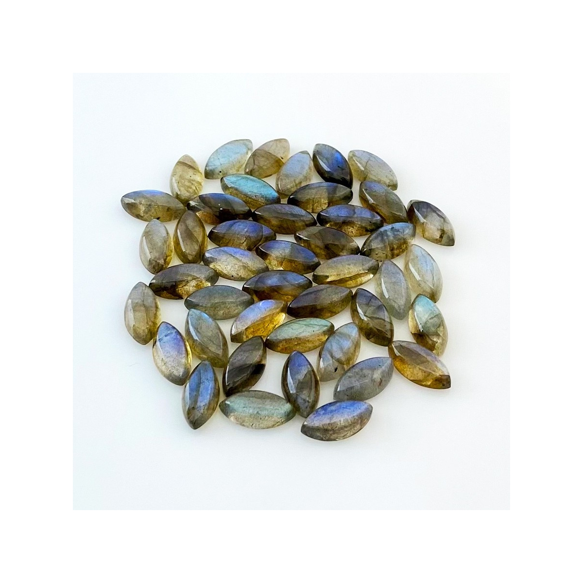 Buy This "AA" Grade 12x6mm Smooth Marquise Shape Natural Labradorite (Un-Treated) Cabochons Parcel. You Will Receive 43 Pcs. With a Total Weight of 88.50 Cts.. This Labradorite Stone is Originated From Africa and Masterfully Handcrafted by The Experienced Artisans of Jaipur (India).
