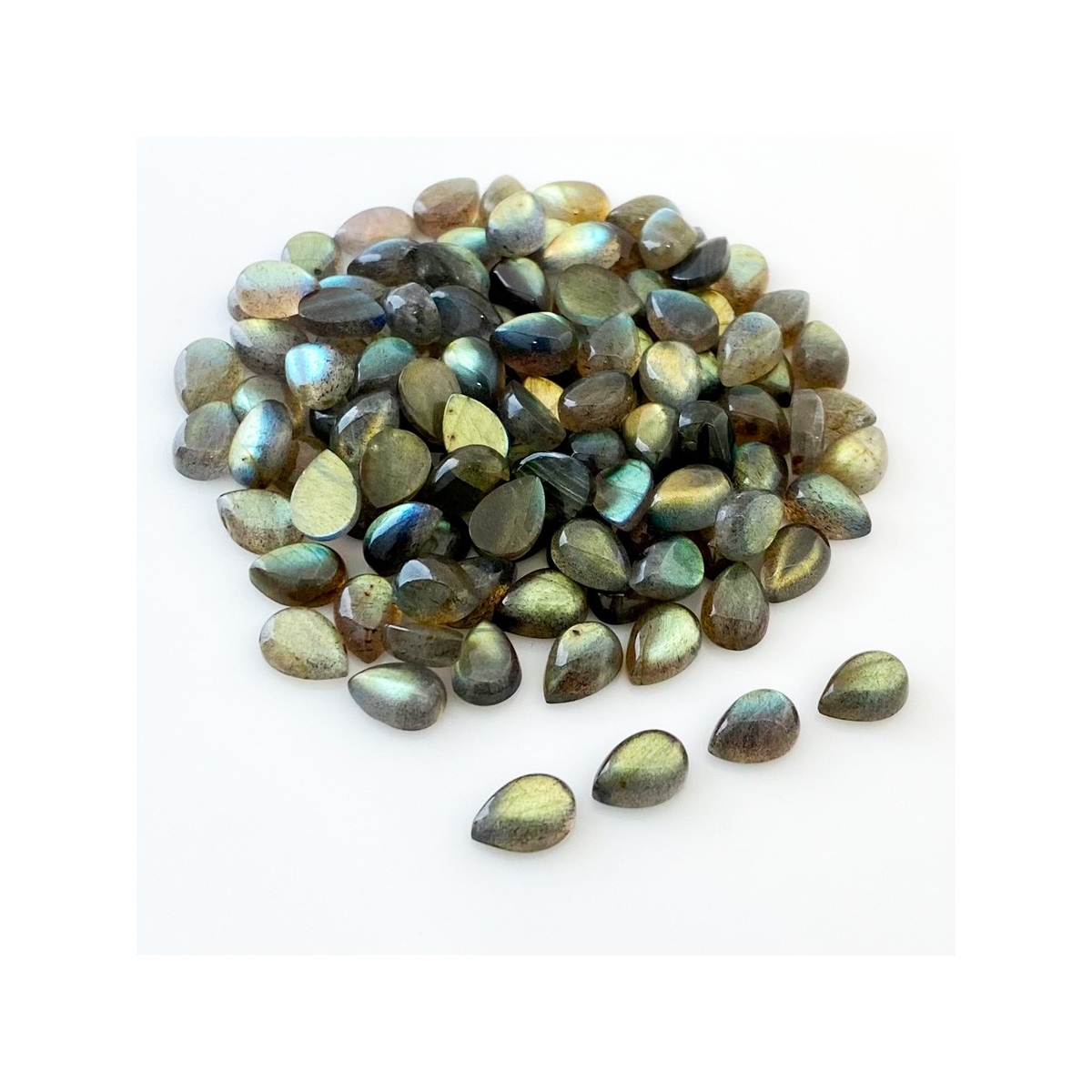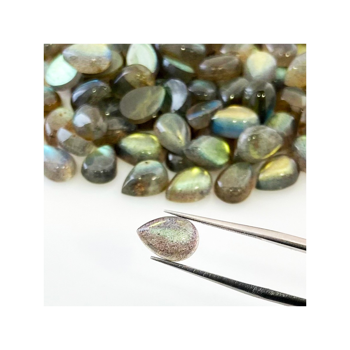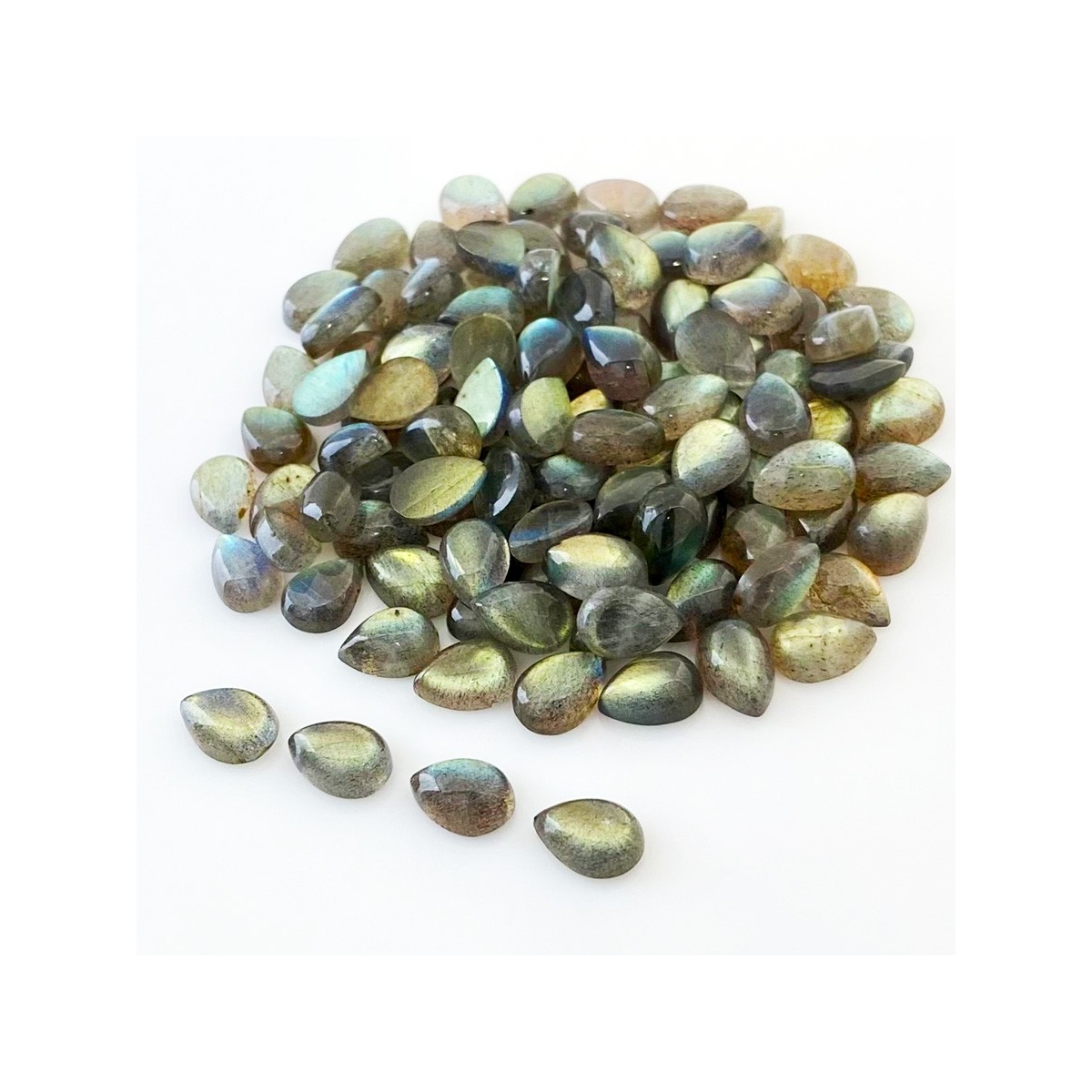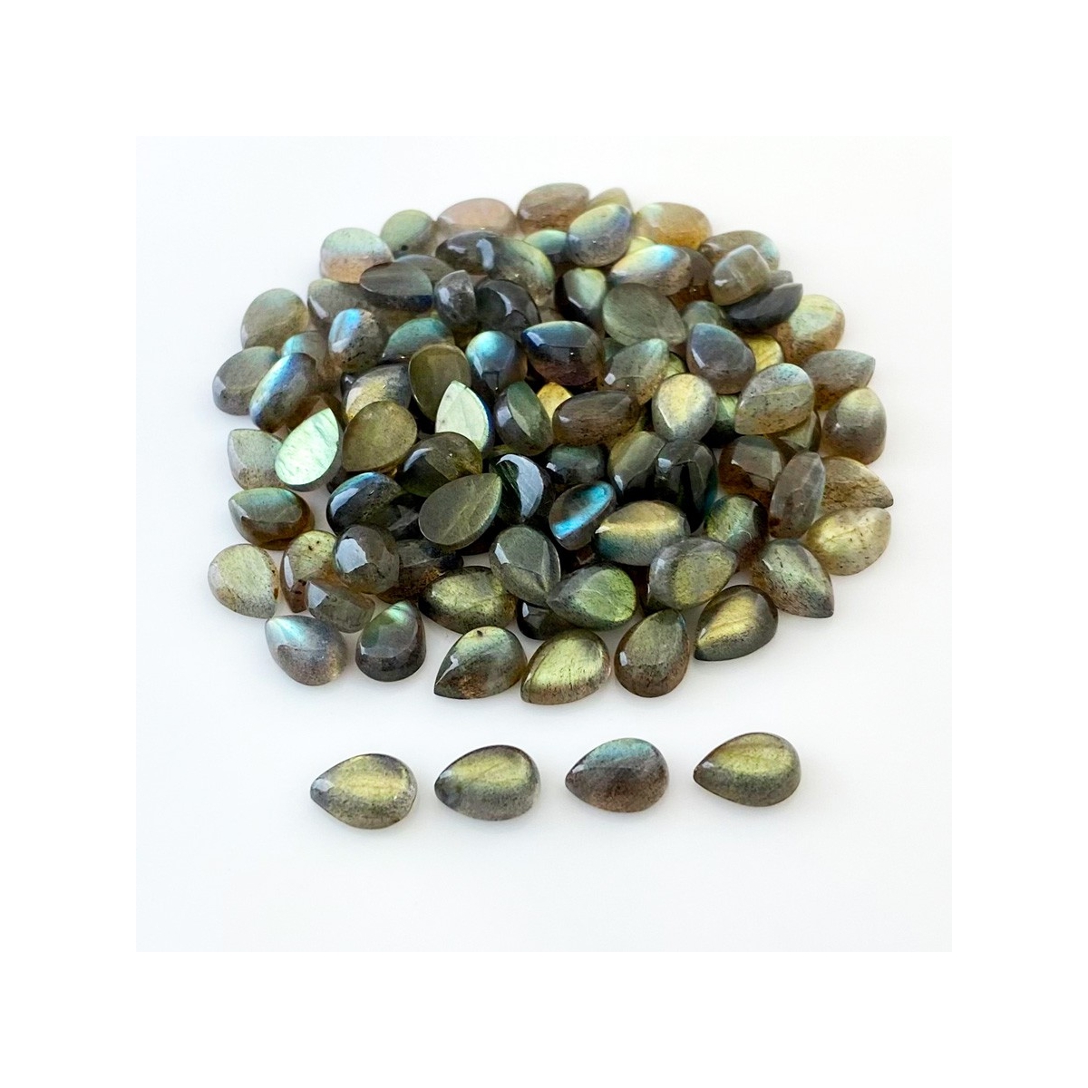 Buy This "B" Grade 10x7mm Smooth Pear Shape Natural Labradorite (Un-Treated) Cabochons Parcel. You Will Receive 113 Pcs. With a Total Weight of 245.2 Carat. This Labradorite Stone is Originated From Africa and Masterfully Handcrafted by The Experienced Artisans of Jaipur (India).