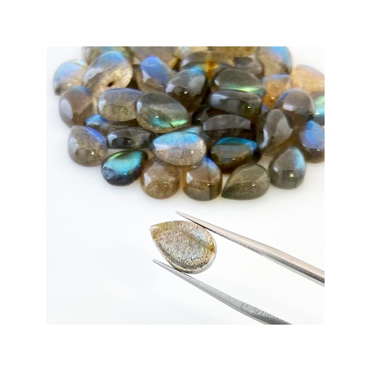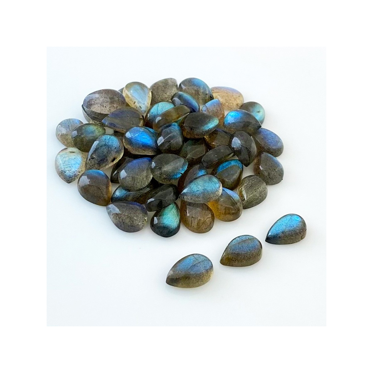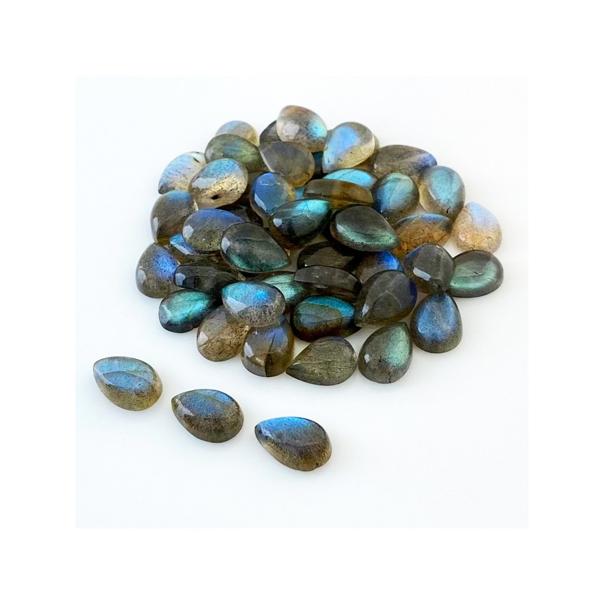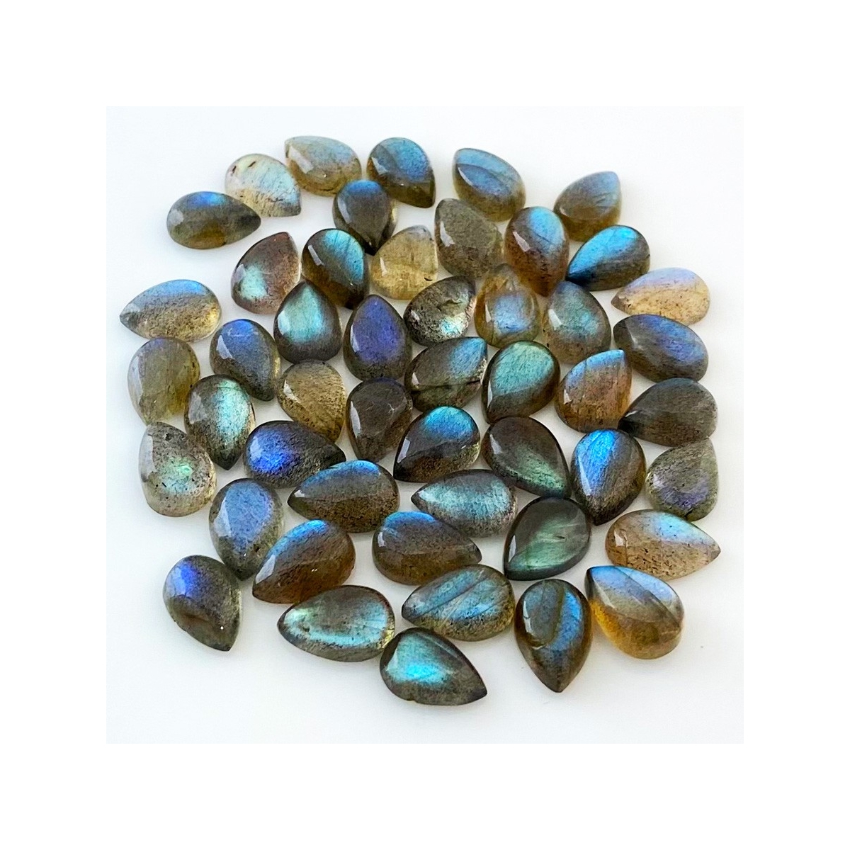 Buy This "AA" Grade 12x8mm Smooth Pear Shape Natural Labradorite (Un-Treated) Cabochons Parcel. You Will Receive 49 Pcs. With a Total Weight of 149.8 Carat. This Labradorite Stone is Originated From Africa and Masterfully Handcrafted by The Experienced Artisans of Jaipur (India).