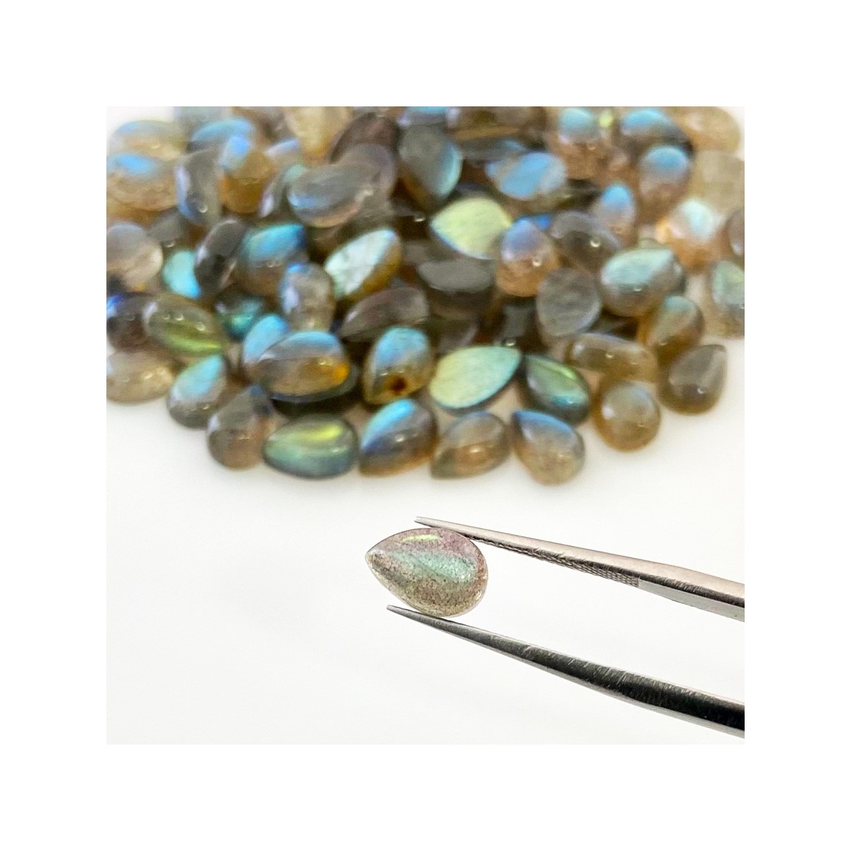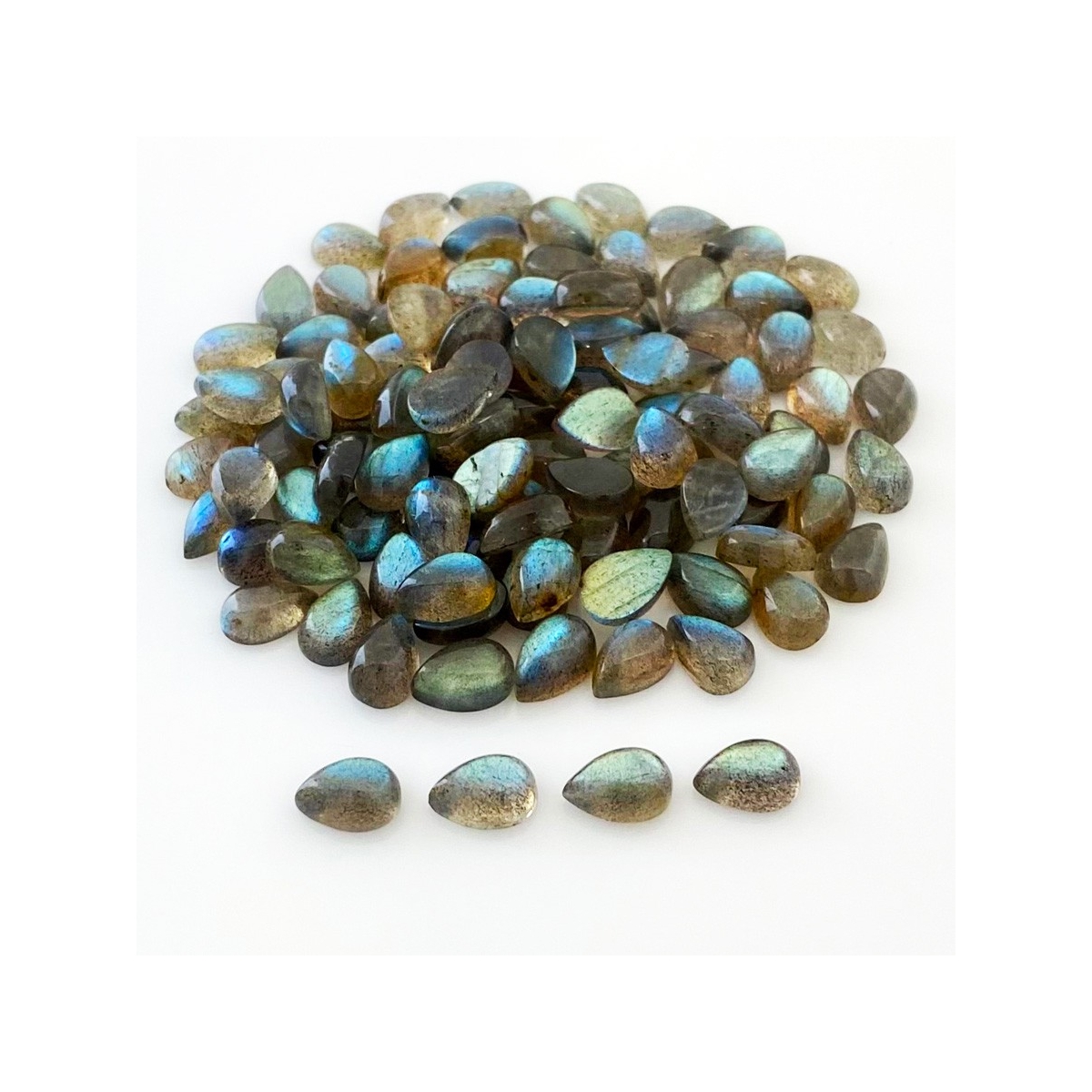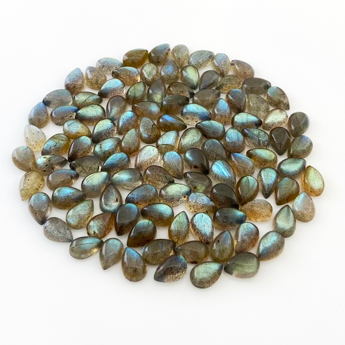 Buy This "A" Grade 9x6mm Smooth Pear Shape Natural Labradorite (Un-Treated) Cabochons Parcel. You Will Receive 136 Pcs. With a Total Weight of 204.25 Carat. This Labradorite Stone is Originated From Africa and Masterfully Handcrafted by The Experienced Artisans of Jaipur (India).