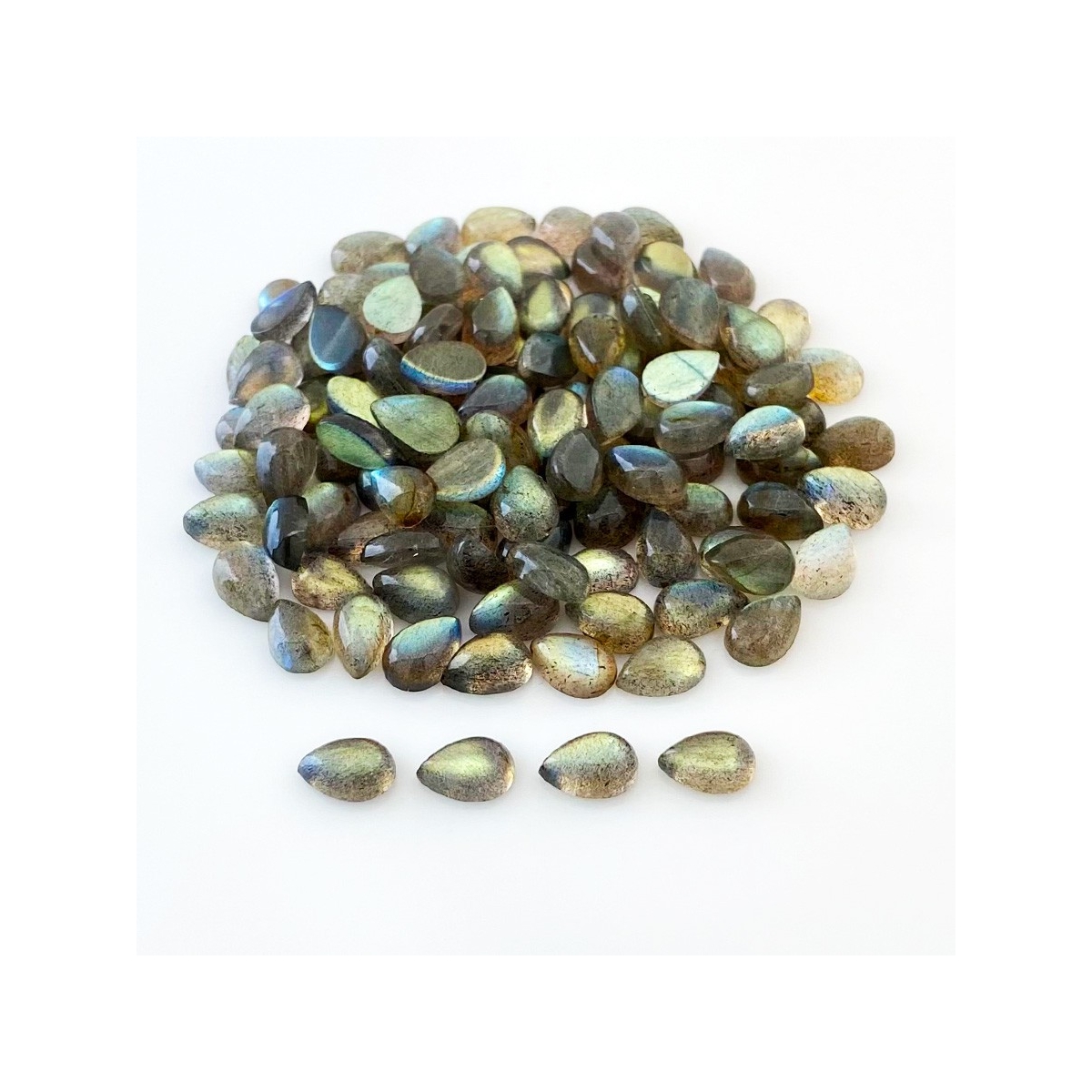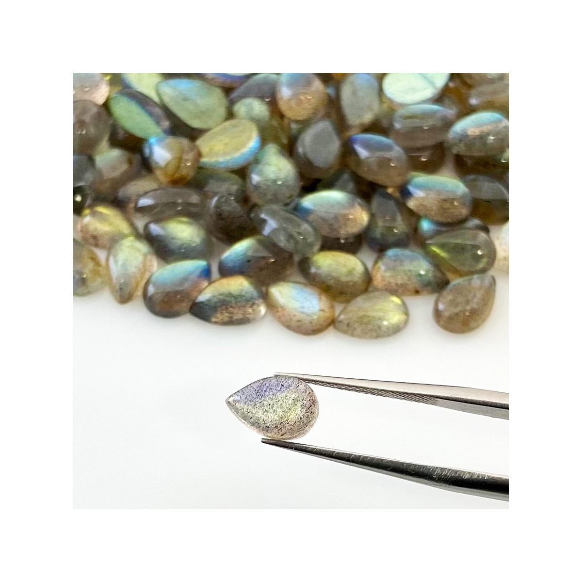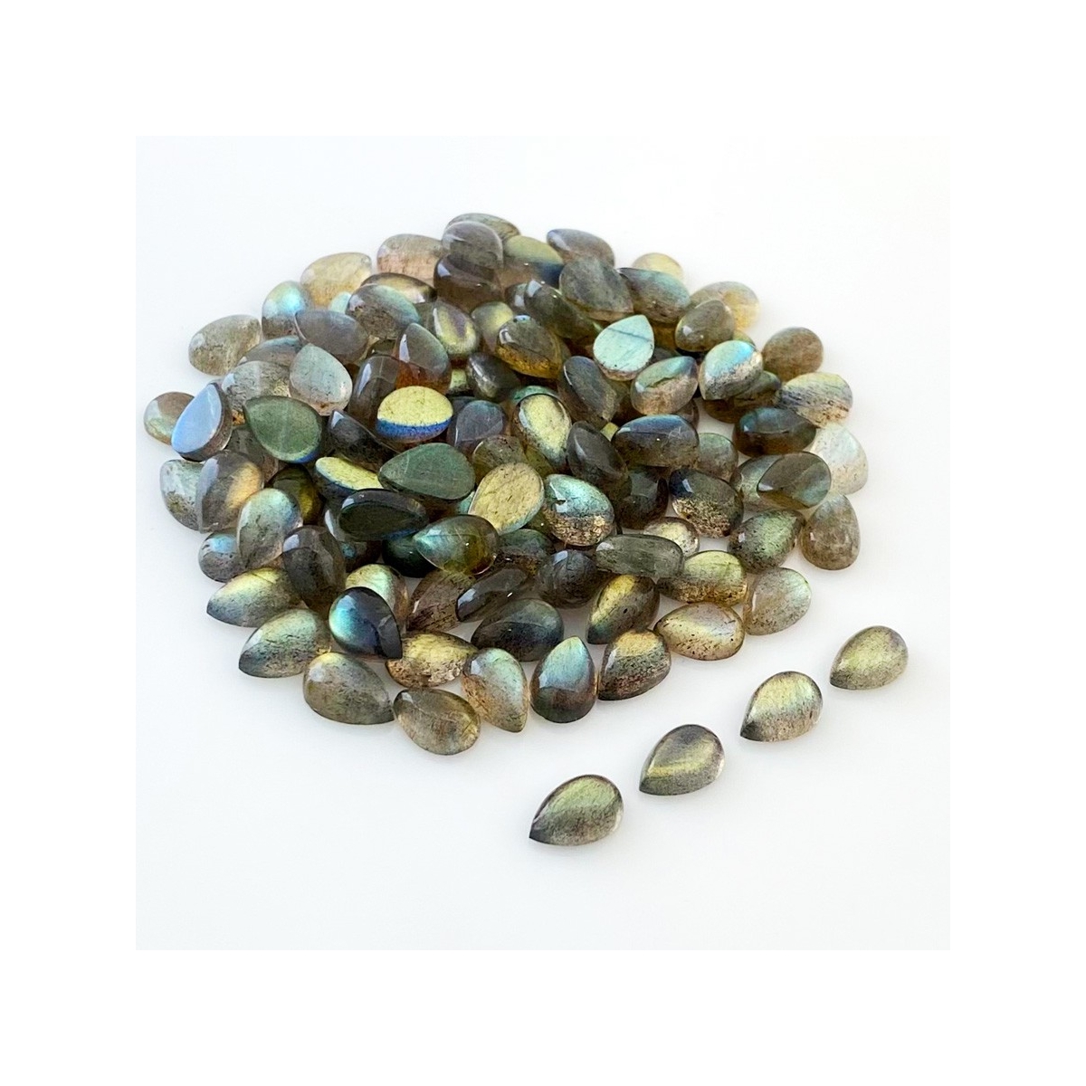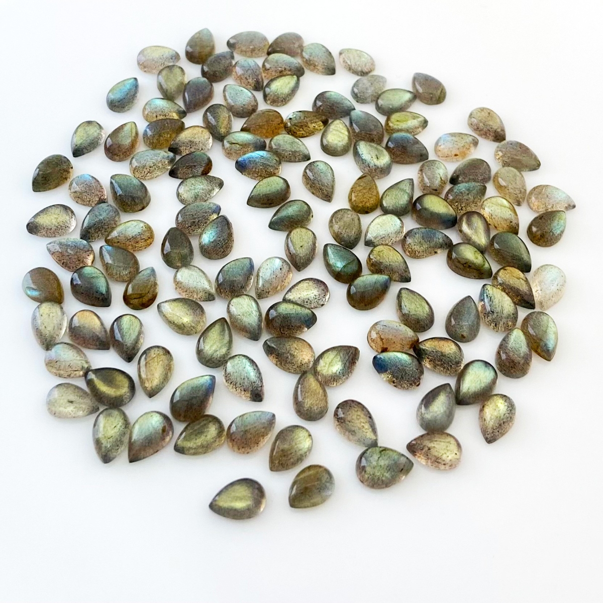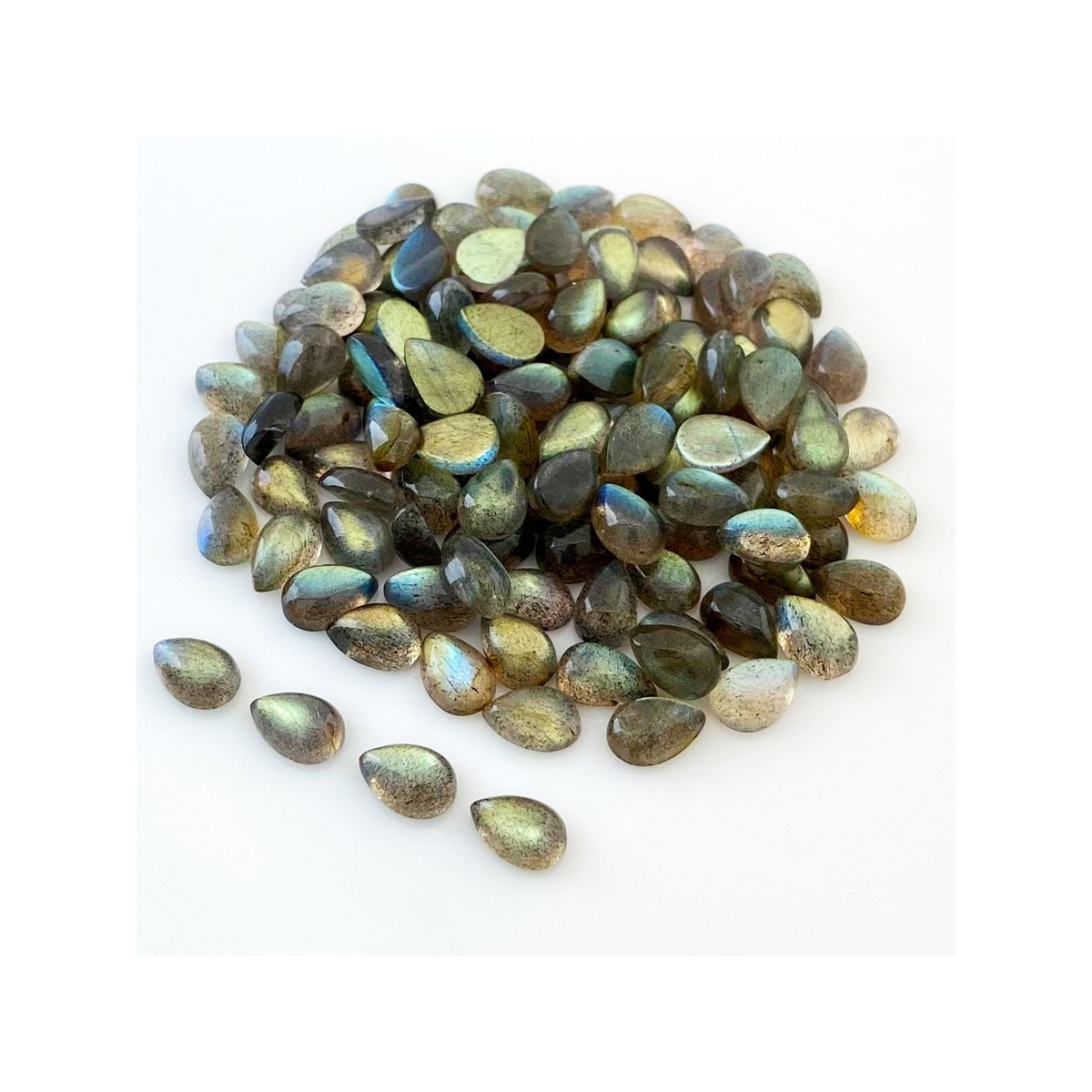 Buy This "A" Grade 9x6mm Smooth Pear Shape Natural Labradorite (Un-Treated) Cabochons Parcel. You Will Receive 121 Pcs. With a Total Weight of 176.2 Carat. This Labradorite Stone is Originated From Africa and Masterfully Handcrafted by The Experienced Artisans of Jaipur (India).