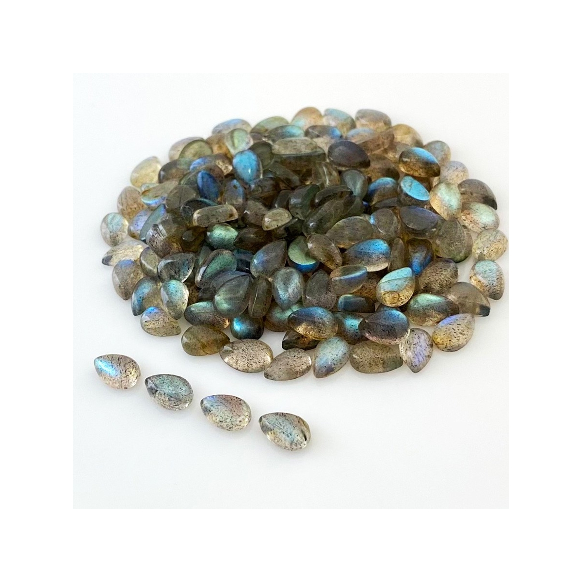 Buy This "A" Grade 8x5mm Smooth Pear Shape Natural Labradorite (Un-Treated) Cabochons Parcel. You Will Receive 156 Pcs. With a Total Weight of 150.65 Carat. This Labradorite Stone is Originated From Africa and Masterfully Handcrafted by The Experienced Artisans of Jaipur (India).