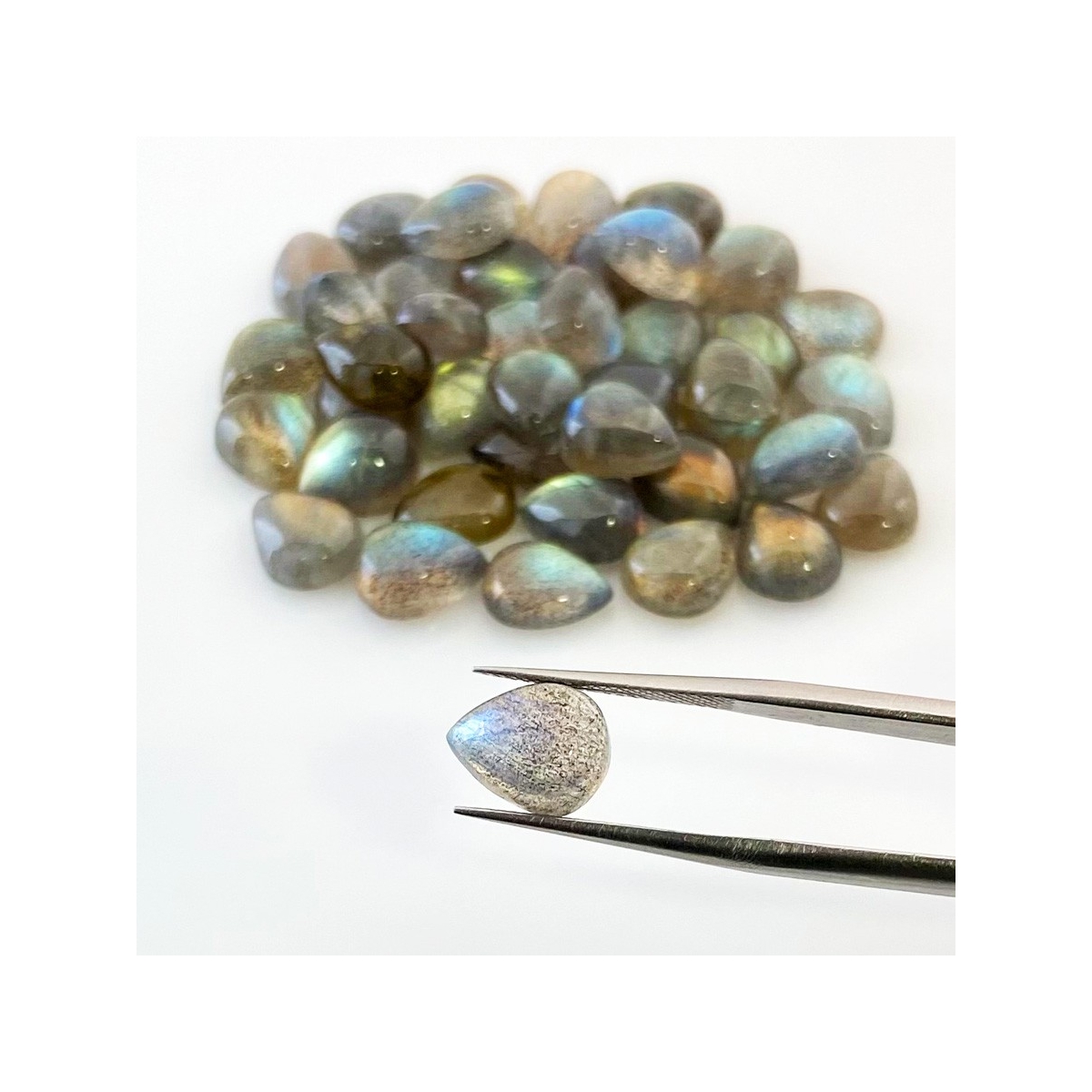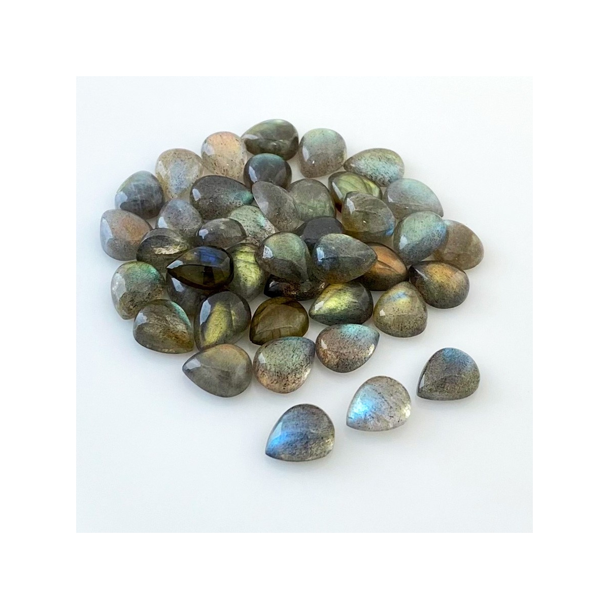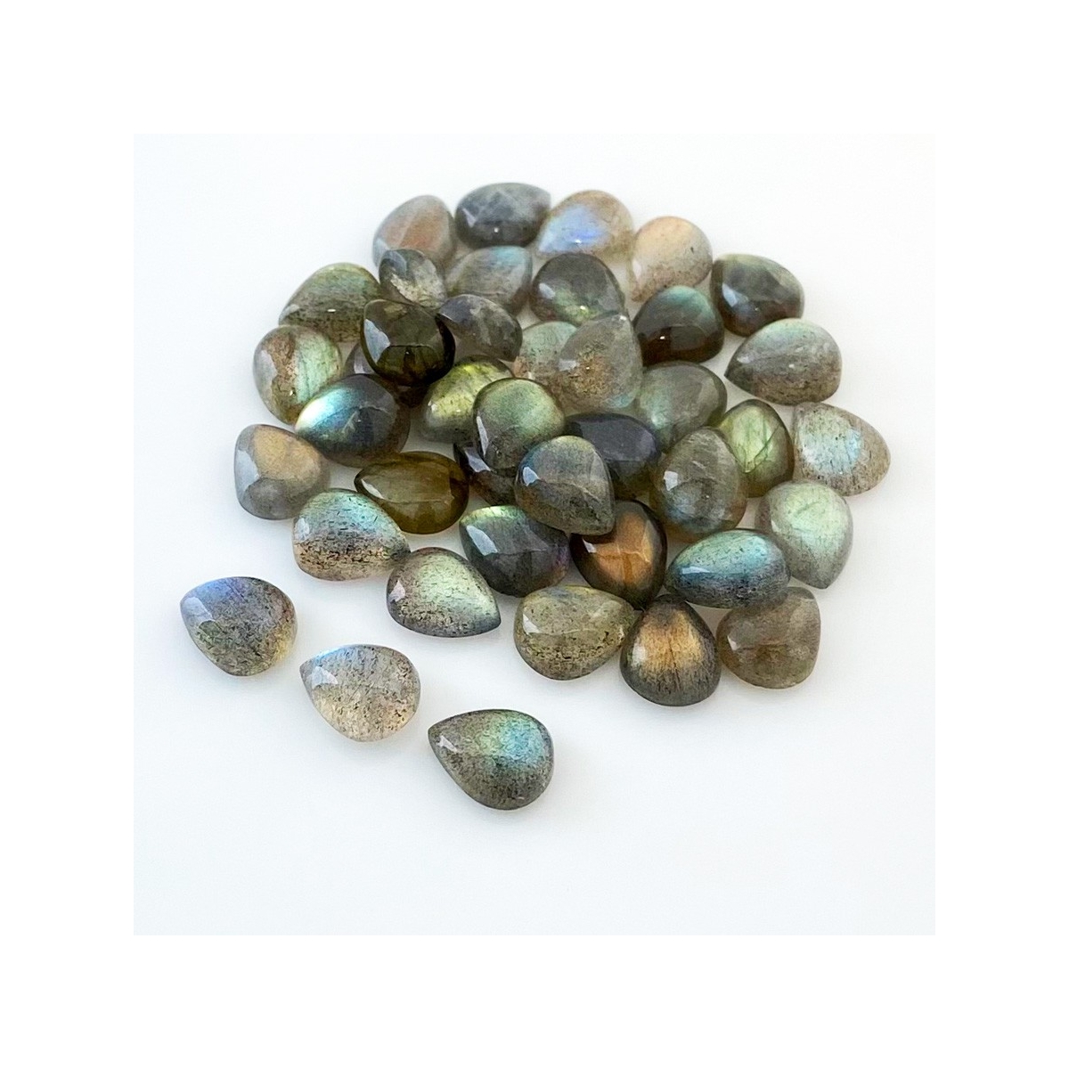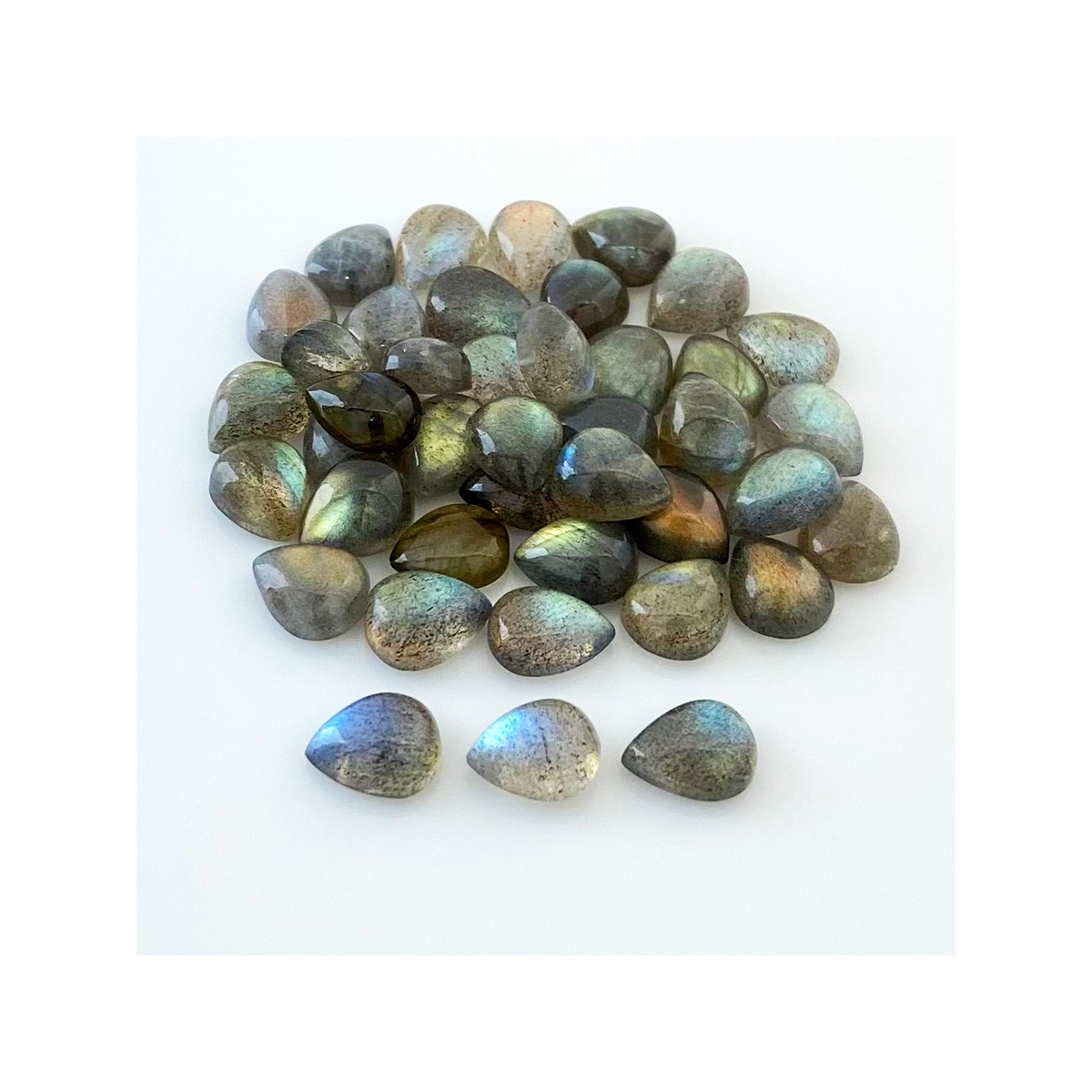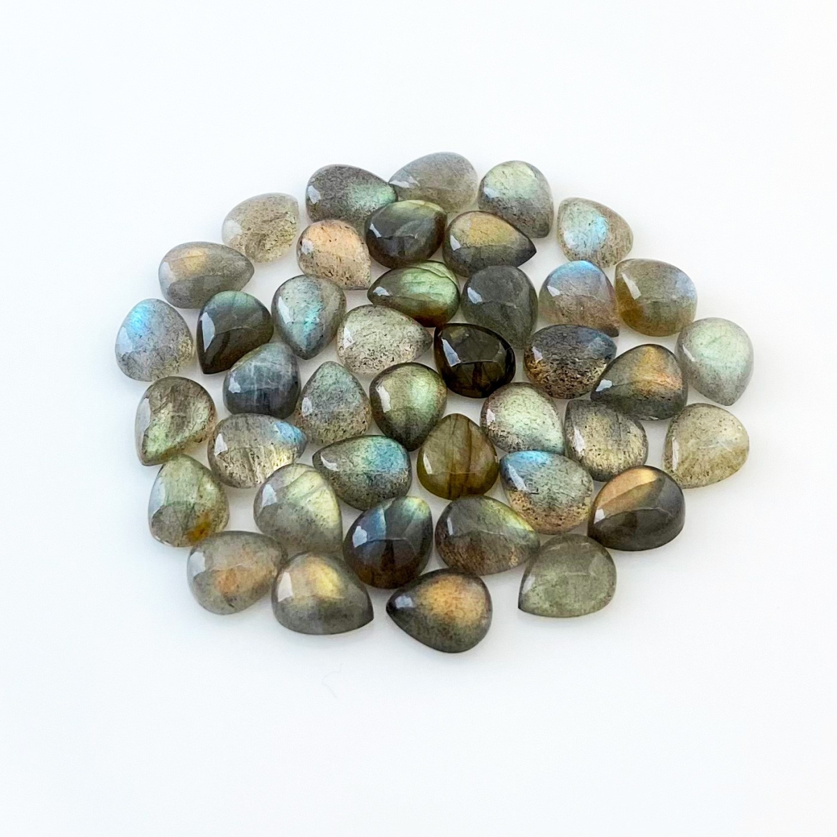 Buy This "AA" Grade 10x8mm Smooth Pear Shape Natural Labradorite (Un-Treated) Cabochons Parcel. You Will Receive 41 Pcs. With a Total Weight of 97 Carat. This Labradorite Stone is Originated From Africa and Masterfully Handcrafted by The Experienced Artisans of Jaipur (India).
