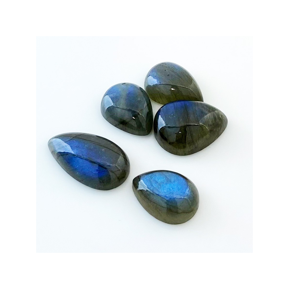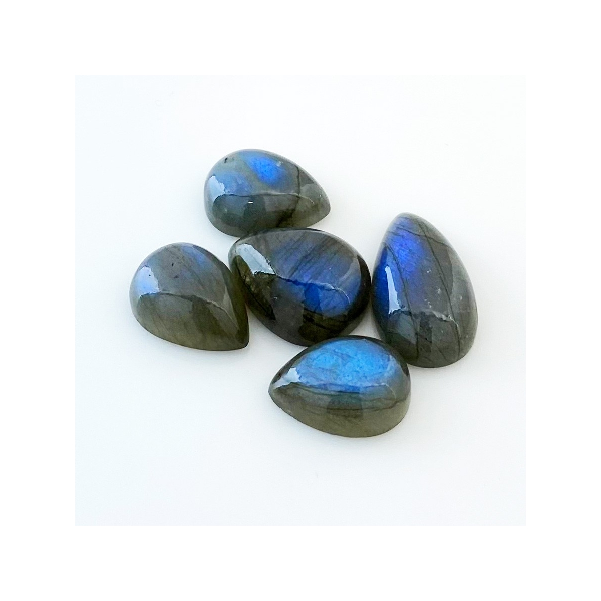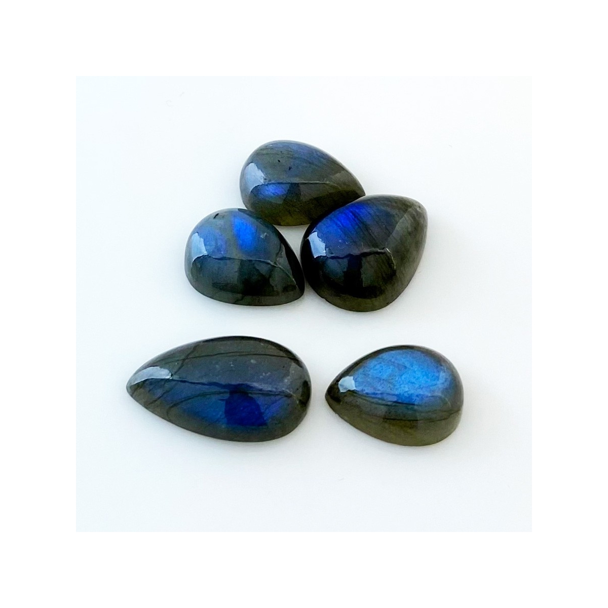 Buy This "AA" Grade 19x14-26x15mm Smooth Pear Shape Natural Labradorite (Un-Treated) Cabochons Parcel. You Will Receive 5 Pcs. With a Total Weight of 91.5 Carat. This Labradorite Stone is Originated From Africa and Masterfully Handcrafted by The Experienced Artisans of Jaipur (India).