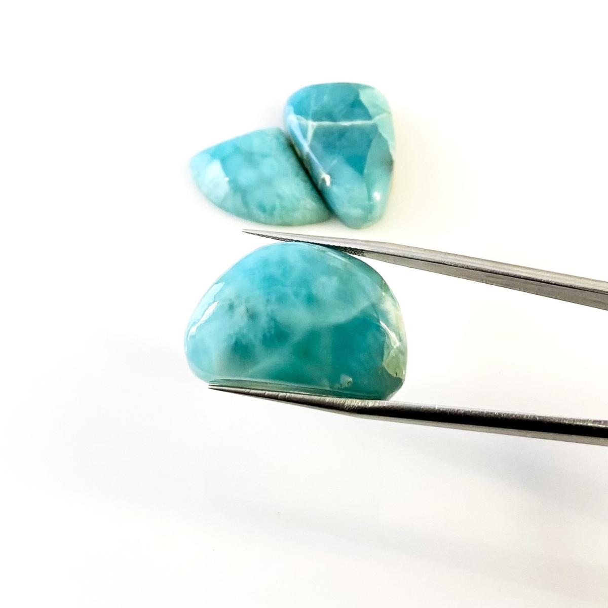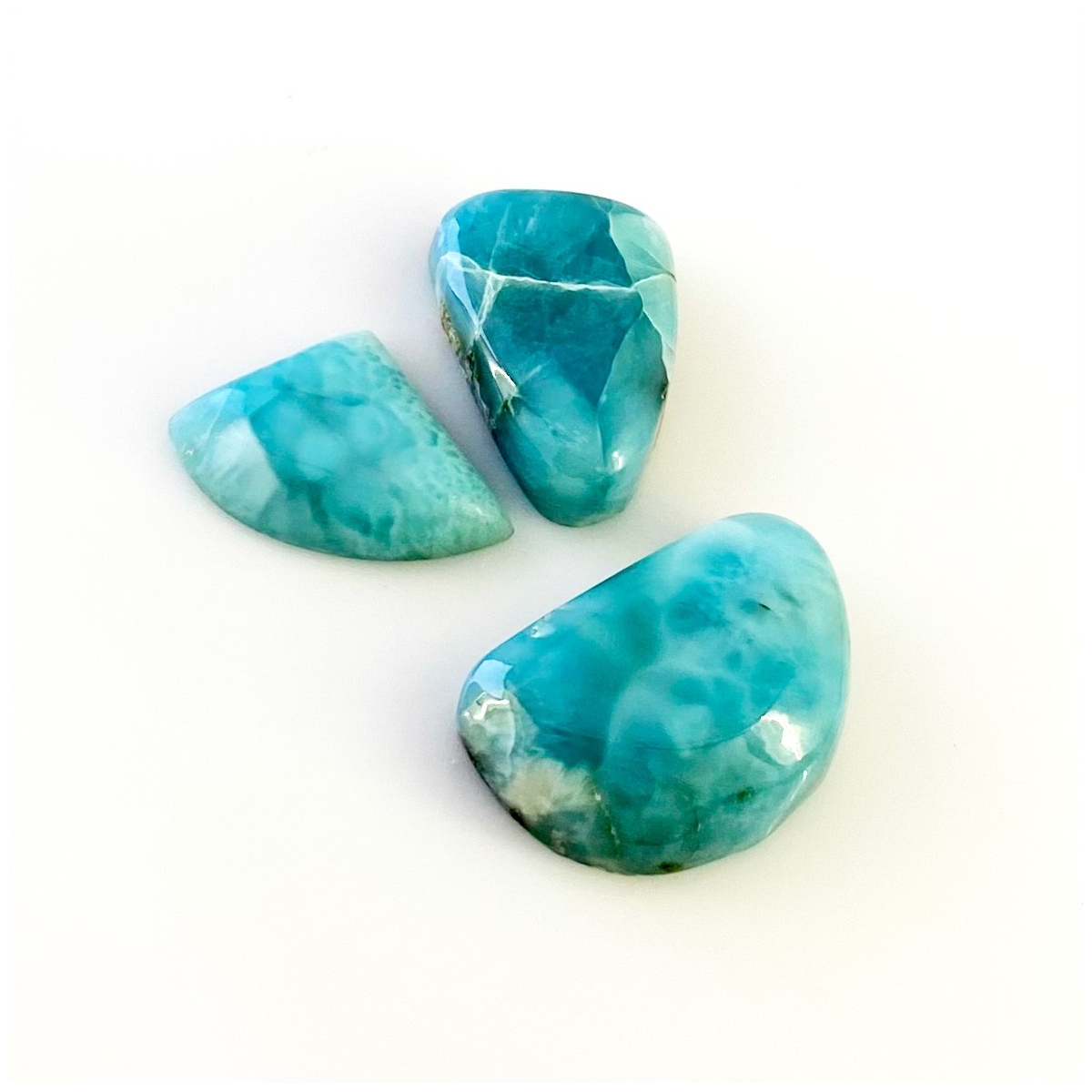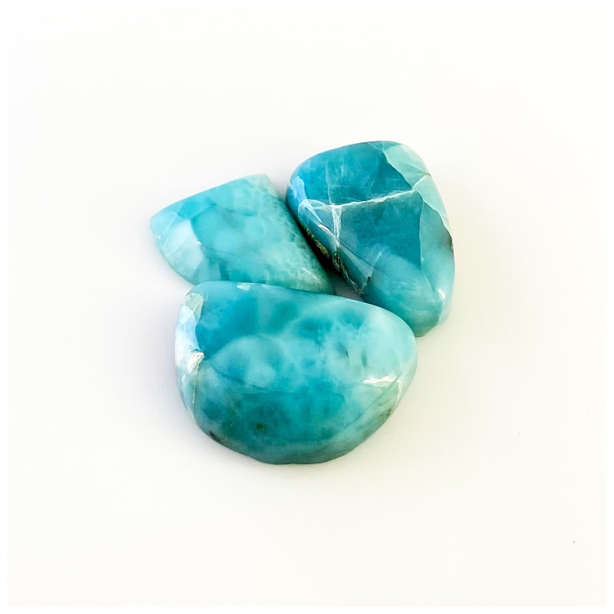 Buy This "AA" Grade 23x17-16x17.5mm Smooth Fancy Shape Natural Larimar (Un-Treated) Cabochons Parcel. You Will Receive 3 Pcs. With a Total Weight of 76.6 Carat. This Larimar Stone is Originated From Domonica and Masterfully Handcrafted by The Experienced Artisans of Jaipur (India).