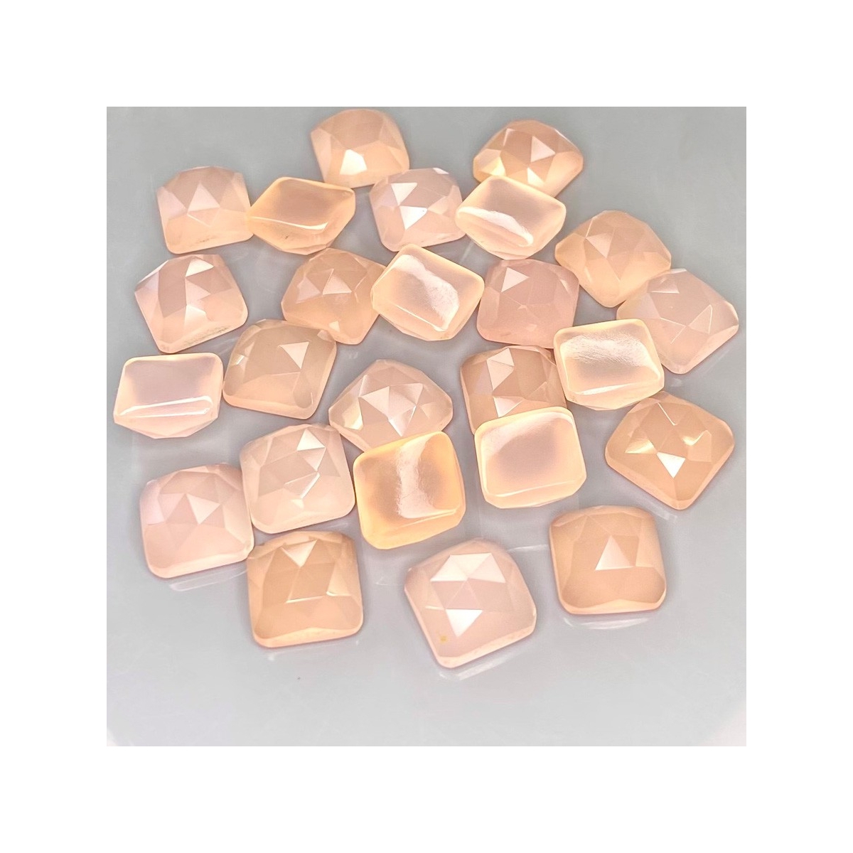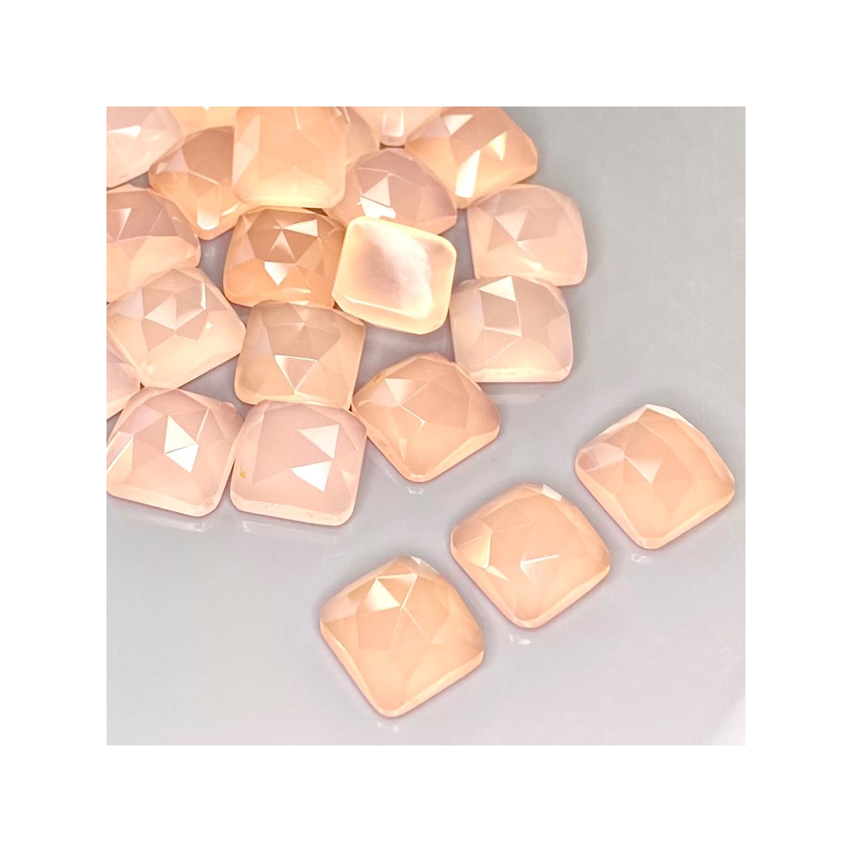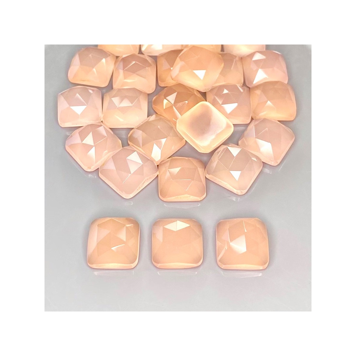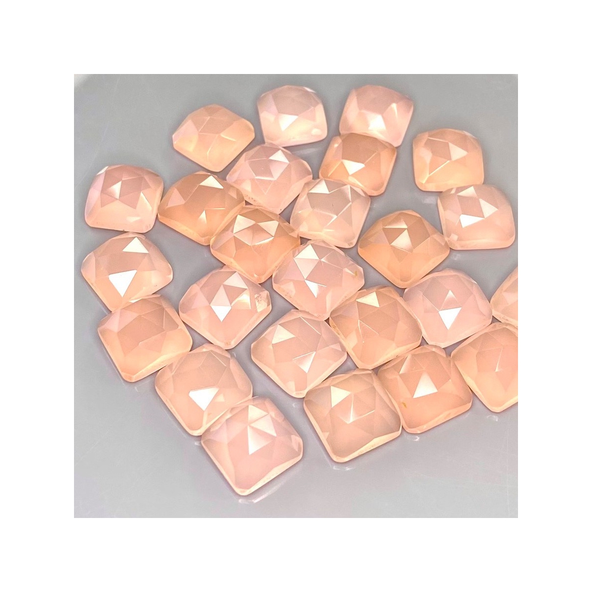 Buy This "AAA" Grade 10mm Rose Cut Square Cushion Shape Natural Pink Chalcedony (Dyed) Cabochons Parcel. You Will Receive 25 Pcs. With a Total Weight of 129.40 Cts.. This Pink Chalcedony Stone is Originated From India and Masterfully Handcrafted by The Experienced Artisans of Jaipur (India).