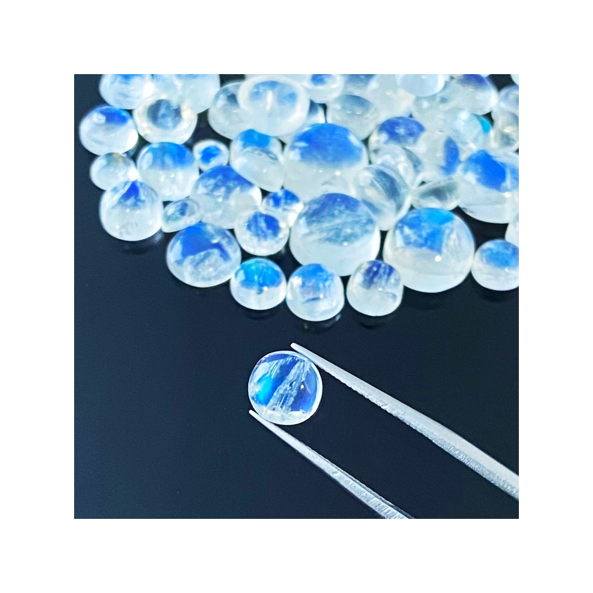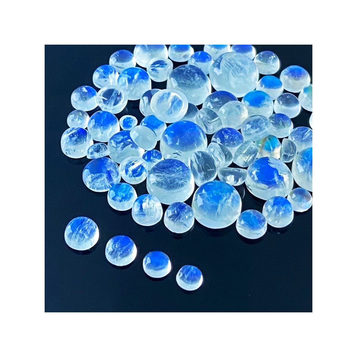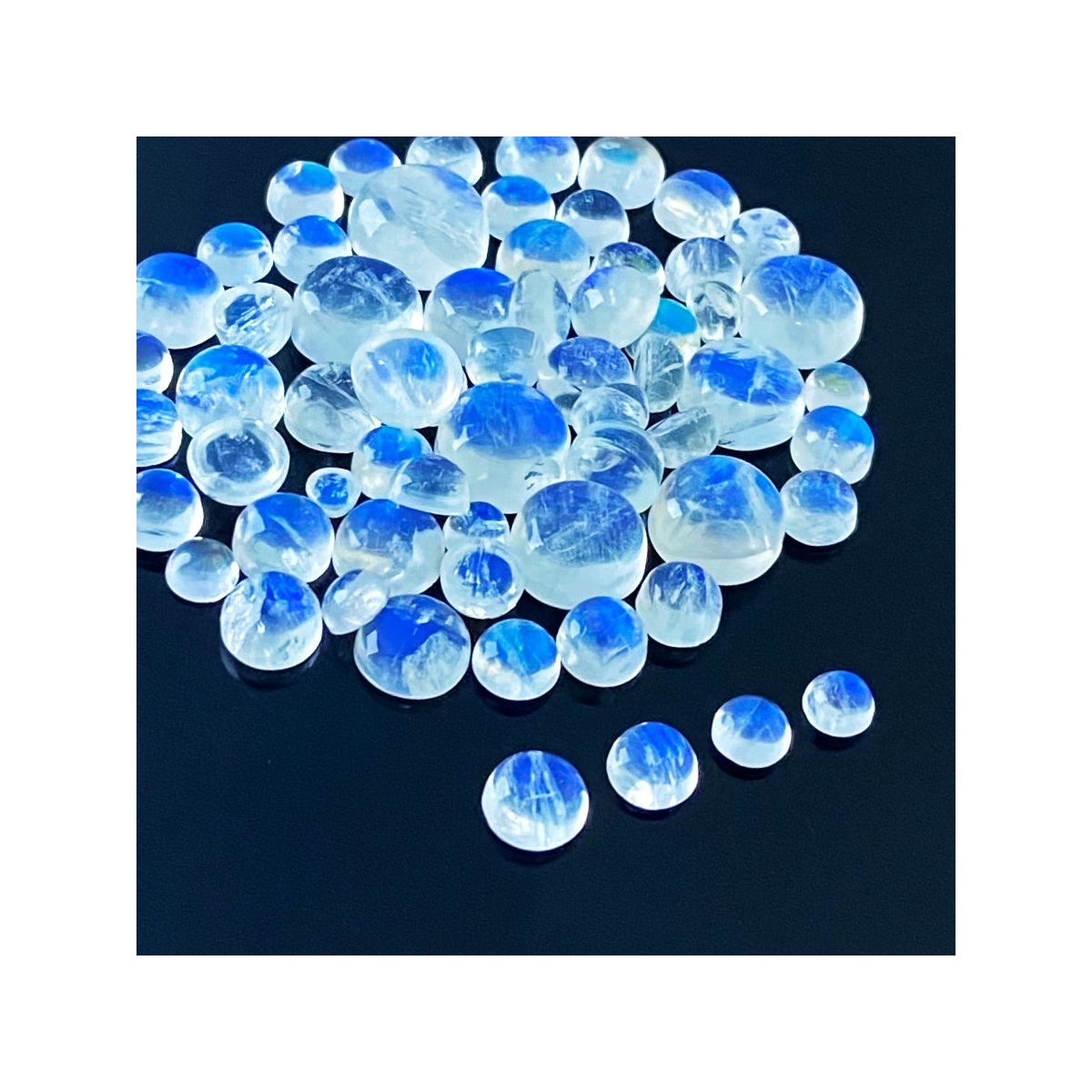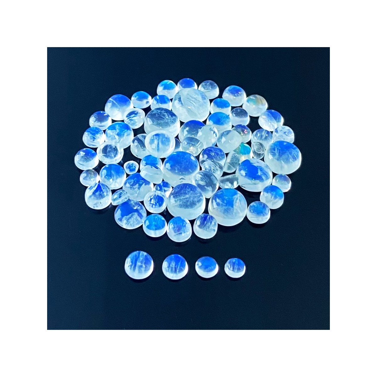 Buy This "AAA" Grade 3.5-11mm Smooth Round Shape Natural Rainbow Moonstone (Un-Treated) Cabochons Parcel. You Will Receive 63 Pcs. With a Total Weight of 103.40 Cts.. This Rainbow Moonstone Stone is Originated From India and Masterfully Handcrafted by The Experienced Artisans of Jaipur (India).