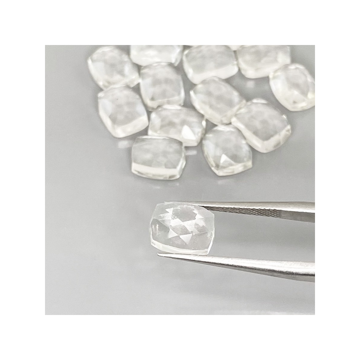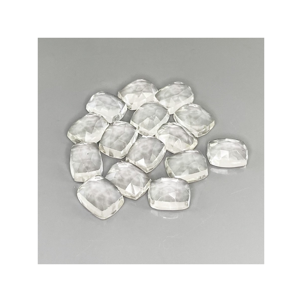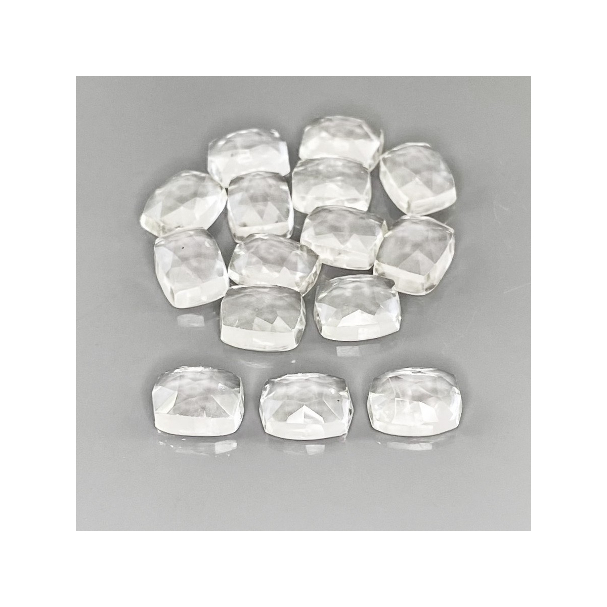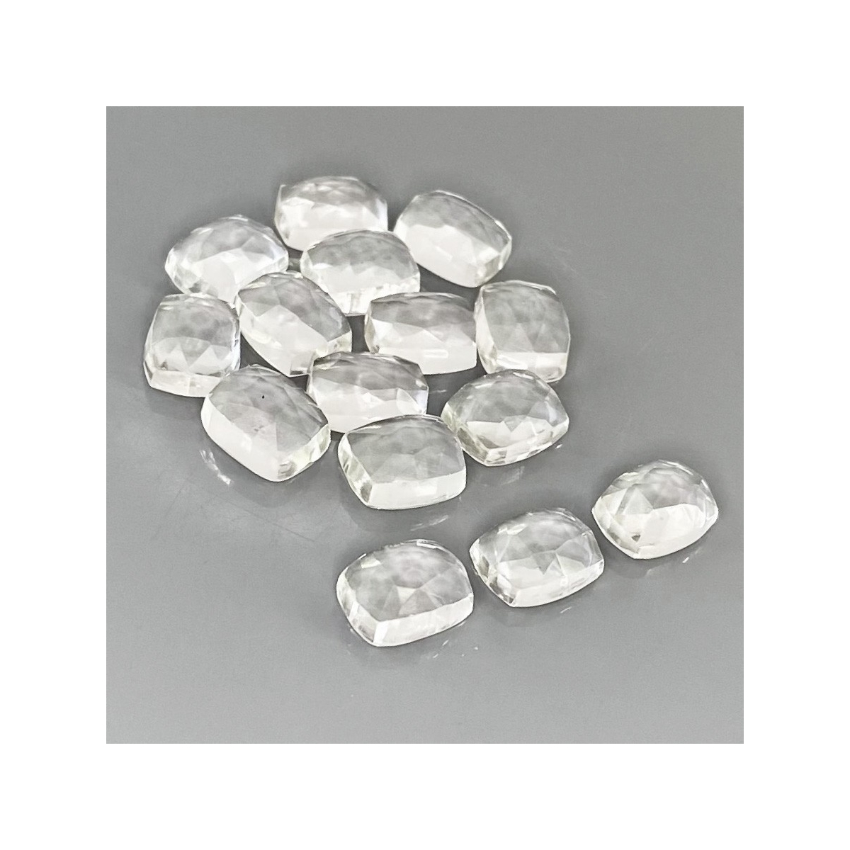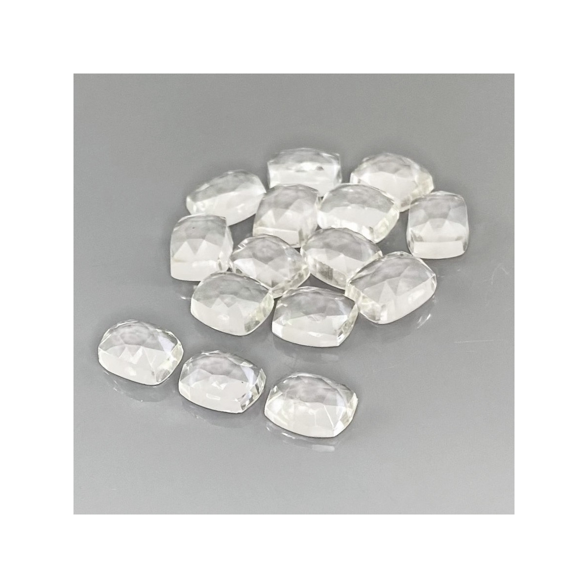 Buy This "AAA" Grade 9x7mm Rose Cut Cushion Shape Natural White Topaz (Un-Treated) Cabochons Parcel. You Will Receive 15 Pcs. With a Total Weight of 43.65 Cts.. This White Topaz Stone is Originated From Brazil and Masterfully Handcrafted by The Experienced Artisans of Jaipur (India).