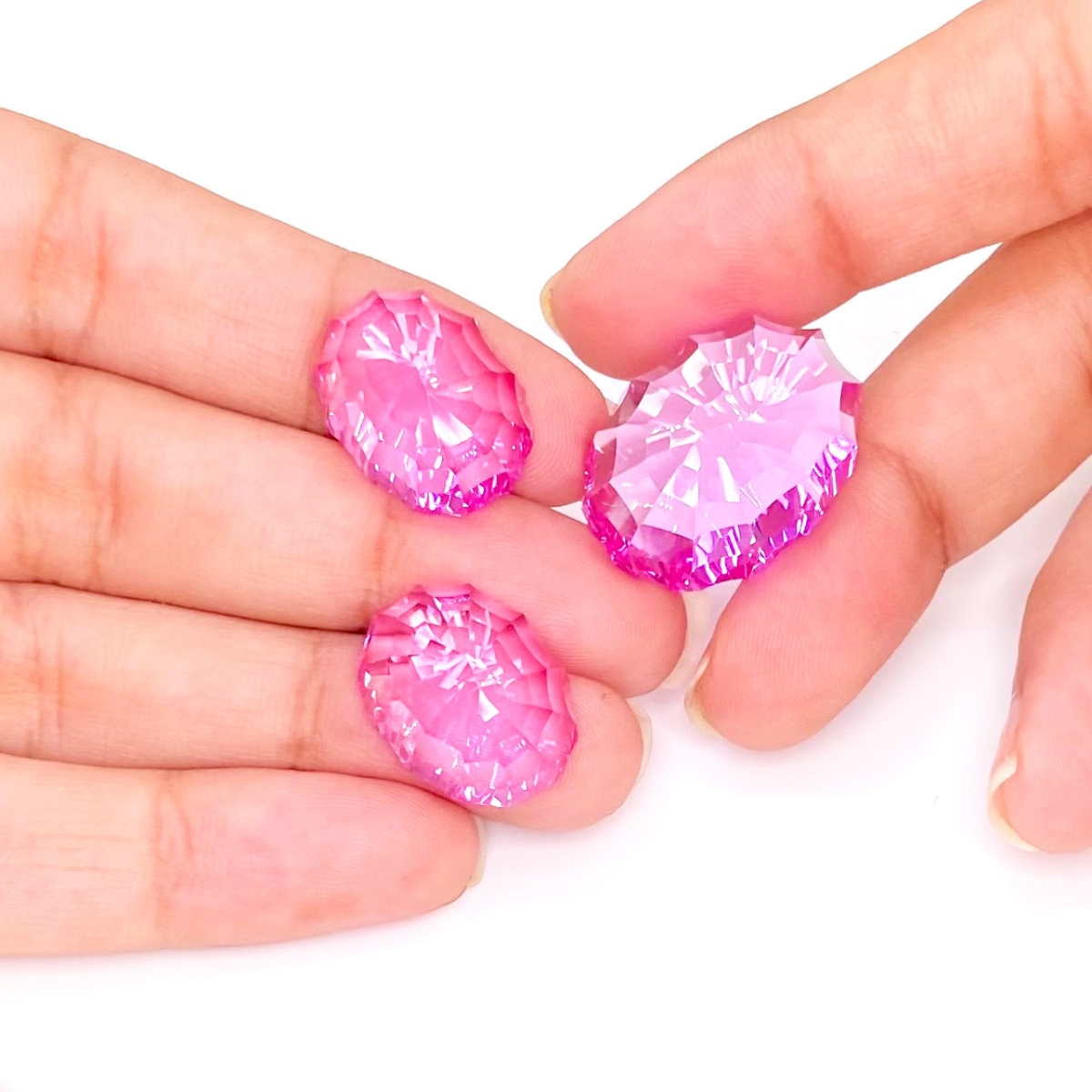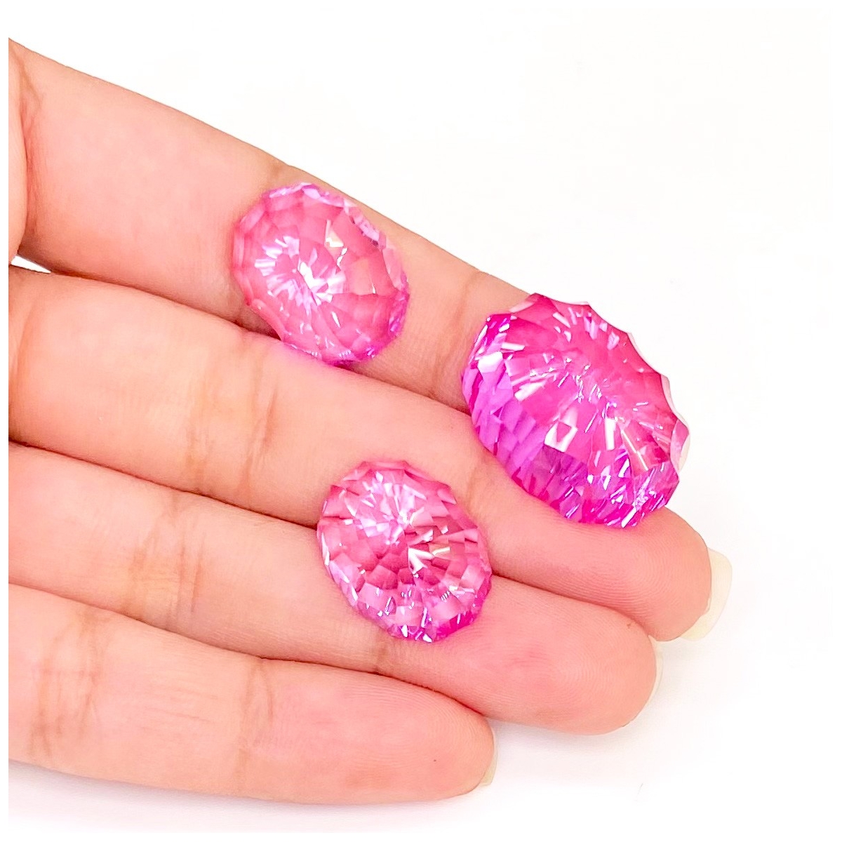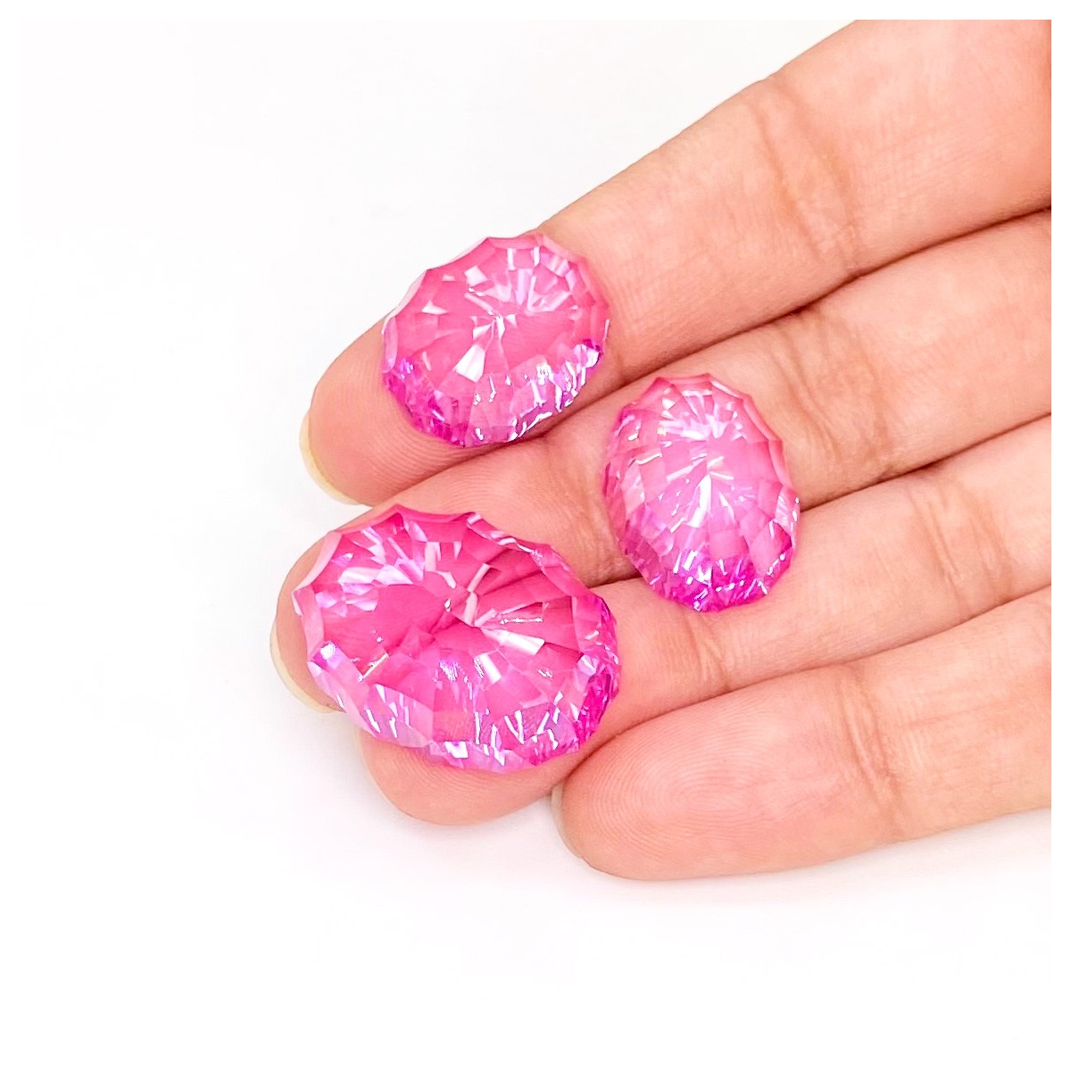 Buy This "AAA" Grade 23x17-17.5x13.5mm Concave Cut Oval Shape Created Lab Pink Sapphire (Lab Grown) Matched Cabochons Set. You Will Receive 3 Pcs. With a Total Weight of 76.75 Carat. This Lab Pink Sapphire Stone is Originated From Russia and Masterfully Handcrafted by The Experienced Artisans of Jaipur (India).