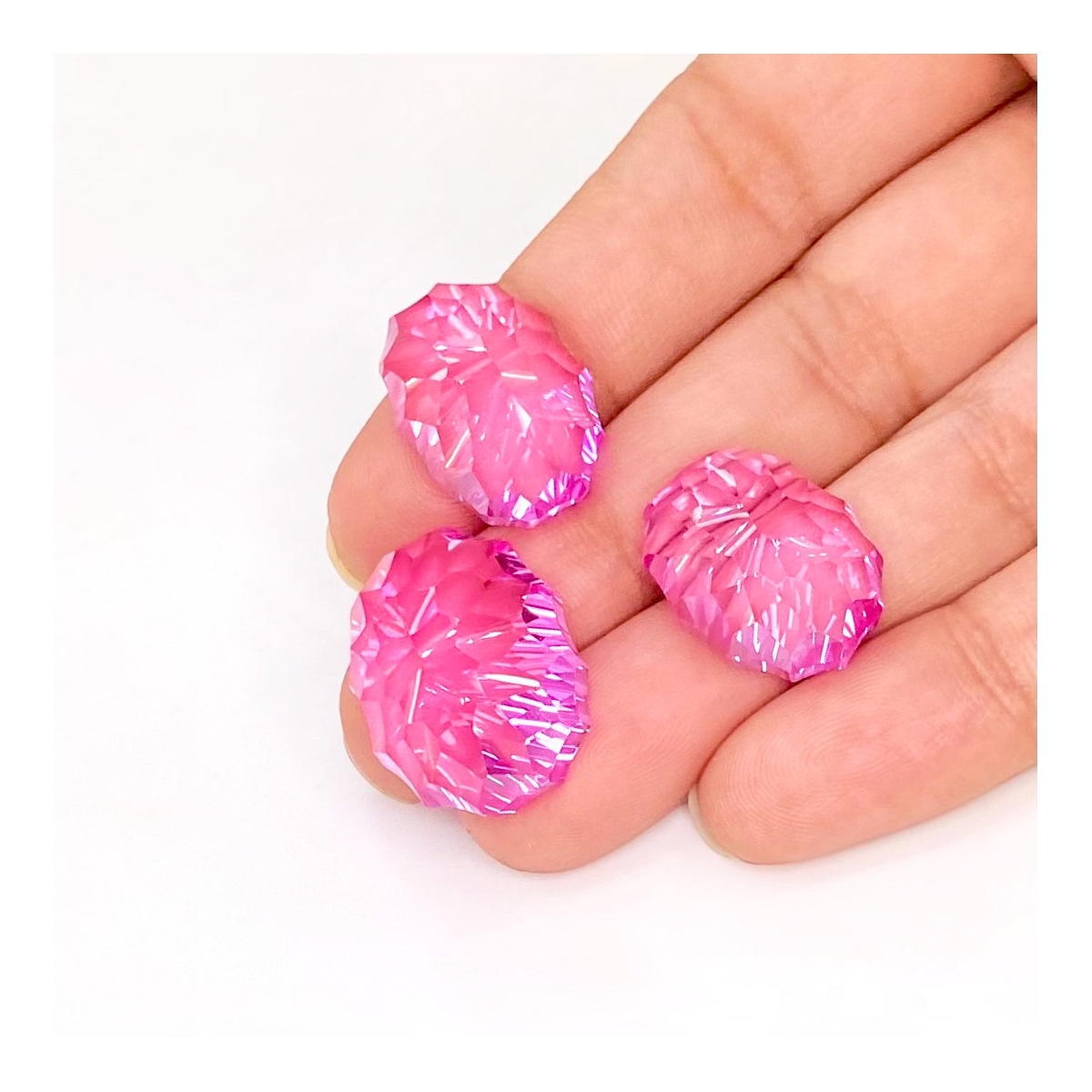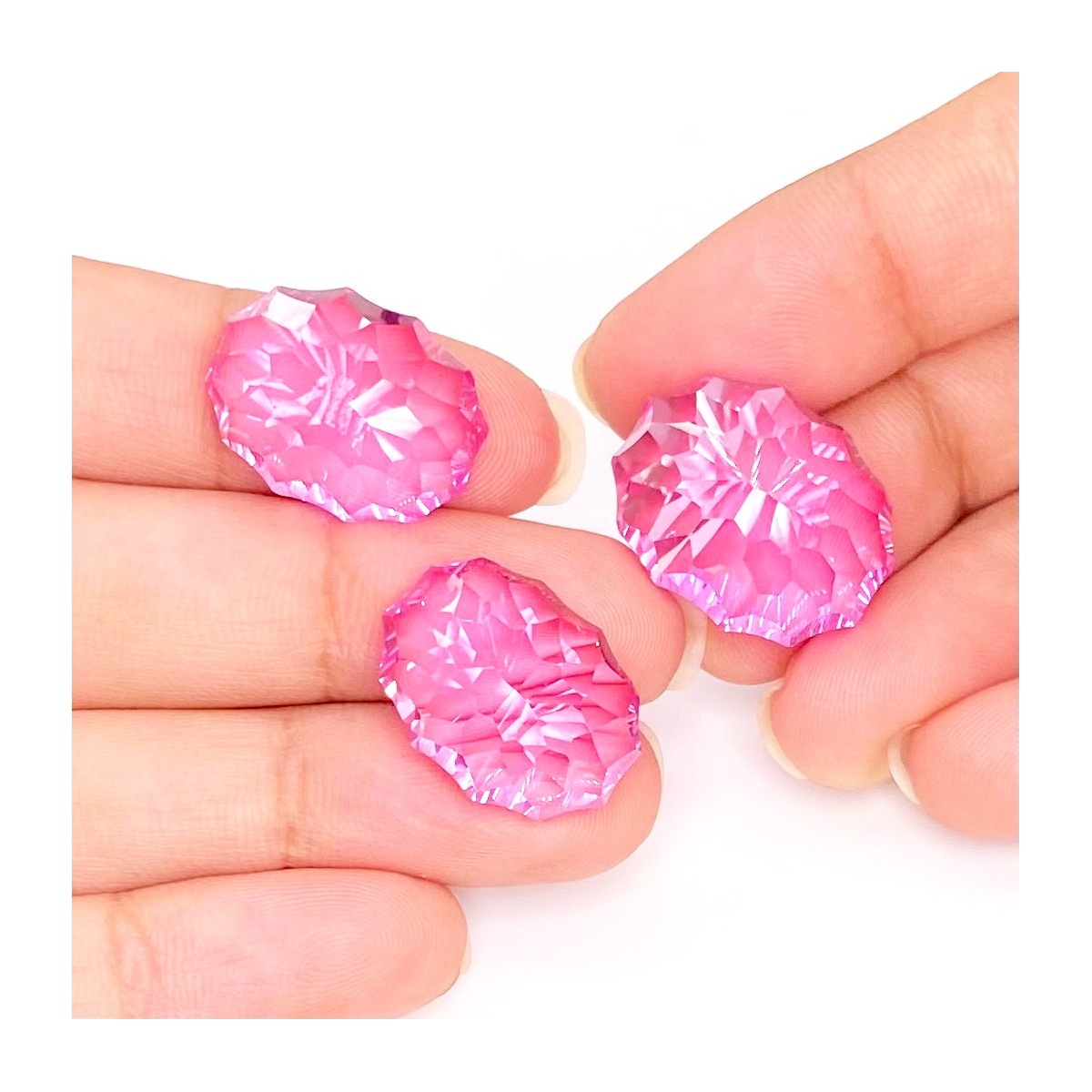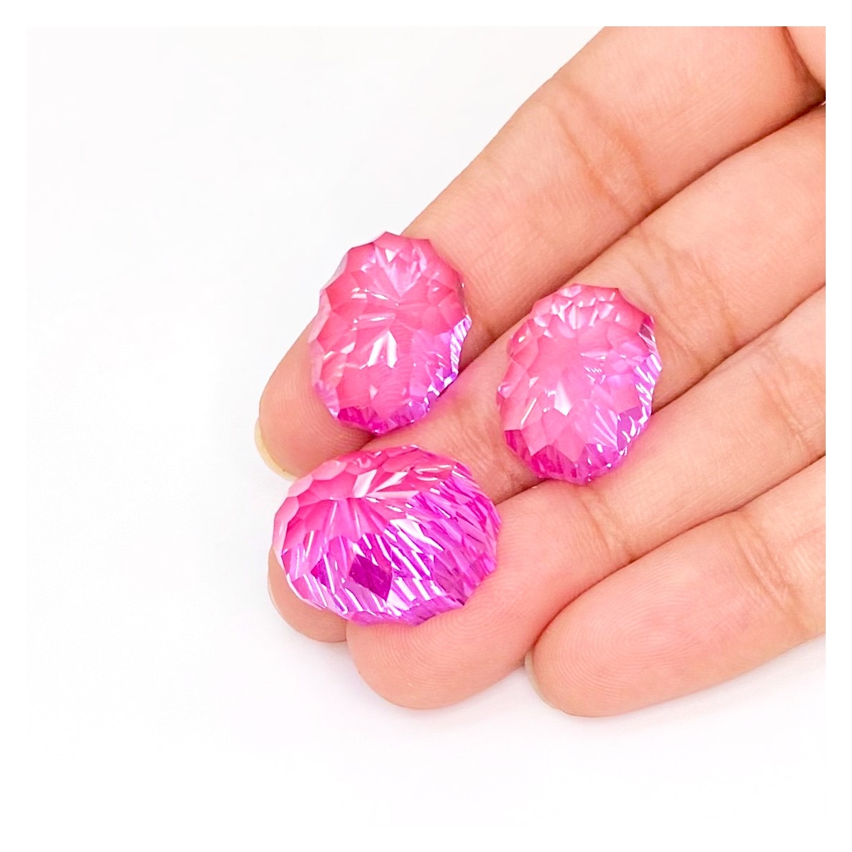 Buy This "AAA" Grade 18x14-20x16mm Concave Cut Oval Shape Created Lab Pink Sapphire (Lab Grown) Matched Cabochons Set. You Will Receive 3 Pcs. With a Total Weight of 88.45 Carat. This Lab Pink Sapphire Stone is Originated From Russia and Masterfully Handcrafted by The Experienced Artisans of Jaipur (India).