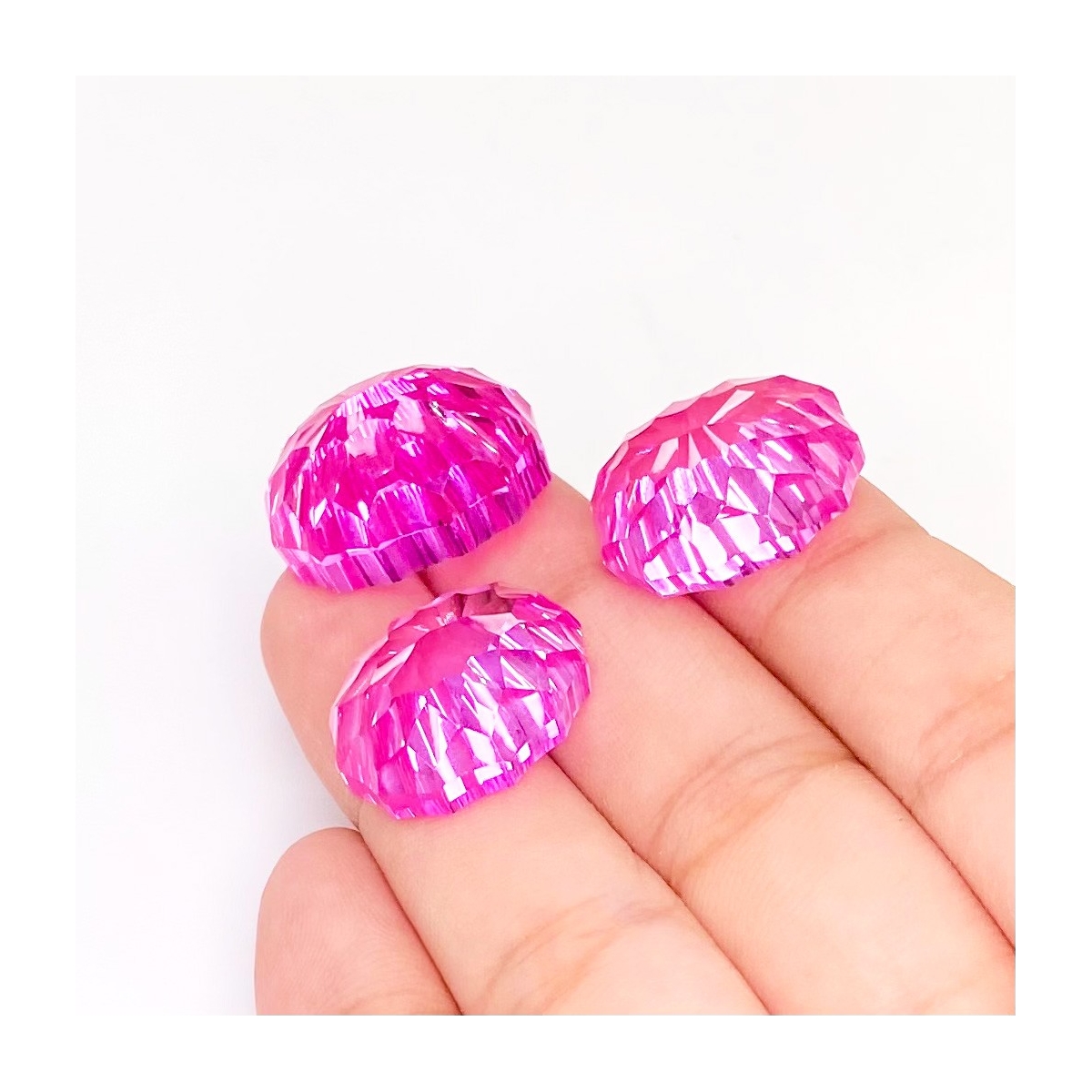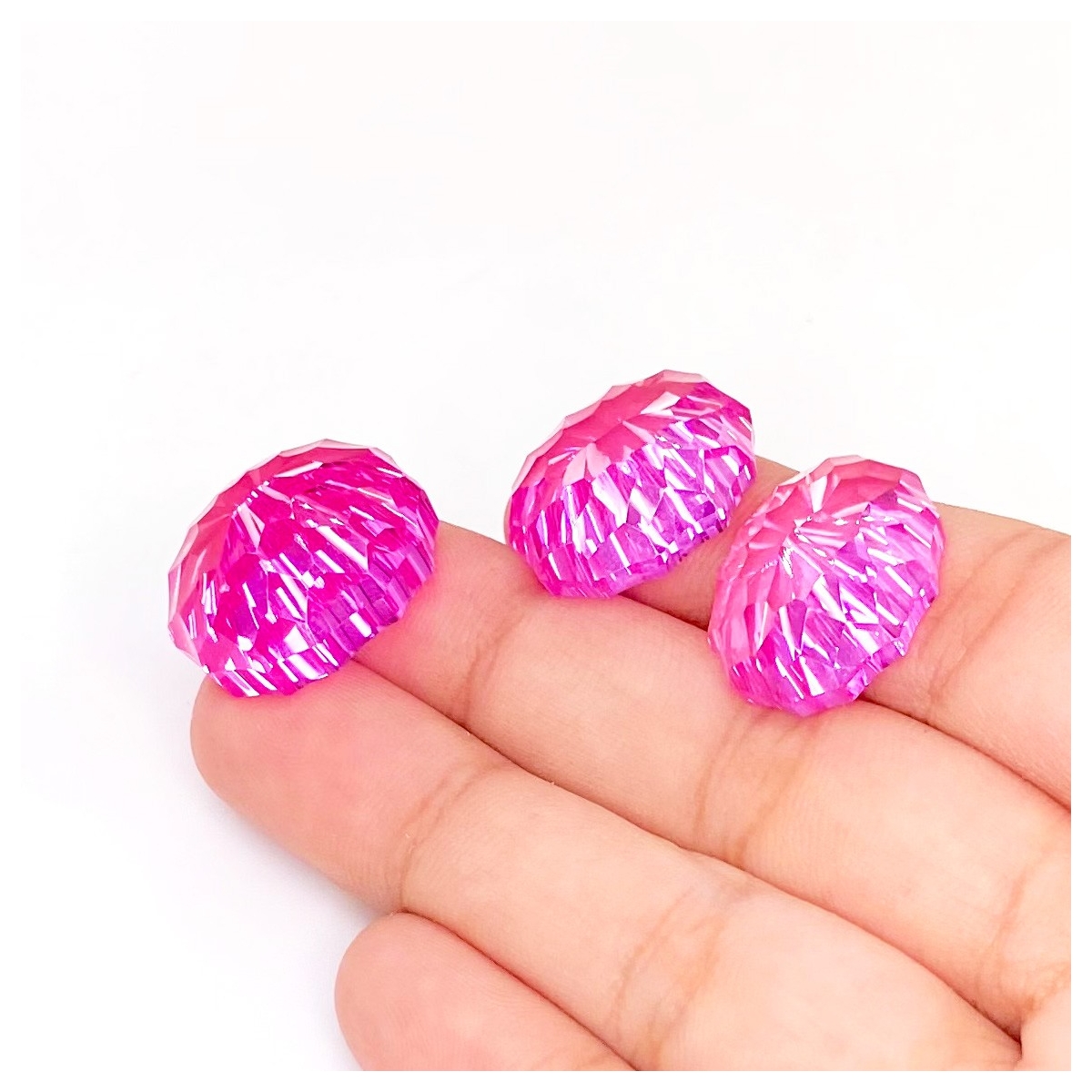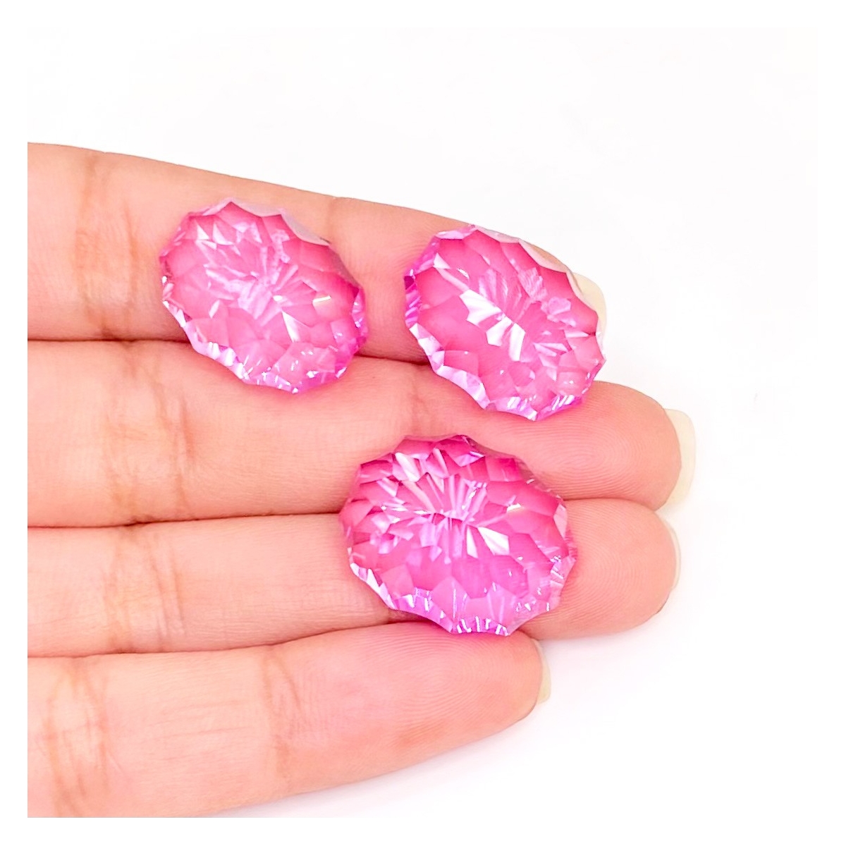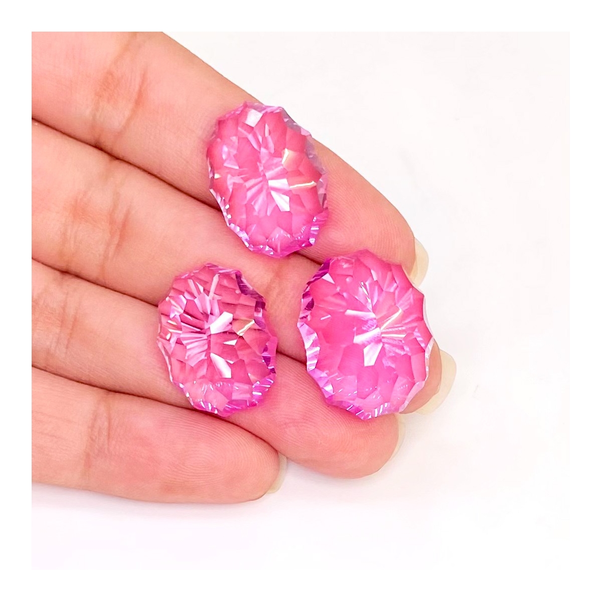 Buy This "AAA" Grade 18x14-20x16mm Concave Cut Oval Shape Created Lab Pink Sapphire (Lab Grown) Matched Cabochons Set. You Will Receive 3 Pcs. With a Total Weight of 88.45 Carat. This Lab Pink Sapphire Stone is Originated From Russia and Masterfully Handcrafted by The Experienced Artisans of Jaipur (India).