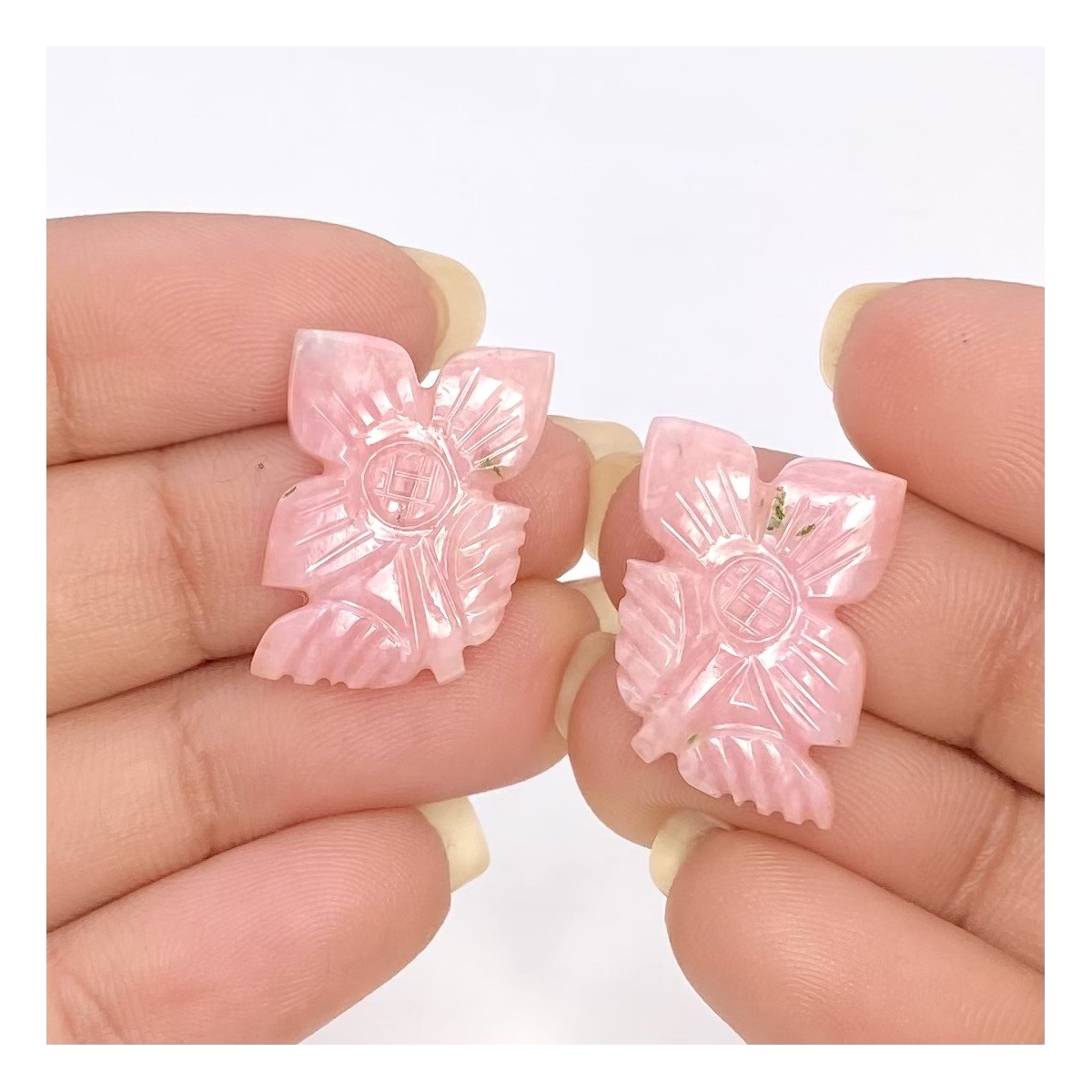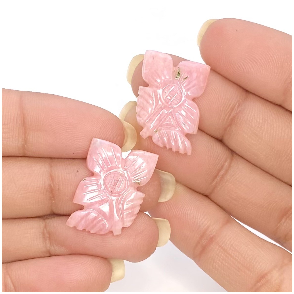 Buy This "AA+" Grade 20x14.5mm Carved Fancy Shape Natural Pink Opal (Un-Treated) Matched Gemstone Carvings Pair. You Will Receive 2 Pcs. With a Total Weight of 13.38 Cts.. This Pink Opal Stone is Originated From Australia and Masterfully Handcrafted by The Experienced Artisans of Jaipur (India).