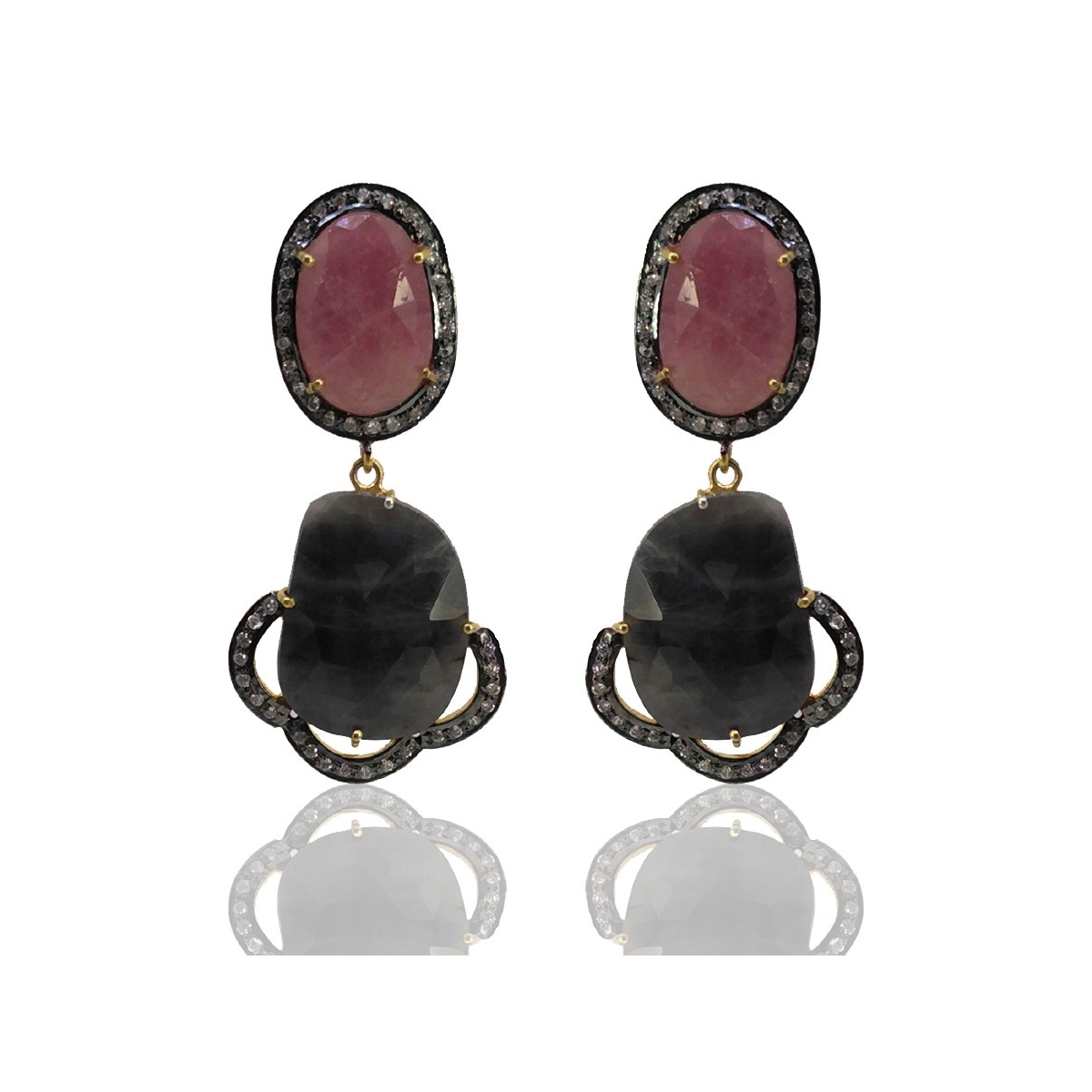 Multi Sapphire and Diamond White CZ 925 Sterling Silver Earring - This Vintage Style Yellow Gold & Black Rhodium Polished 925 Sterling Silver Earring is set with Irregular Shape Multi Sapphire and Diamond White CZ.