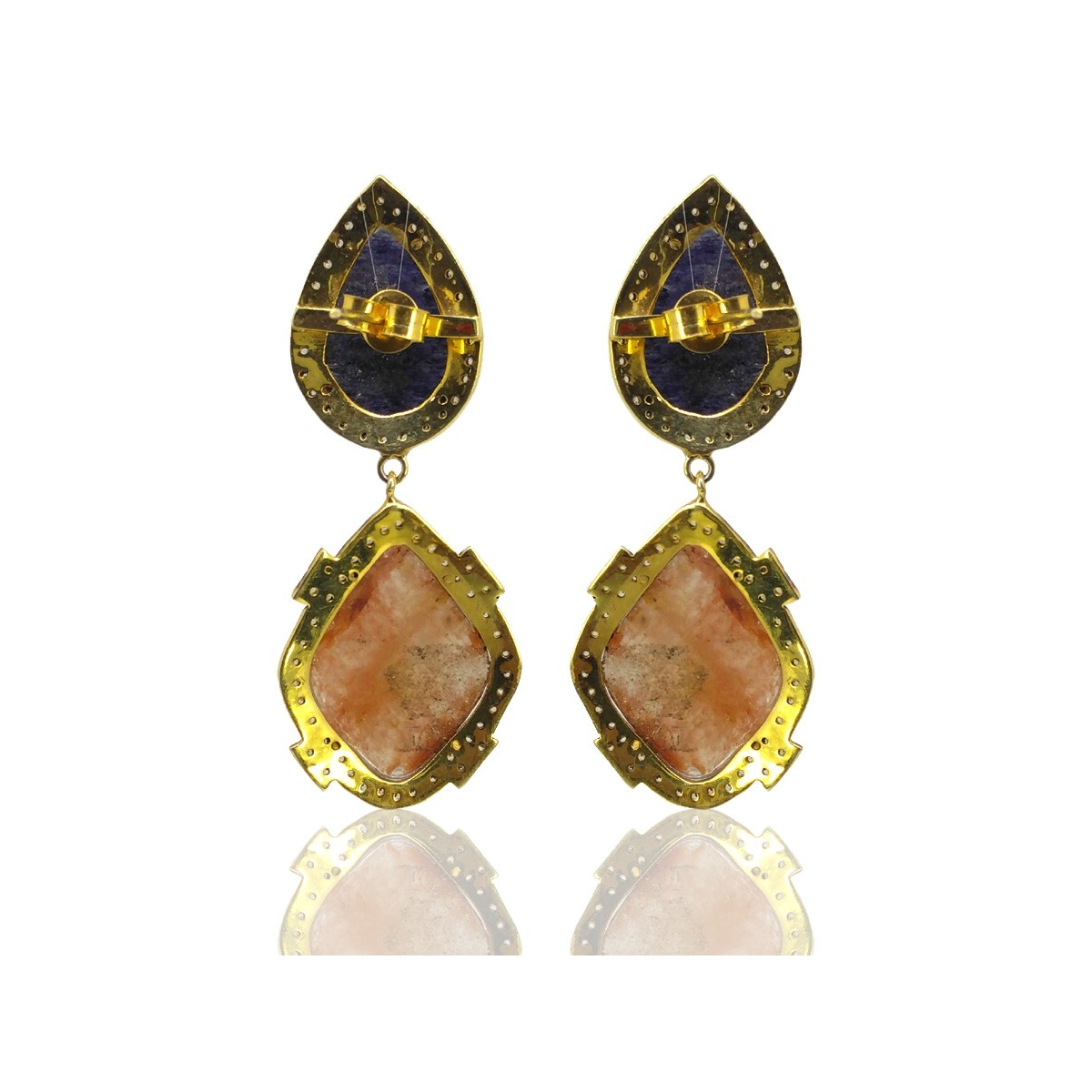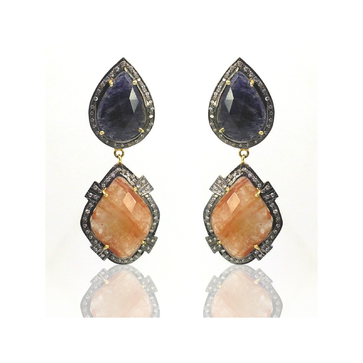 Multi Sapphire and Diamond White CZ 925 Sterling Silver Earring - This Vintage Style Yellow Gold & Black Rhodium Polished 925 Sterling Silver Earring is set with Irregular Shape Multi Sapphire and Diamond White CZ.
