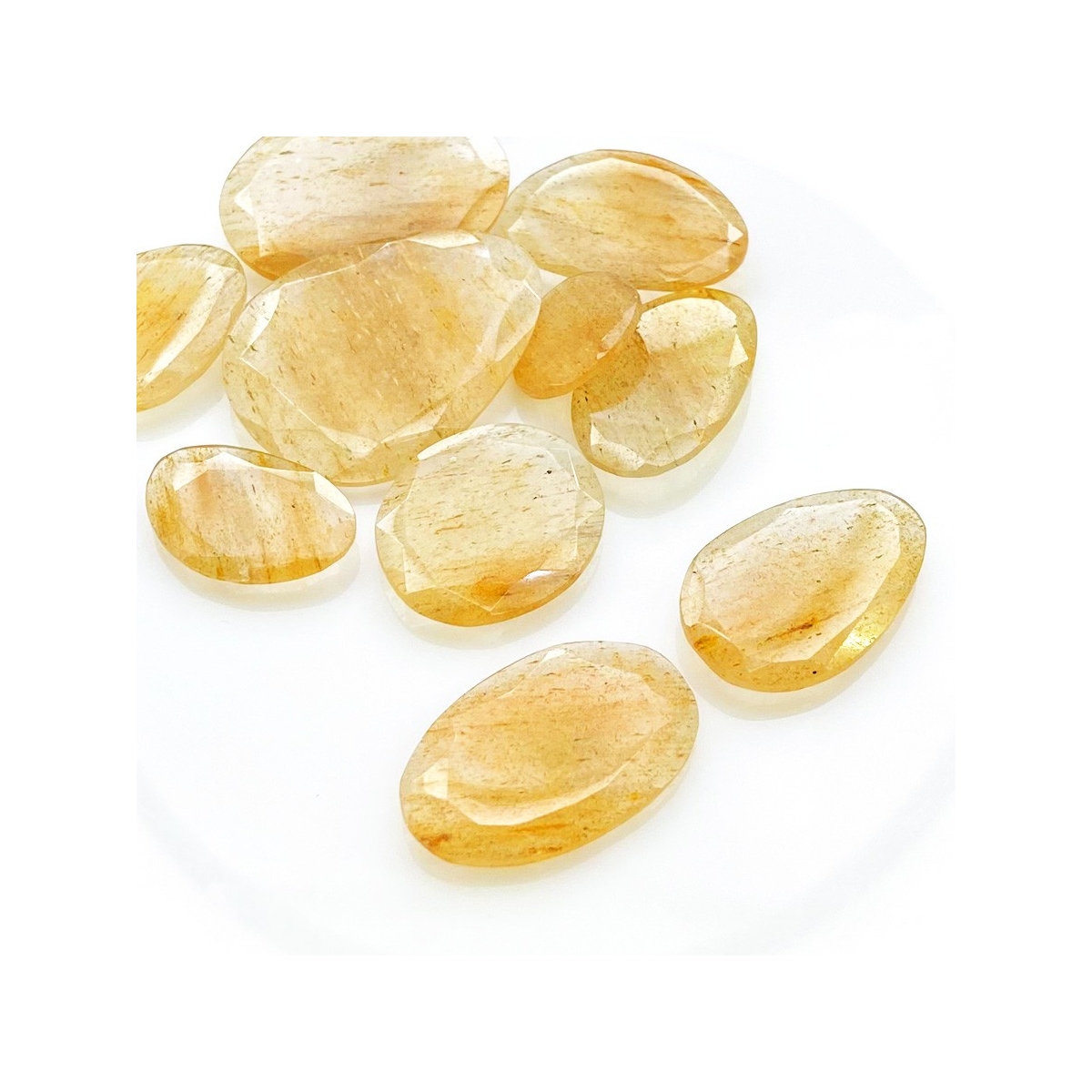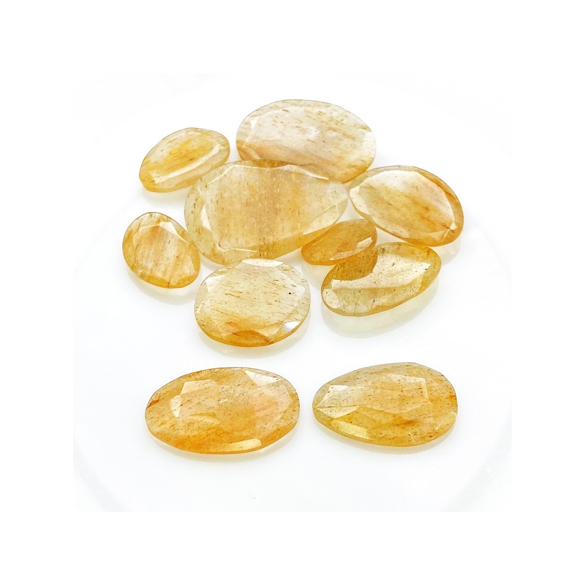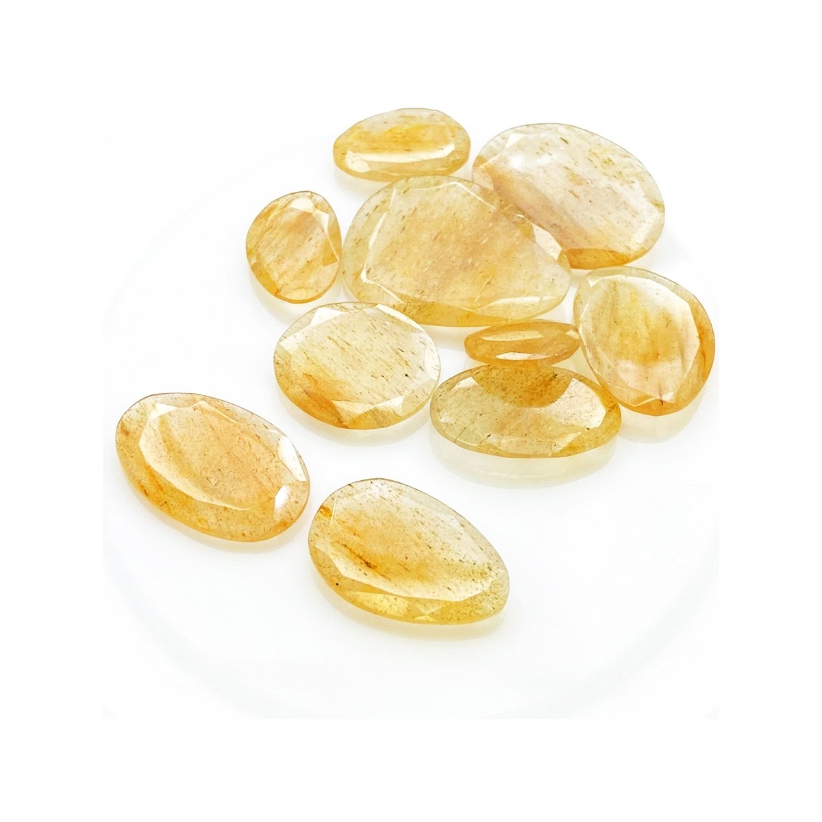 Buy This "AA" Grade 14-30mm Rose Cut Irregular Shape Natural Golden Rutile (Un-Treated) Gemstones Parcel. You Will Receive 10 Pcs. With a Total Weight of 100.65 carat. This Golden Rutile Stone is Originated From Brazil and Masterfully Handcrafted by The Experienced Artisans of Jaipur (India).