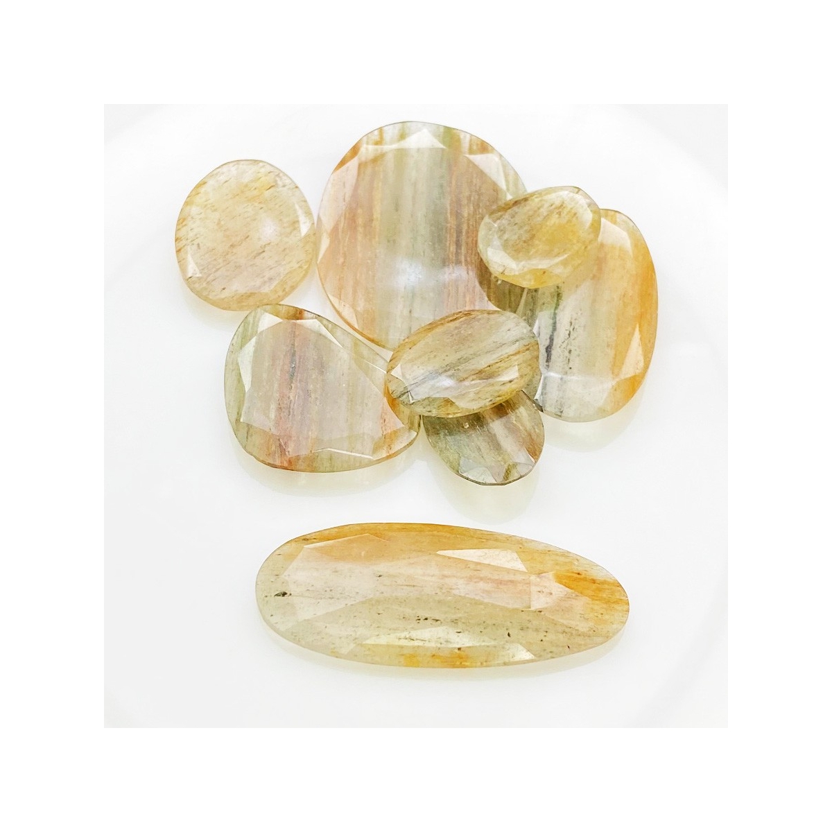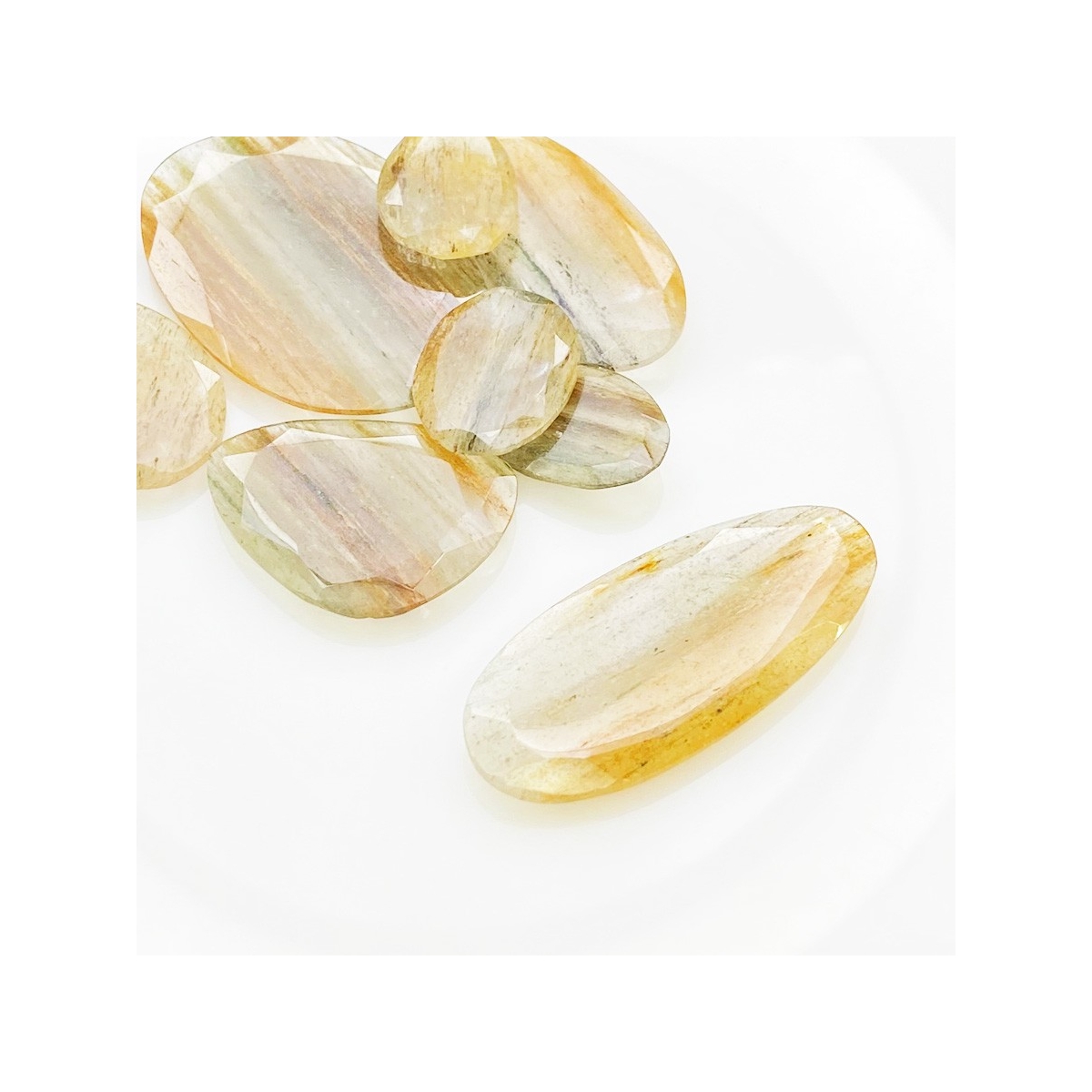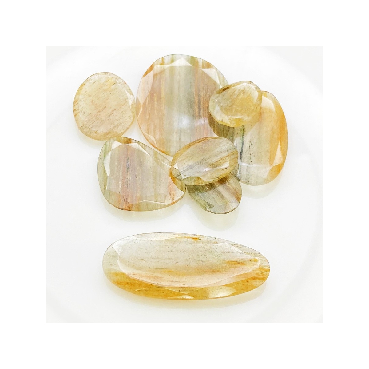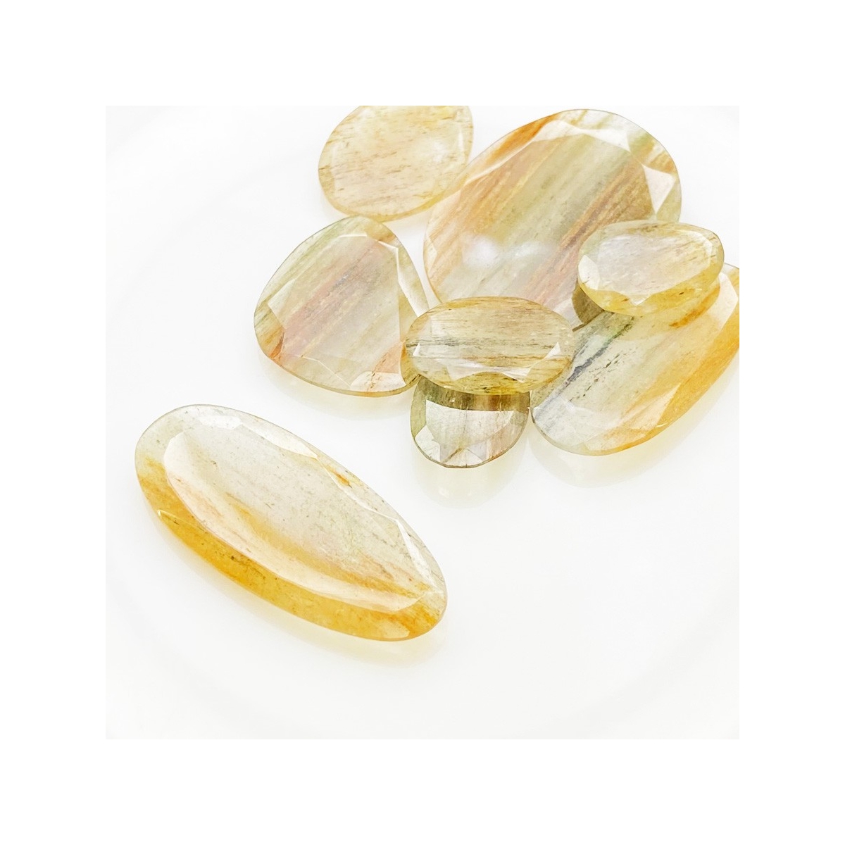 Buy This "AA" Grade 17.5-40mm Rose Cut Irregular Shape Natural Golden Rutile (Un-Treated) Gemstones Parcel. You Will Receive 8 Pcs. With a Total Weight of 110.9 Carat. This Golden Rutile Stone is Originated From Brazil and Masterfully Handcrafted by The Experienced Artisans of Jaipur (India).